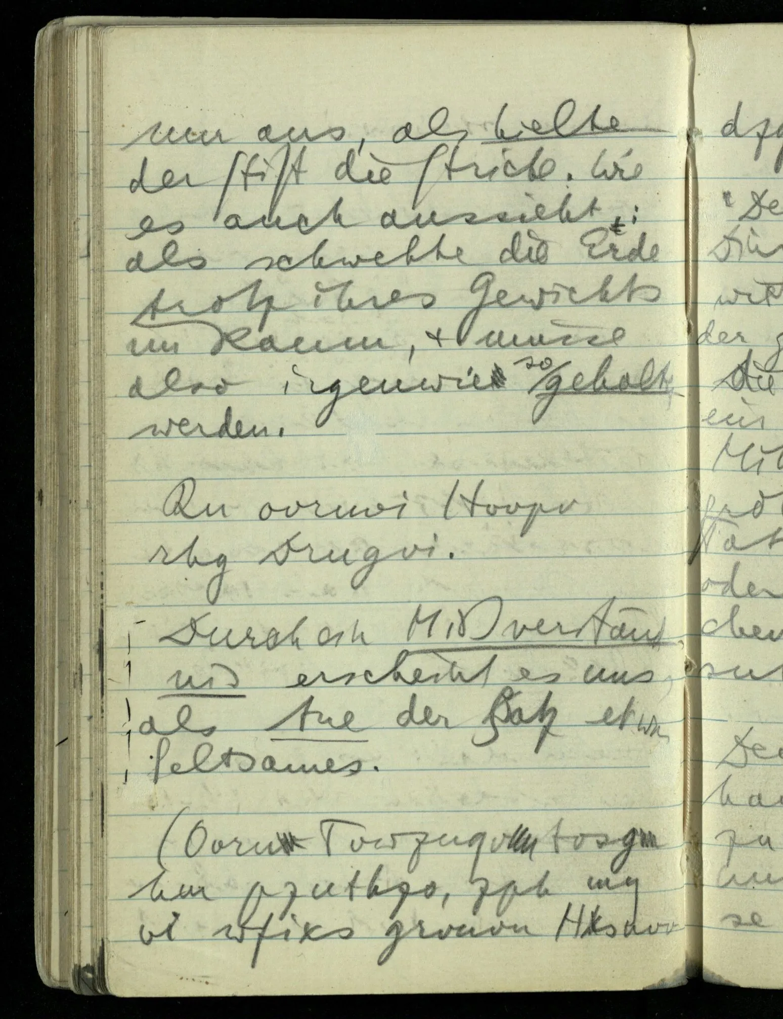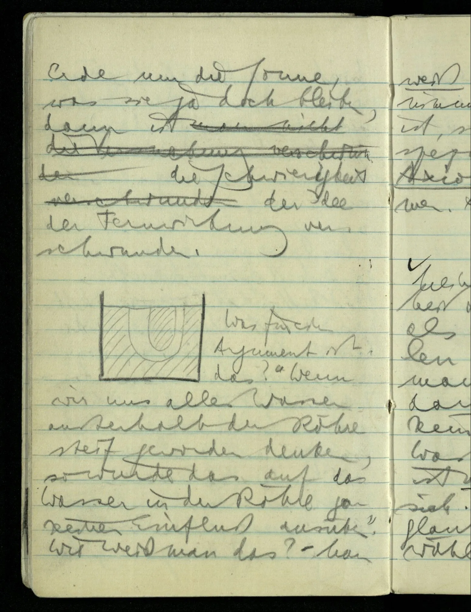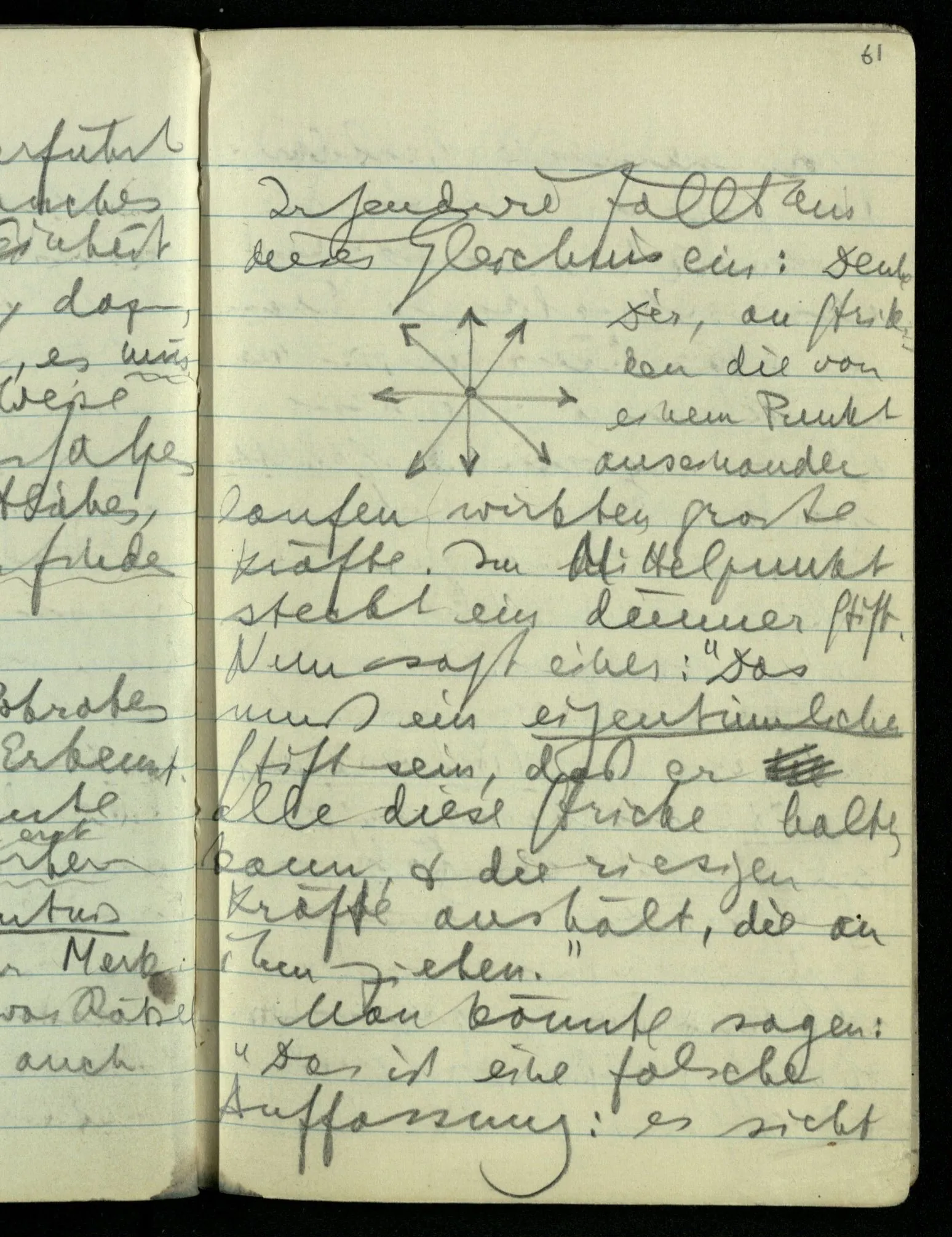 Im Mittelpunkt steht ein dünner Stift. Nun sagt einer: “Das muß ein eigentümlicher Stift sein, daß er alle diese Stricke halten kann, & die riesigen Kräfte aushält, die an ihm ziehen.” Man könnte sagen: “Das ist eine falsche Auffassung: es sieht nur aus, als hielte der Stift die Stricke. Wie es auch aussieht: als schwebte die Erde trotz ihres Gewichts im Raum, & müsse also irgendwie so gehalten werden.