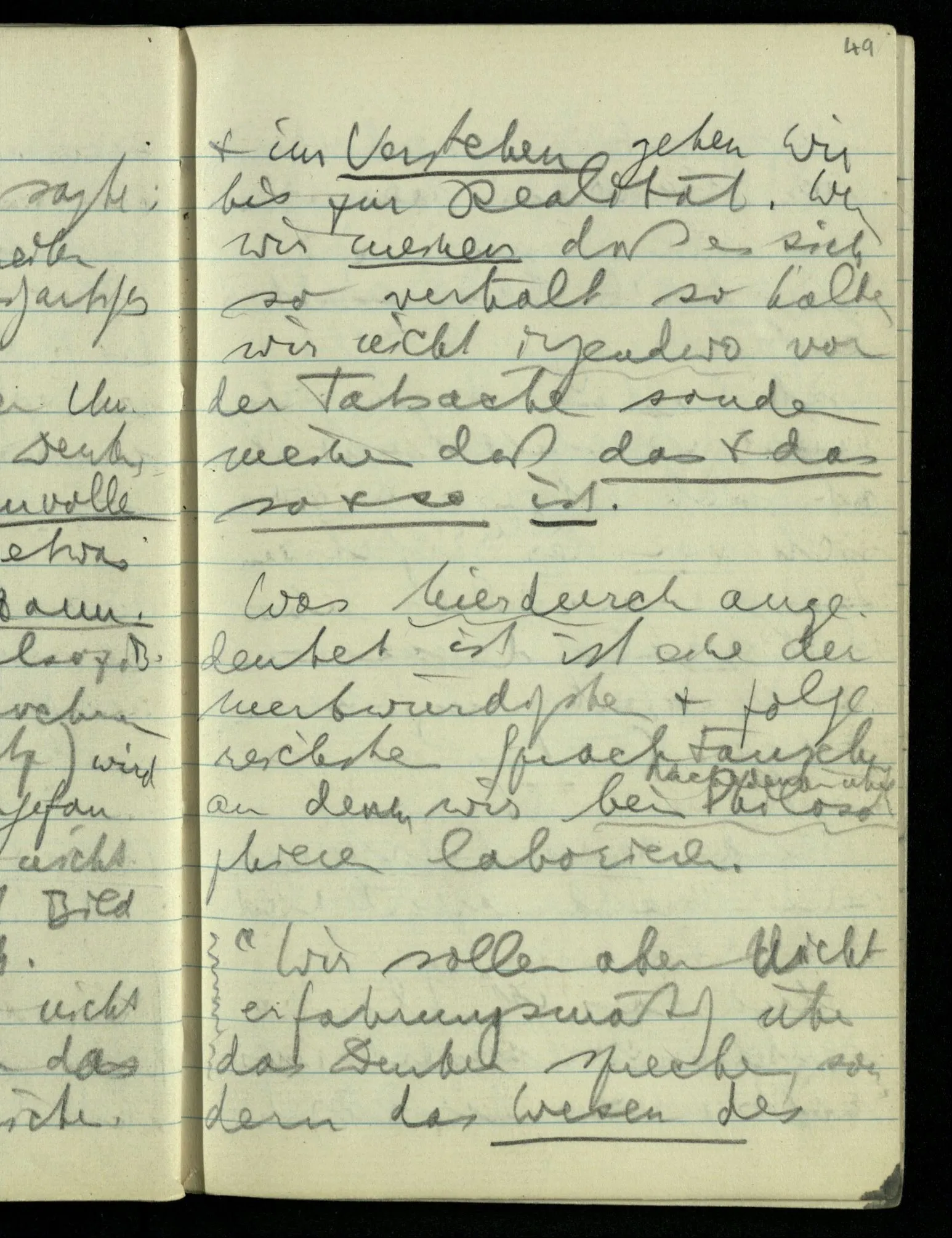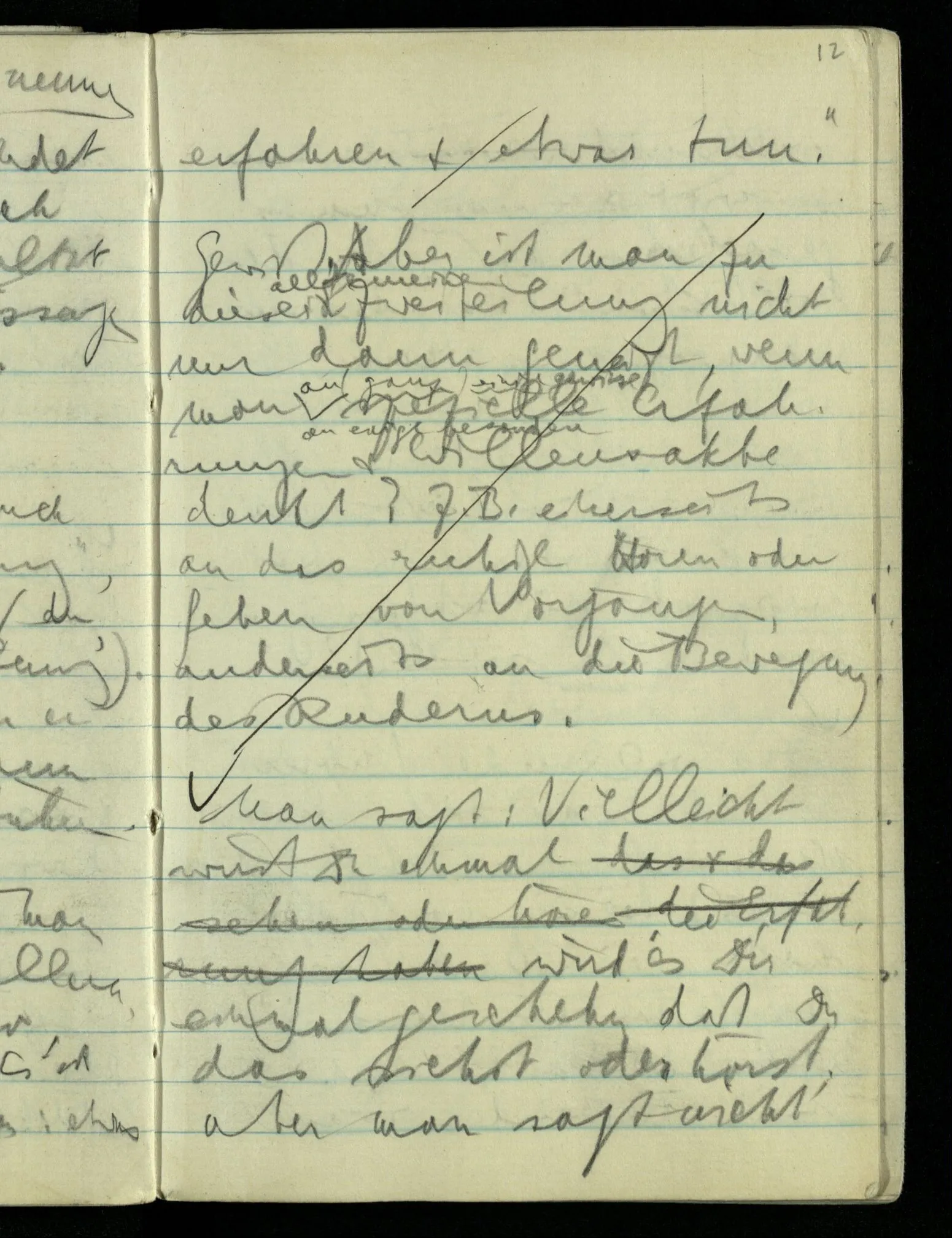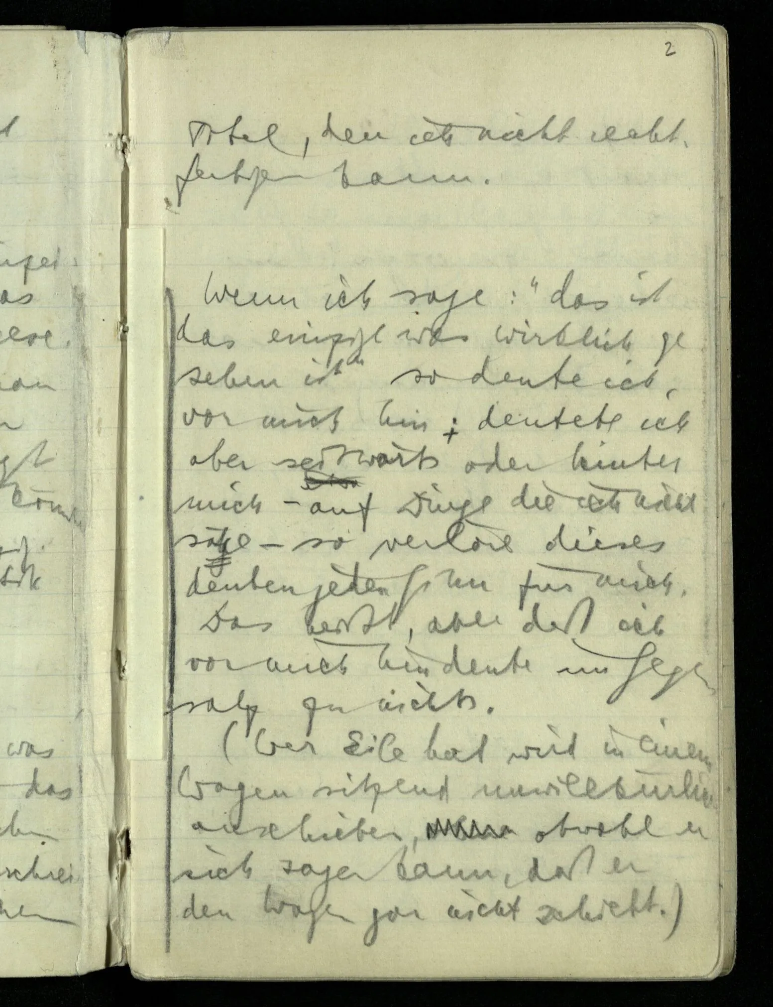 Wenn ich sage: “das ist das einzige was wirklich gesehen ist” so deute ich vor mich hin: deutete ich aber seitwärts oder hinter mich – auf Dinge die ich nicht sähe – so verlöre dieses Deuten jeden Sinn für mich. Das heißt aber, daß ich vor mich hindeute im Gegensatz zu nichts. (Wer Eile hat wird in einem Wagen sitzend unwillkürlich anschieben, obwohl er sich sagen kann, daß er den Wagen gar nicht schiebt.)