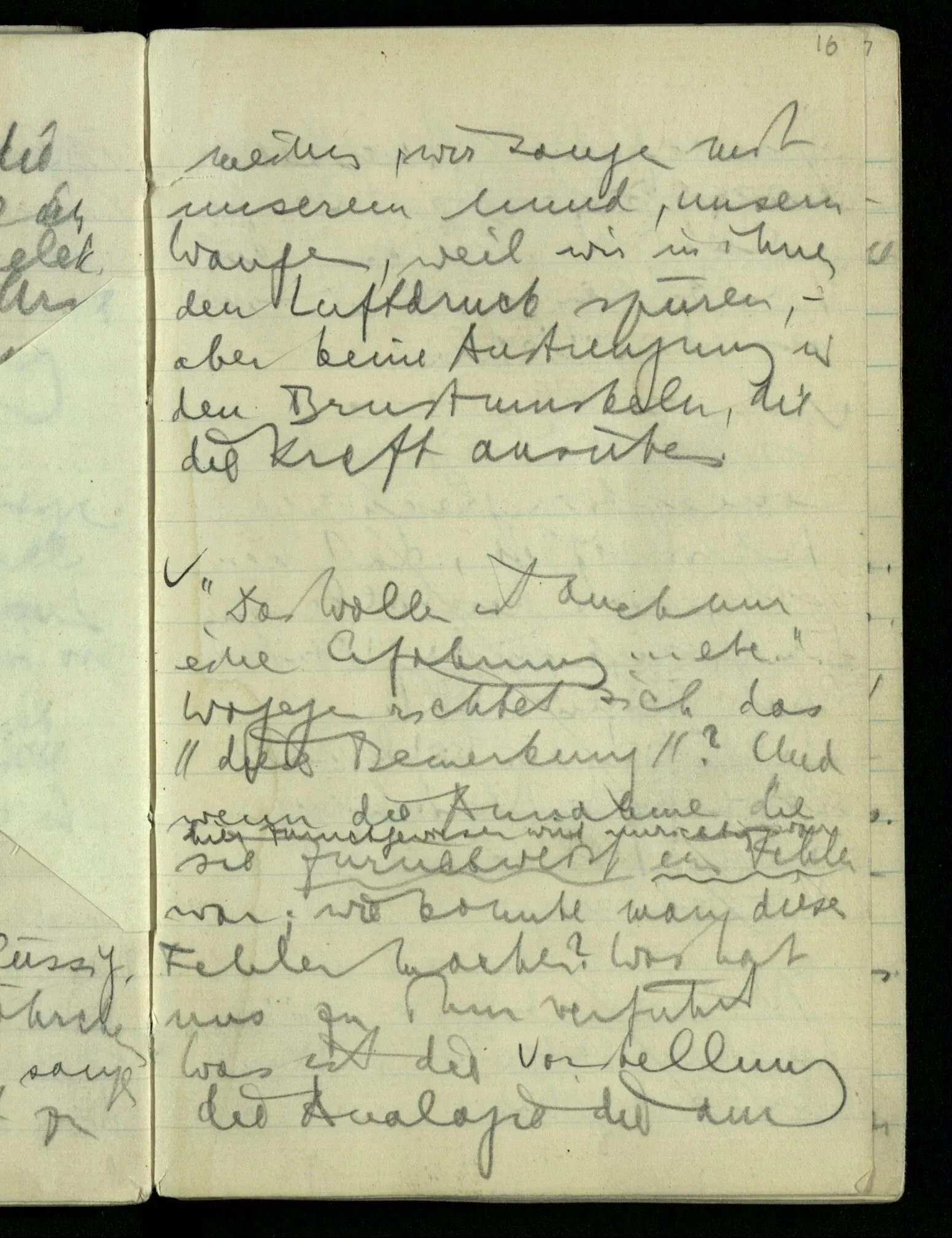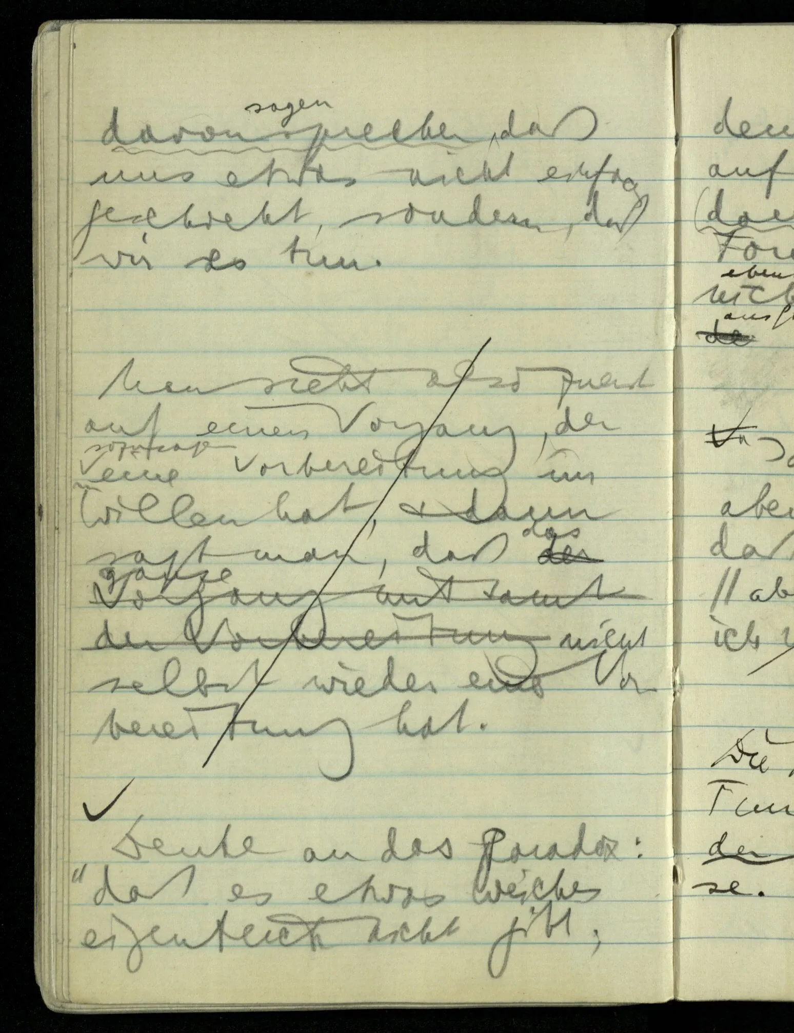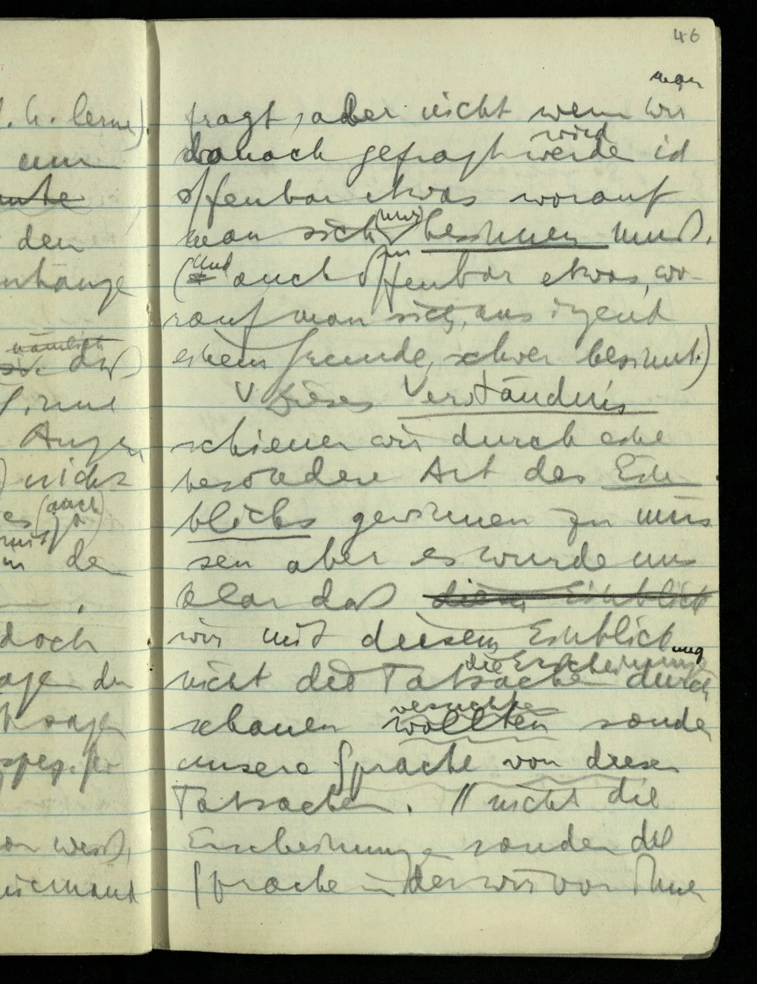 Wenn ich sage: “das ist das einzige was wirklich gesehen ist” so deute ich vor mich hin: deutete ich aber seitwärts oder hinter mich – auf Dinge die ich nicht sähe – so verlöre dieses Deuten jeden Sinn für mich. Das heißt aber, daß ich vor mich hindeute im Gegensatz zu nichts. (Wer Eile hat wird in einem Wagen sitzend unwillkürlich anschieben, obwohl er sich sagen kann, daß er den Wagen gar nicht schiebt.)