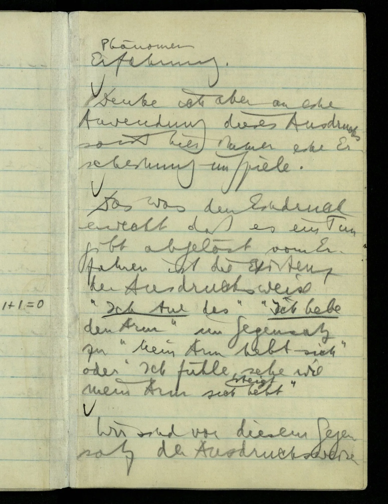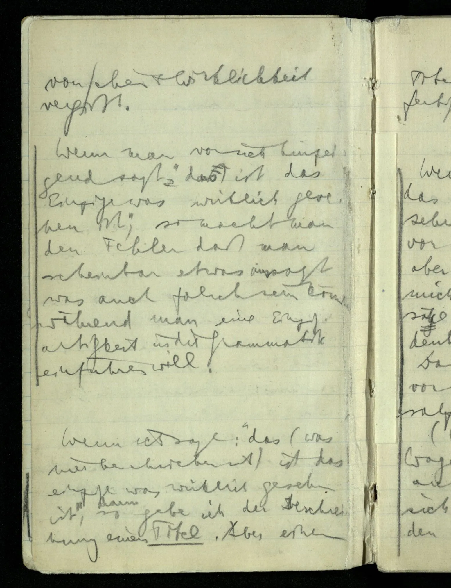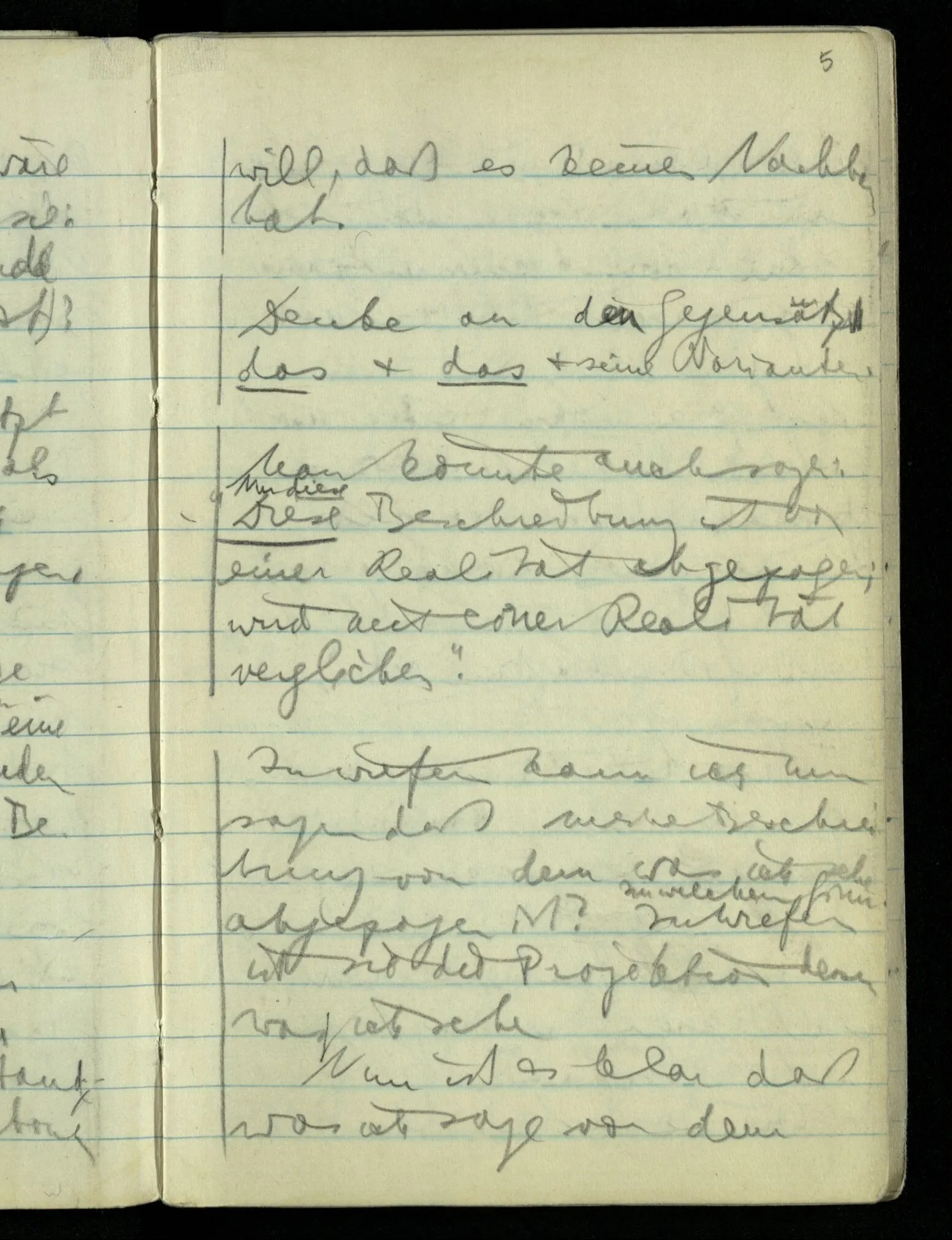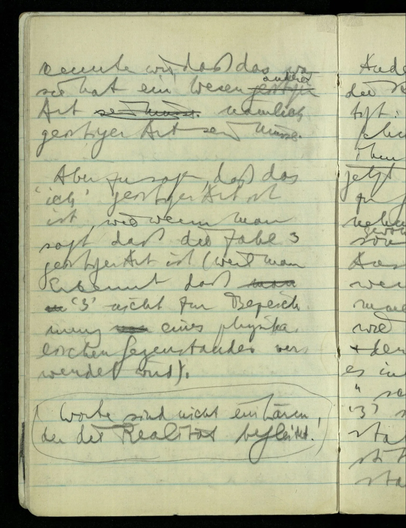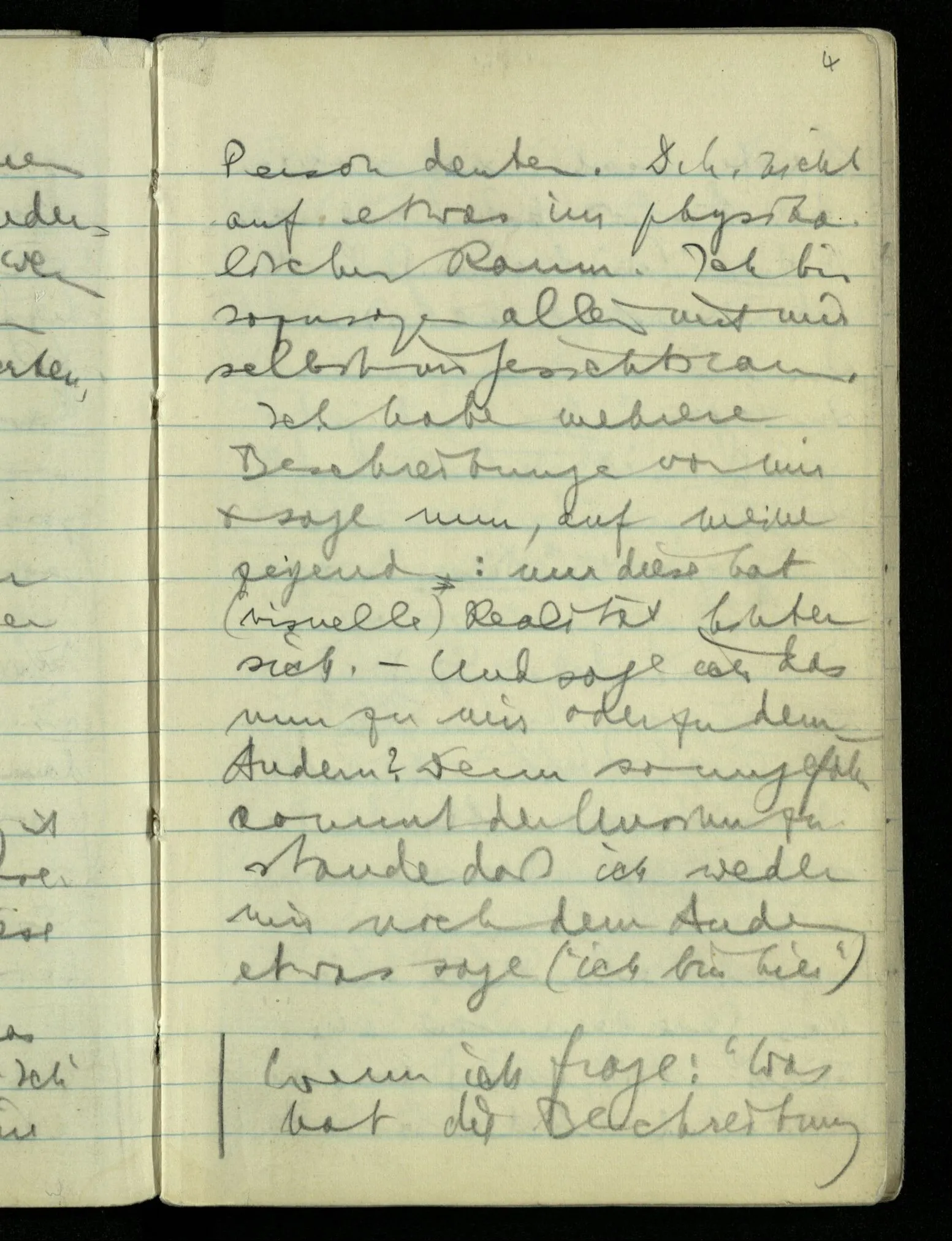 “Nur diese Beschreibung ist eine Beschreibung des Gesehenen”: wie kann ich diese Aussage rechtfertigen? Nun ich sehe nur das & das! Aber ferner das ‘Ich’ soll hier nicht auf eine Person deuten. D.h. nicht auf etwas im physikalischen Raum. Ich bin sozusagen allein mit mir selbst im Gesichtsraum. Ich habe mehrere Beschreibungen vor mir & sage nun, auf meine zeigend: nur diese hat (visuelle) Realität hinter sich. – Und sage ich das nun zu mir oder zu dem Andern? Denn so ungefähr kommt der Unsinn zustande daß ich weder mir noch dem Andern etwas sage (“ich bin hier”).
