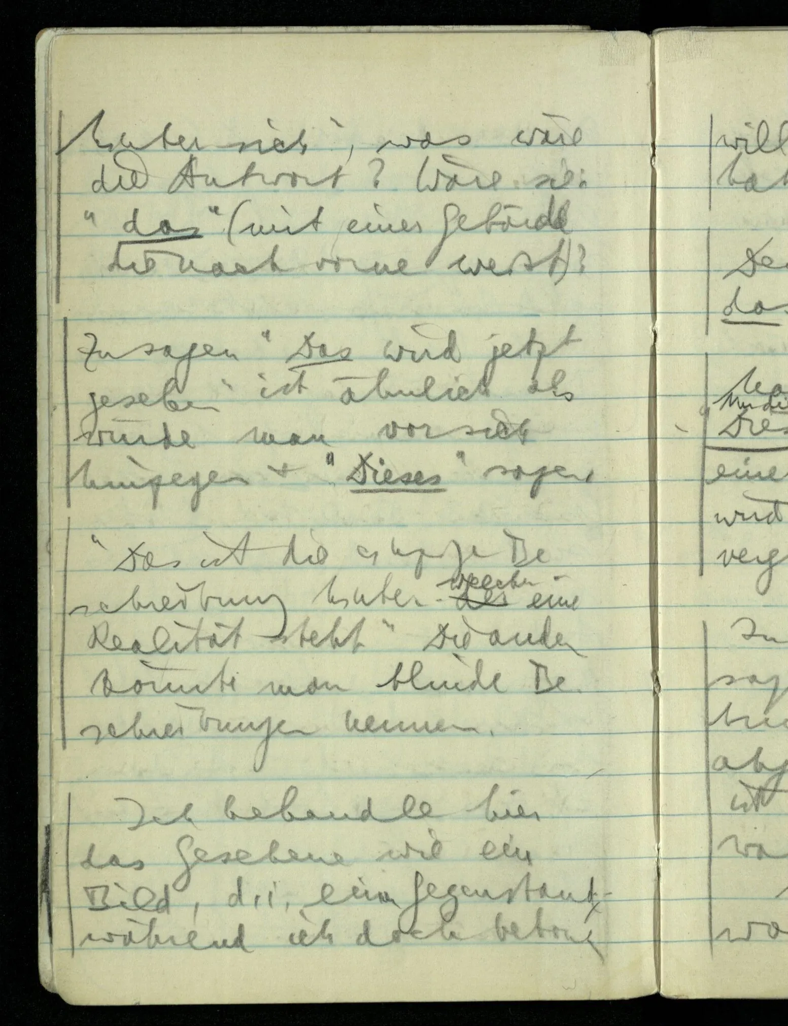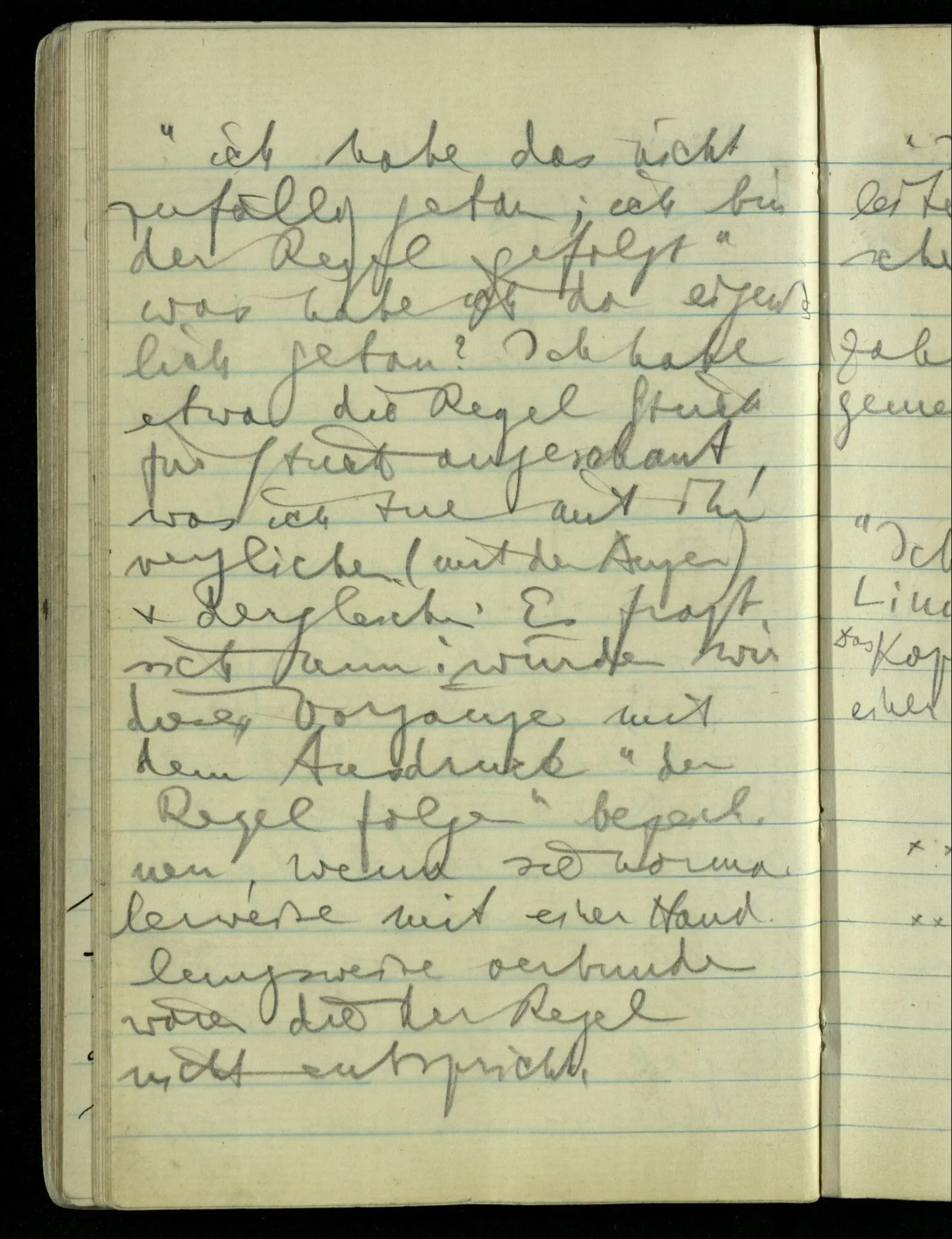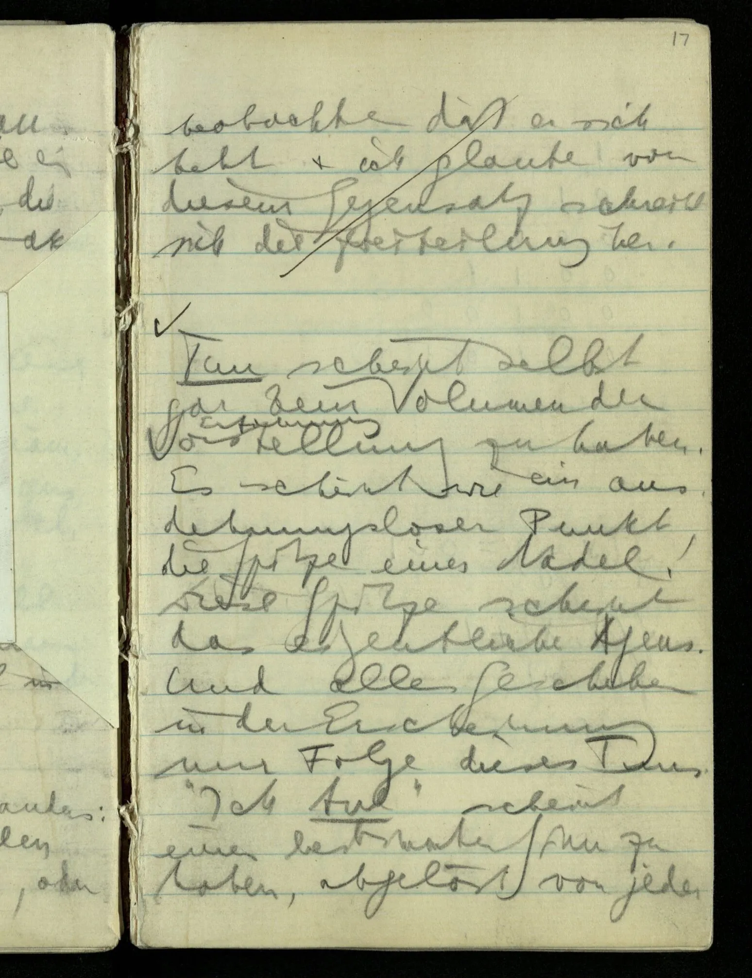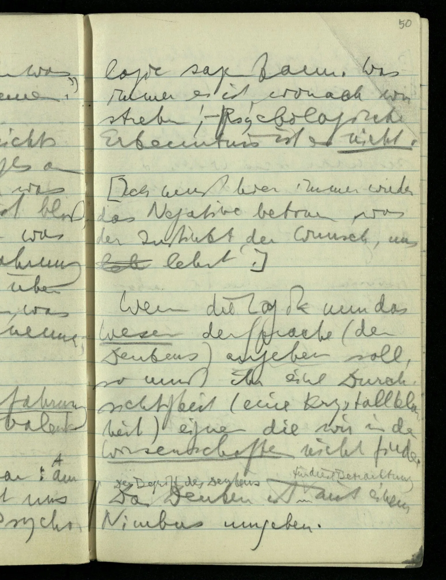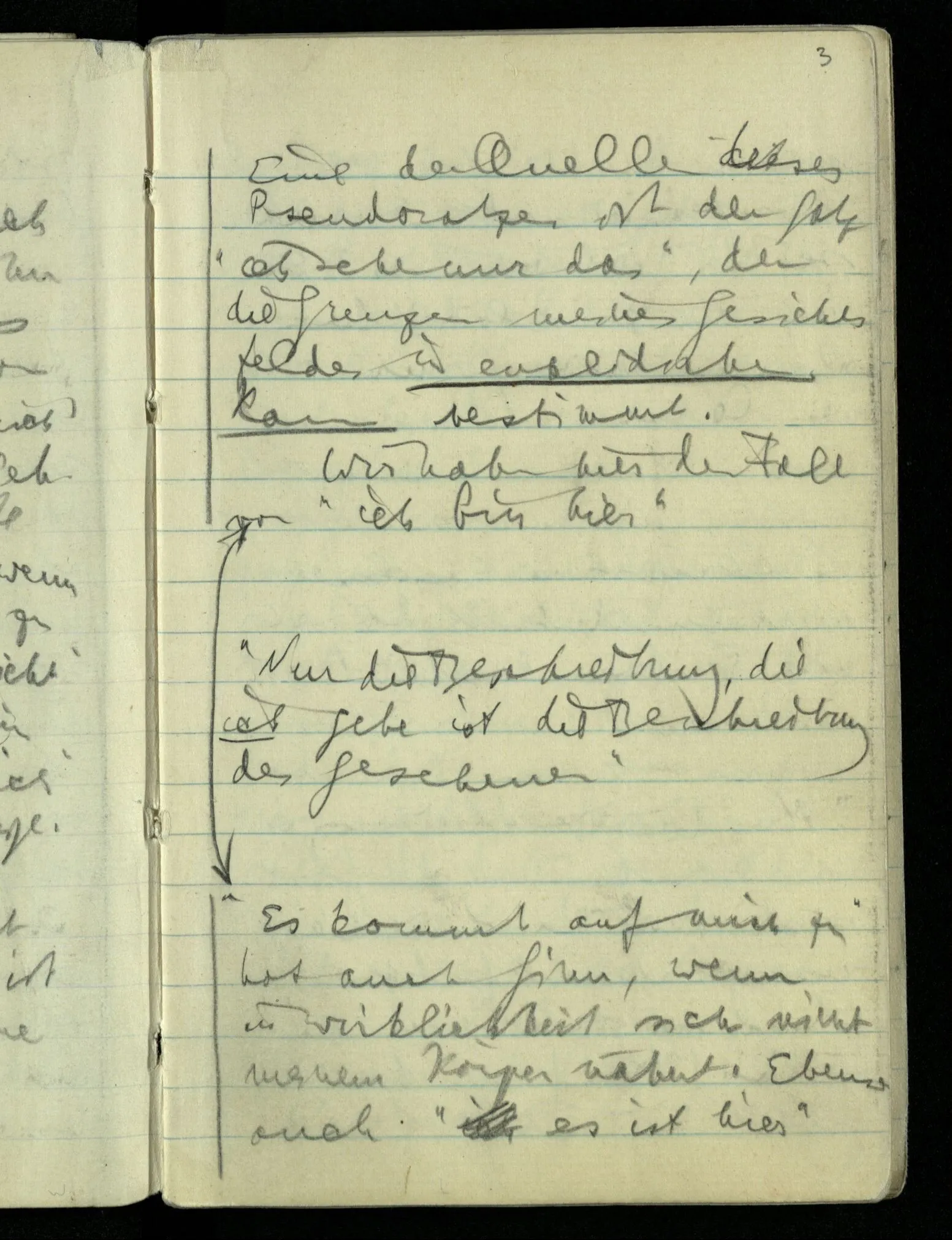 “Nur diese Beschreibung ist eine Beschreibung des Gesehenen”: wie kann ich diese Aussage rechtfertigen? Nun ich sehe nur das & das! Aber ferner das ‘Ich’ soll hier nicht auf eine Person deuten. D.h. nicht auf etwas im physikalischen Raum. Ich bin sozusagen allein mit mir selbst im Gesichtsraum. Ich habe mehrere Beschreibungen vor mir & sage nun, auf meine zeigend: nur diese hat (visuelle) Realität hinter sich. – Und sage ich das nun zu mir oder zu dem Andern? Denn so ungefähr kommt der Unsinn zustande daß ich weder mir noch dem Andern etwas sage (“ich bin hier”).