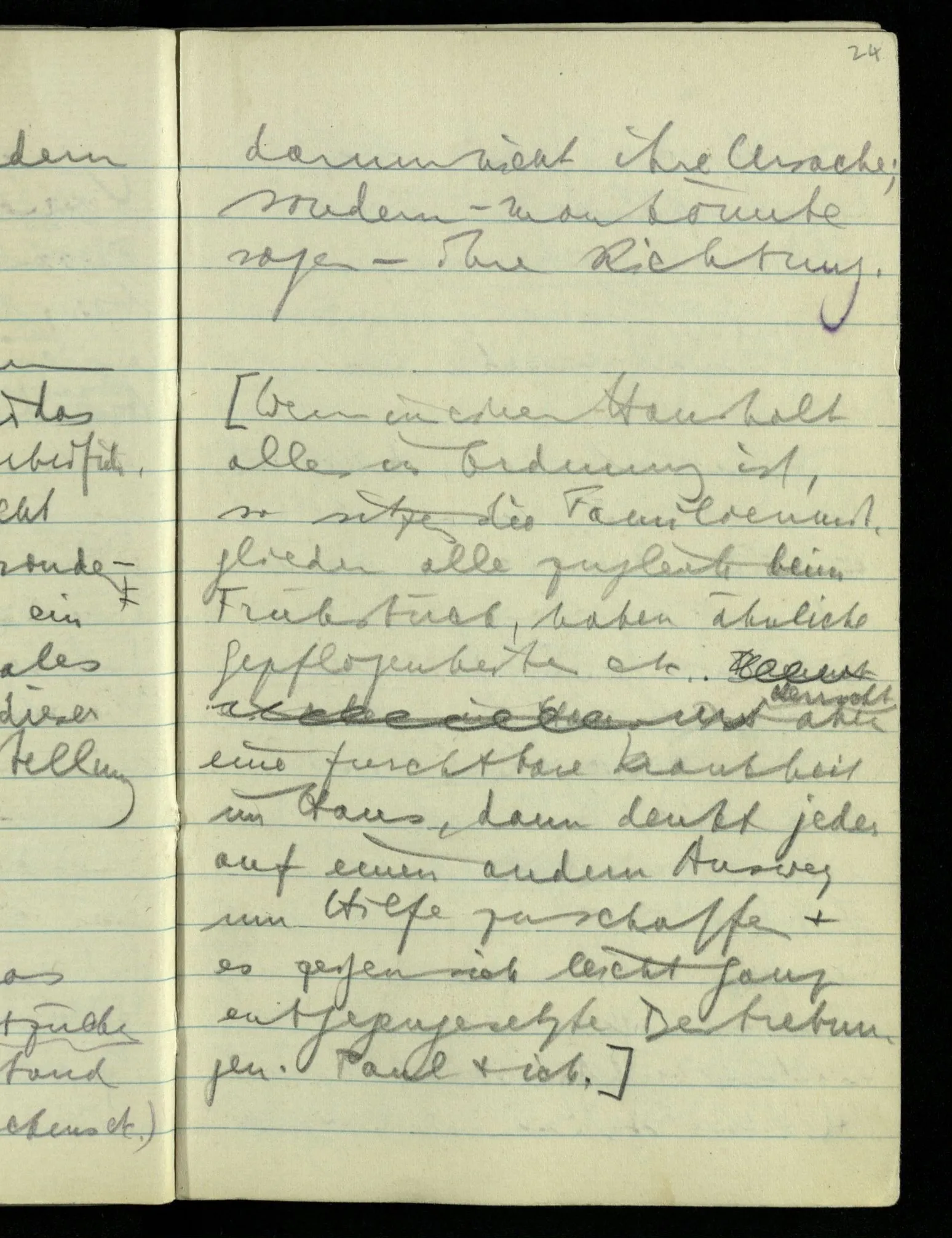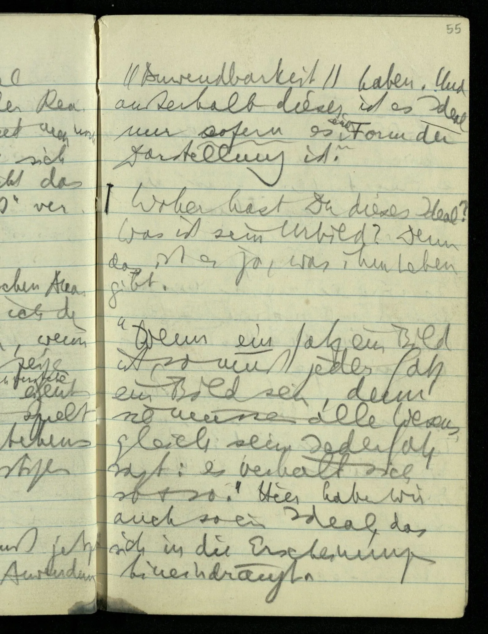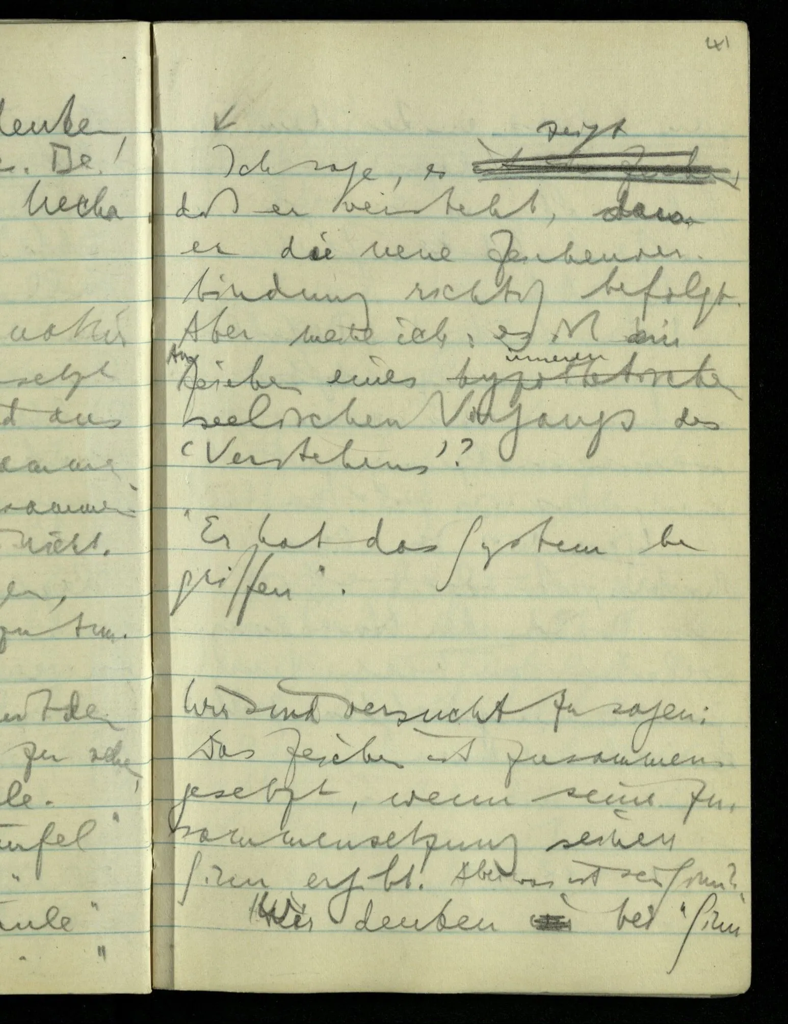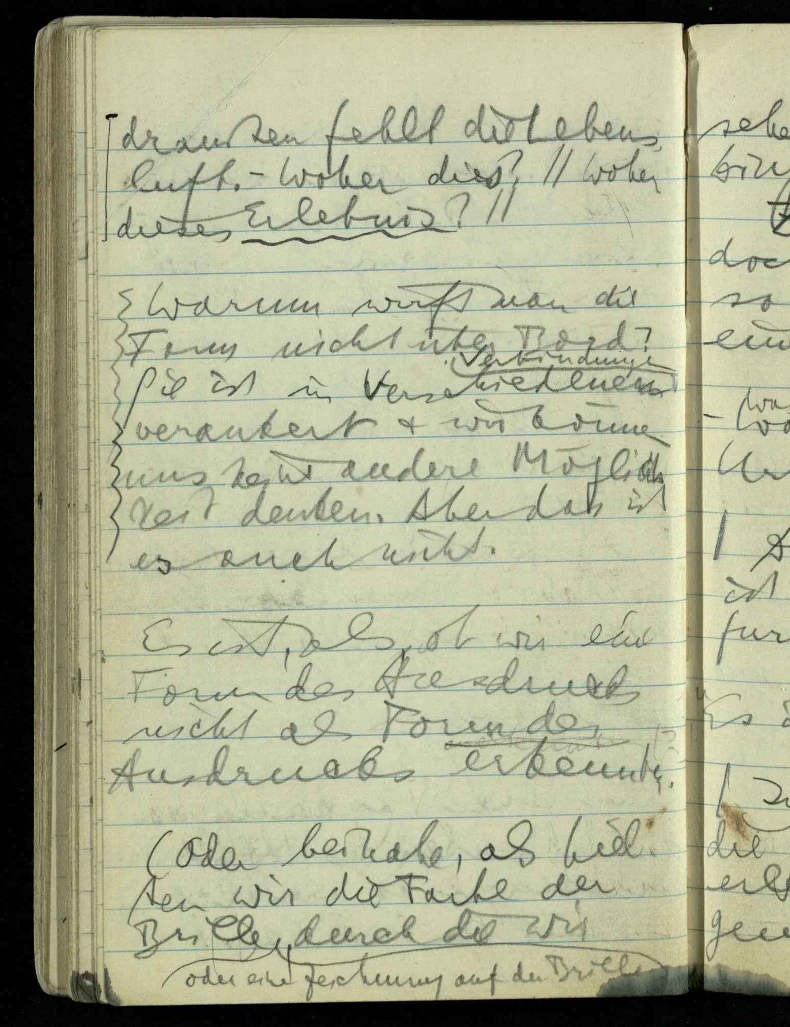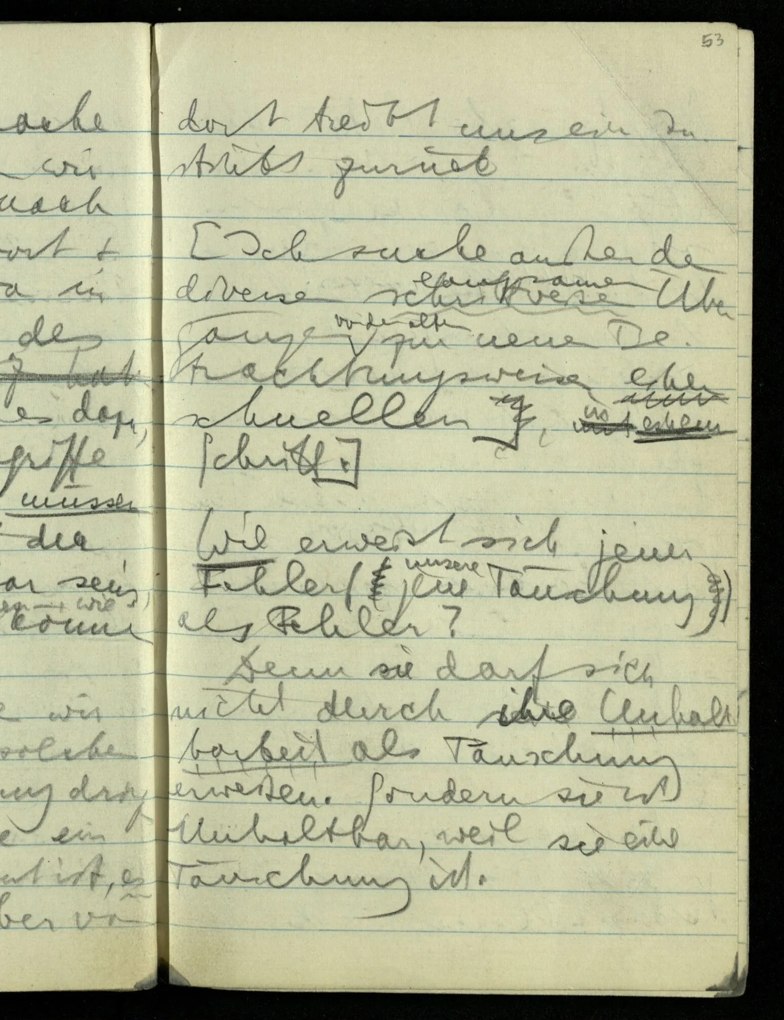 “Nur diese Beschreibung ist eine Beschreibung des Gesehenen”: wie kann ich diese Aussage rechtfertigen? Nun ich sehe nur das & das! Aber ferner das ‘Ich’ soll hier nicht auf eine Person deuten. D.h. nicht auf etwas im physikalischen Raum. Ich bin sozusagen allein mit mir selbst im Gesichtsraum. Ich habe mehrere Beschreibungen vor mir & sage nun, auf meine zeigend: nur diese hat (visuelle) Realität hinter sich. – Und sage ich das nun zu mir oder zu dem Andern? Denn so ungefähr kommt der Unsinn zustande daß ich weder mir noch dem Andern etwas sage (“ich bin hier”).