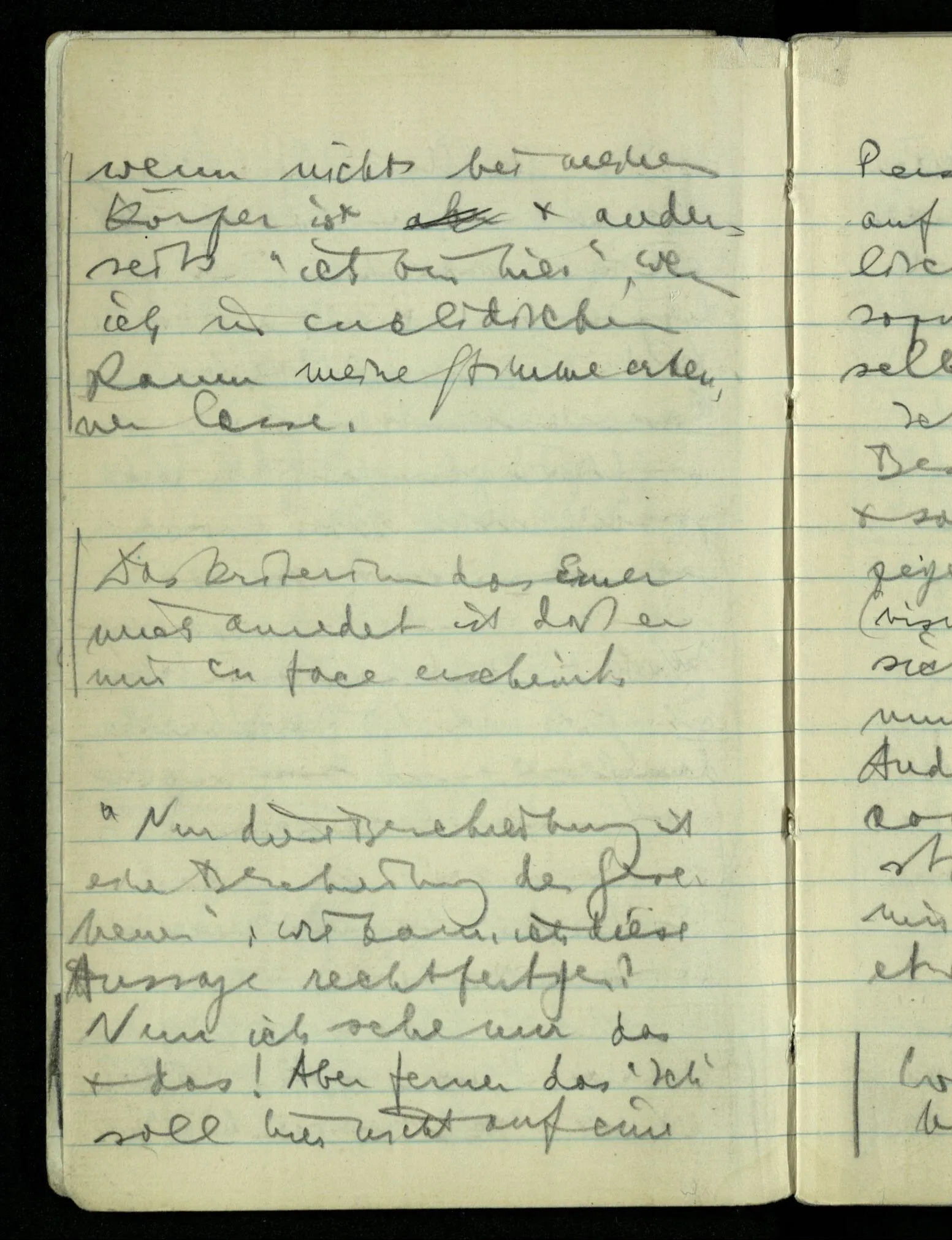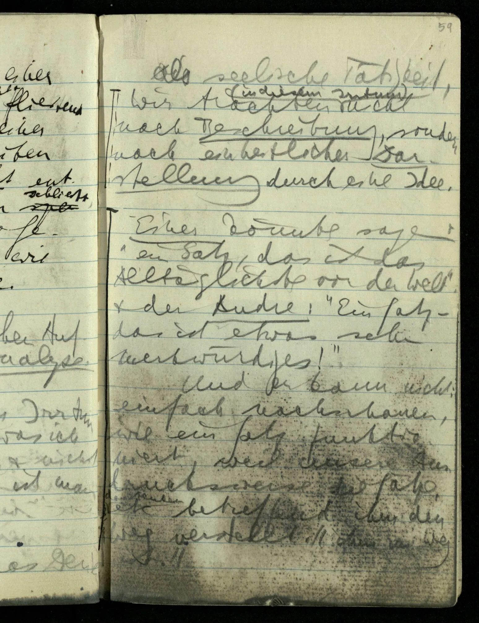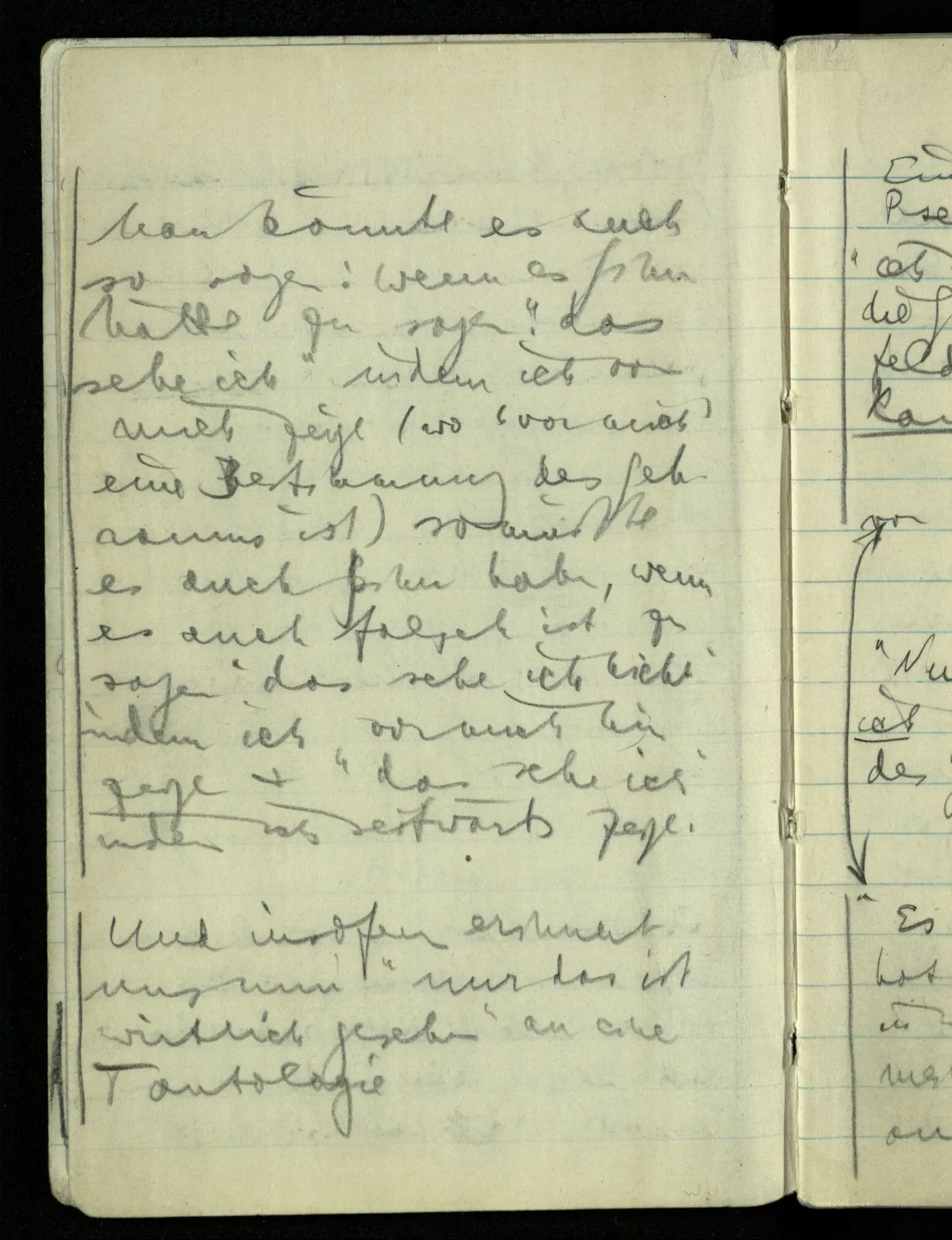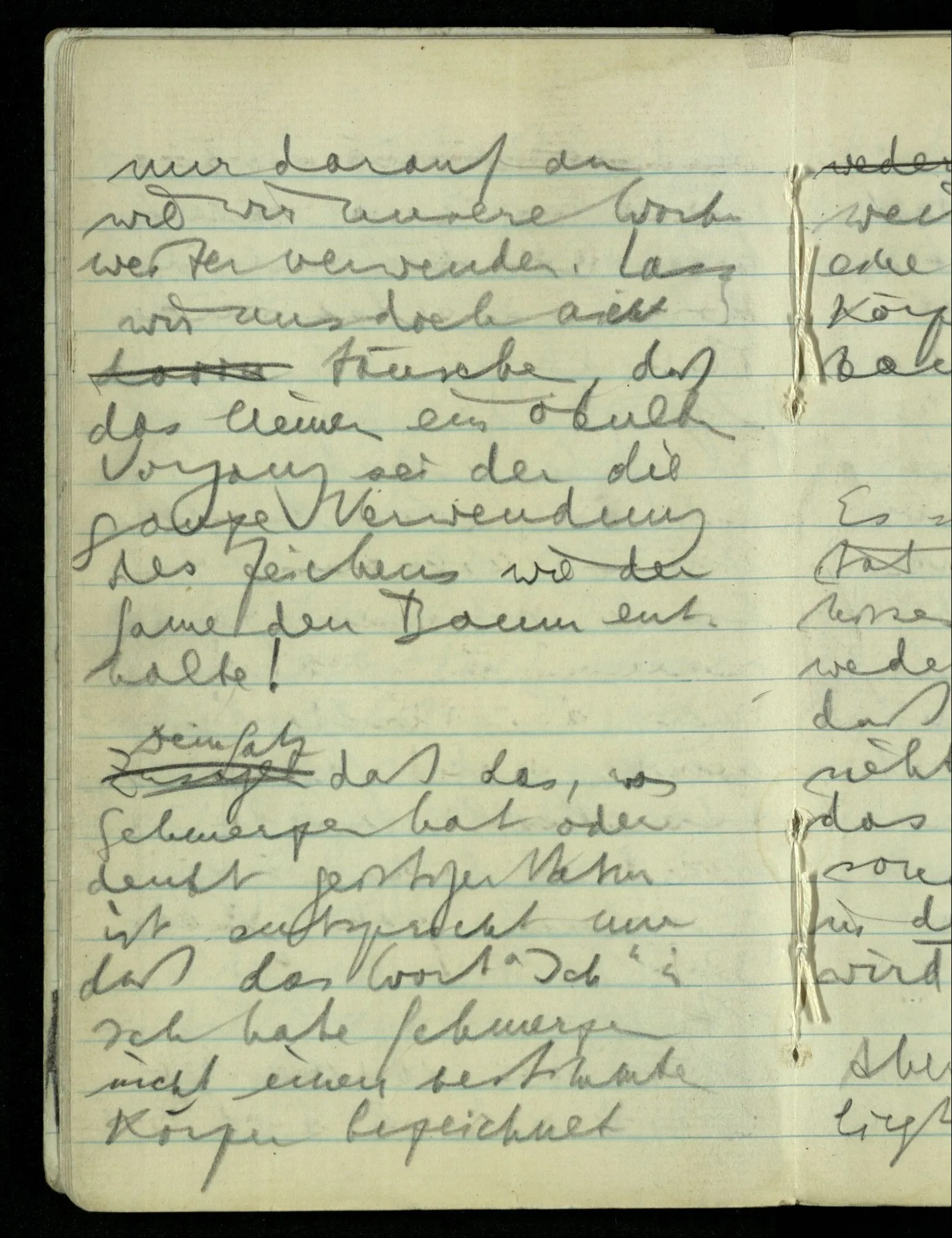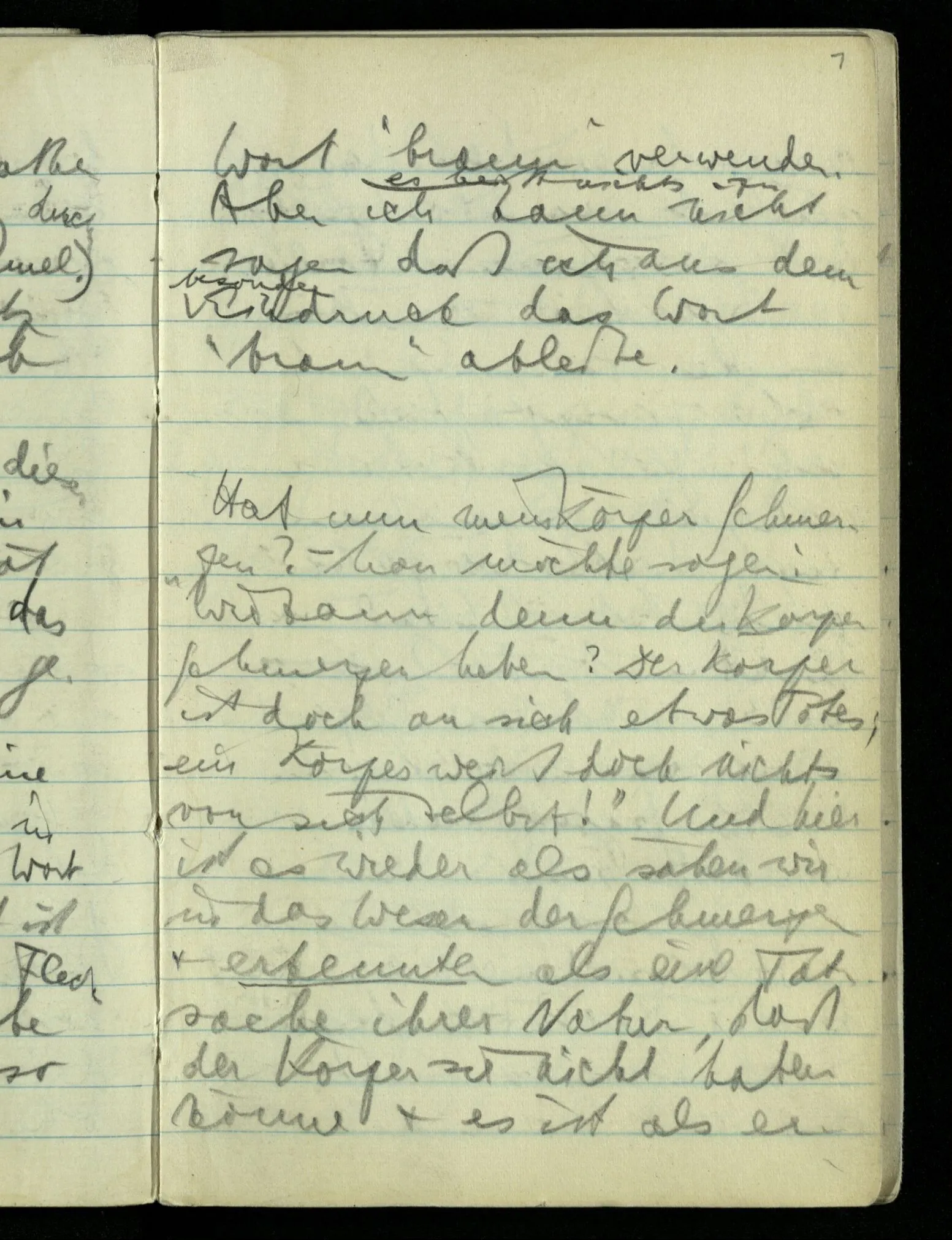 Hat nun mein Körper Schmerzen? – Man möchte sagen: “Wie kann denn der Körper Schmerzen haben? Der Körper ist doch an sich etwas Totes; ein Körper weiß doch nichts von sich selbst!” Und hier ist es wieder als sähen wir in das Wesen der Schmerzen & erkennten als eine Tatsache ihrer Natur, daß der Körper sie nicht haben könne & es ist als erkennten wir, daß das was sie hat ein Wesen anderer Art nämlich geistiger Art sein müsse.