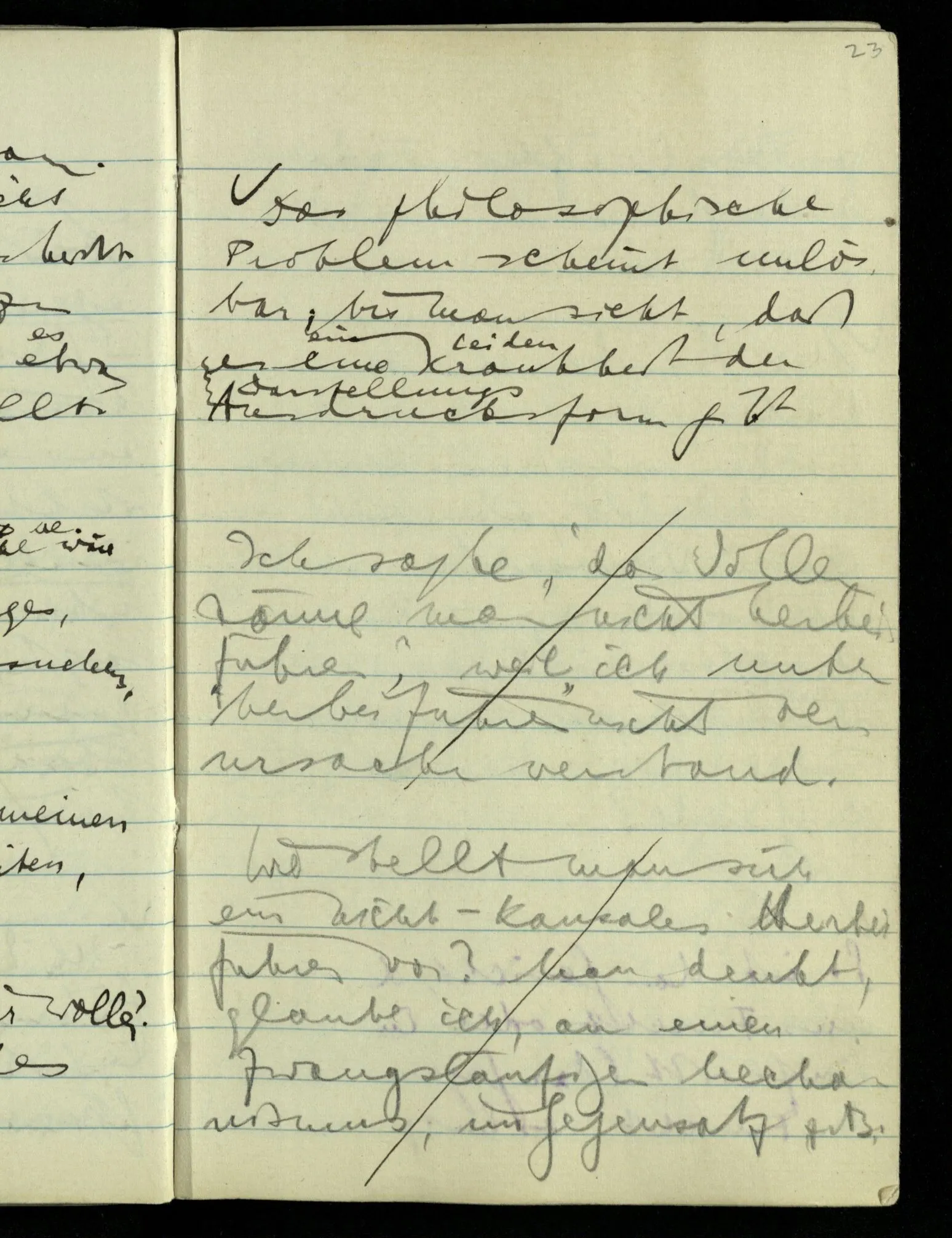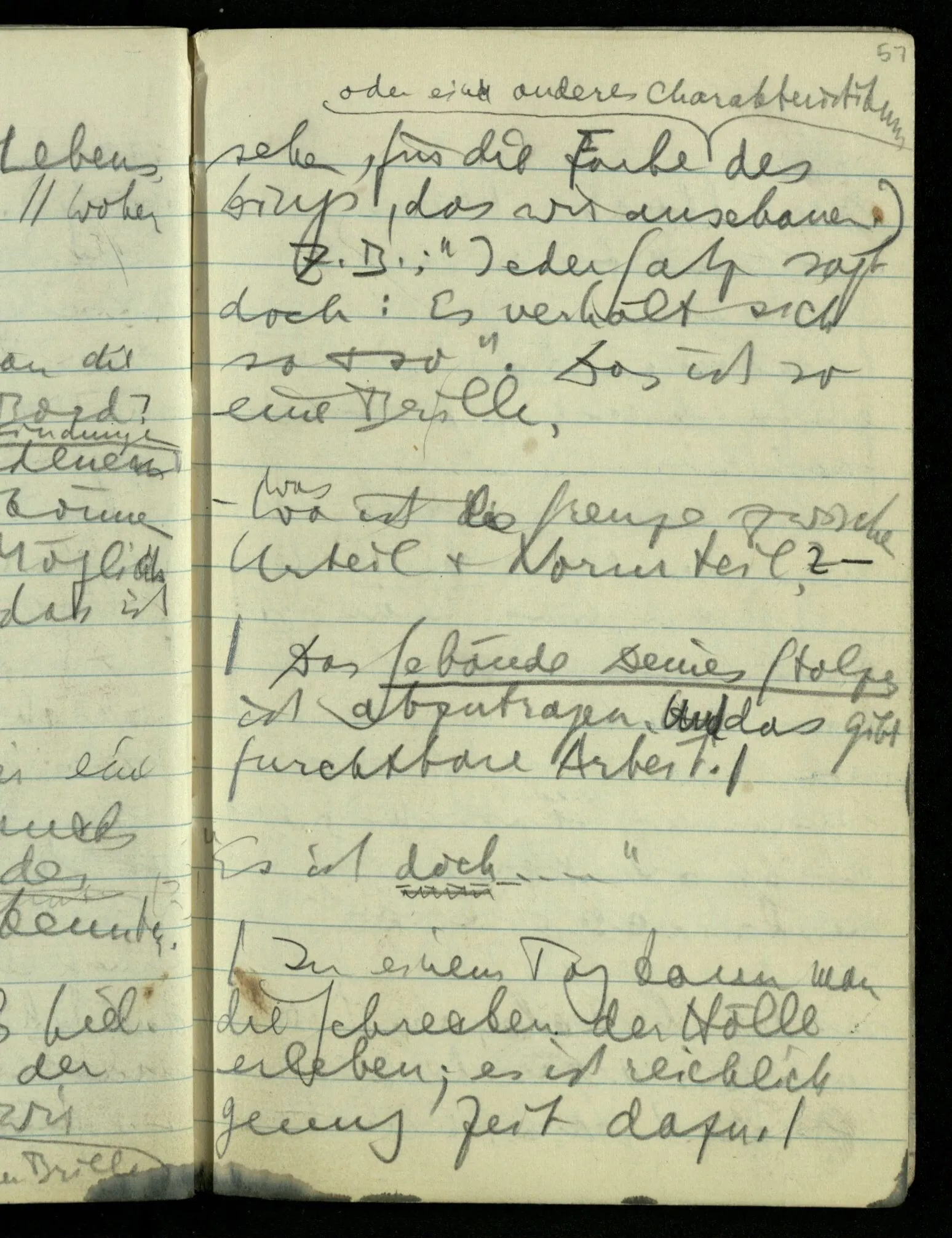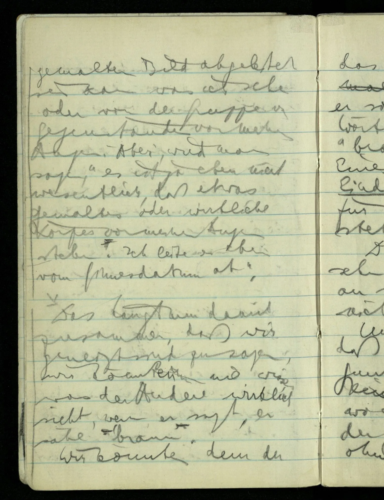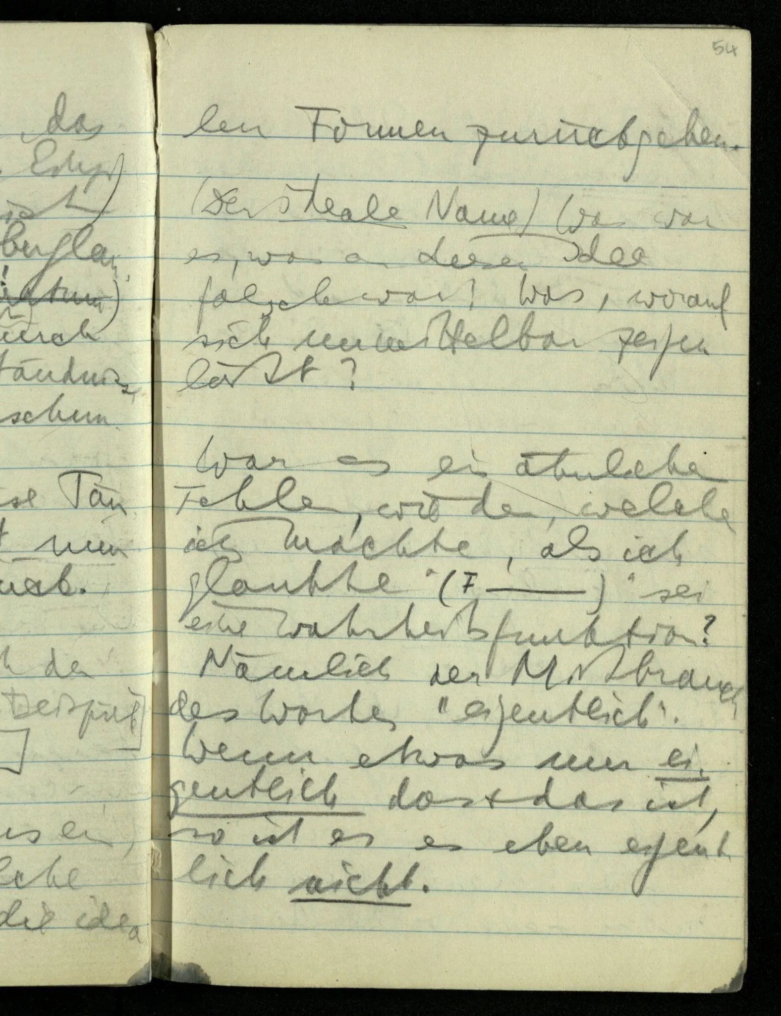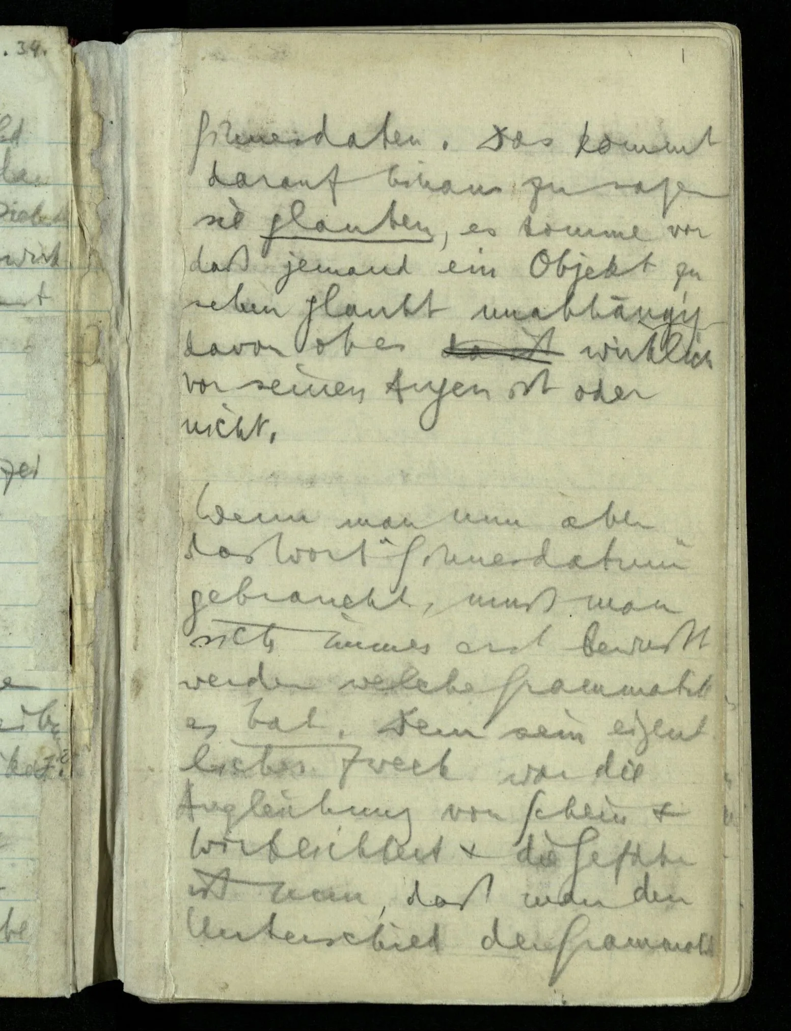 Hat nun mein Körper Schmerzen? – Man möchte sagen: “Wie kann denn der Körper Schmerzen haben? Der Körper ist doch an sich etwas Totes; ein Körper weiß doch nichts von sich selbst!” Und hier ist es wieder als sähen wir in das Wesen der Schmerzen & erkennten als eine Tatsache ihrer Natur, daß der Körper sie nicht haben könne & es ist als erkennten wir, daß das was sie hat ein Wesen anderer Art nämlich geistiger Art sein müsse.