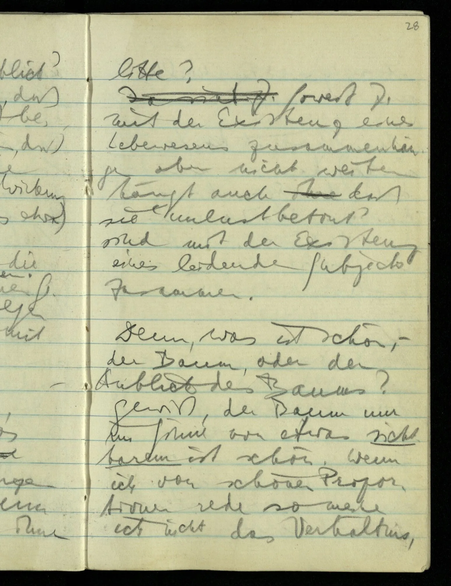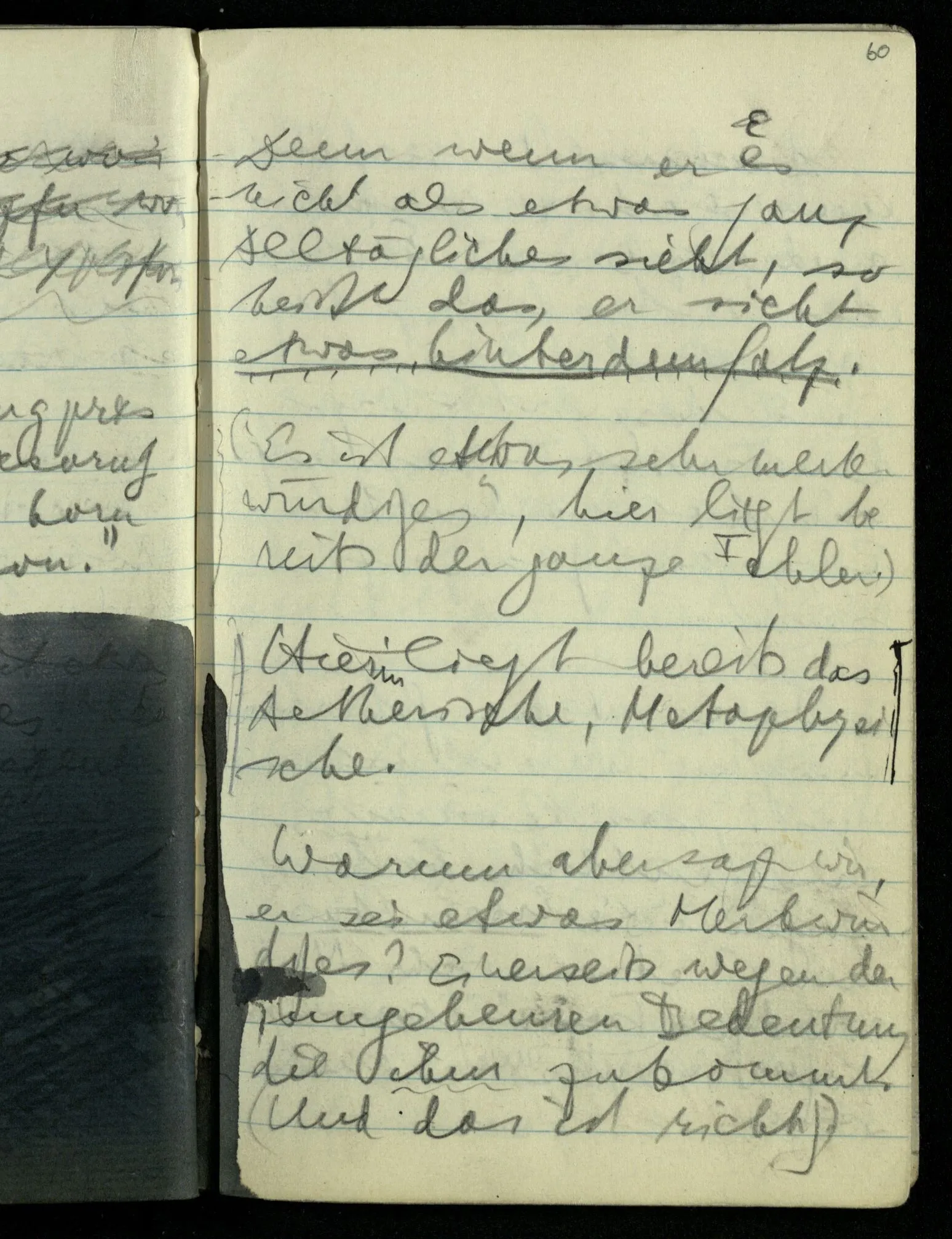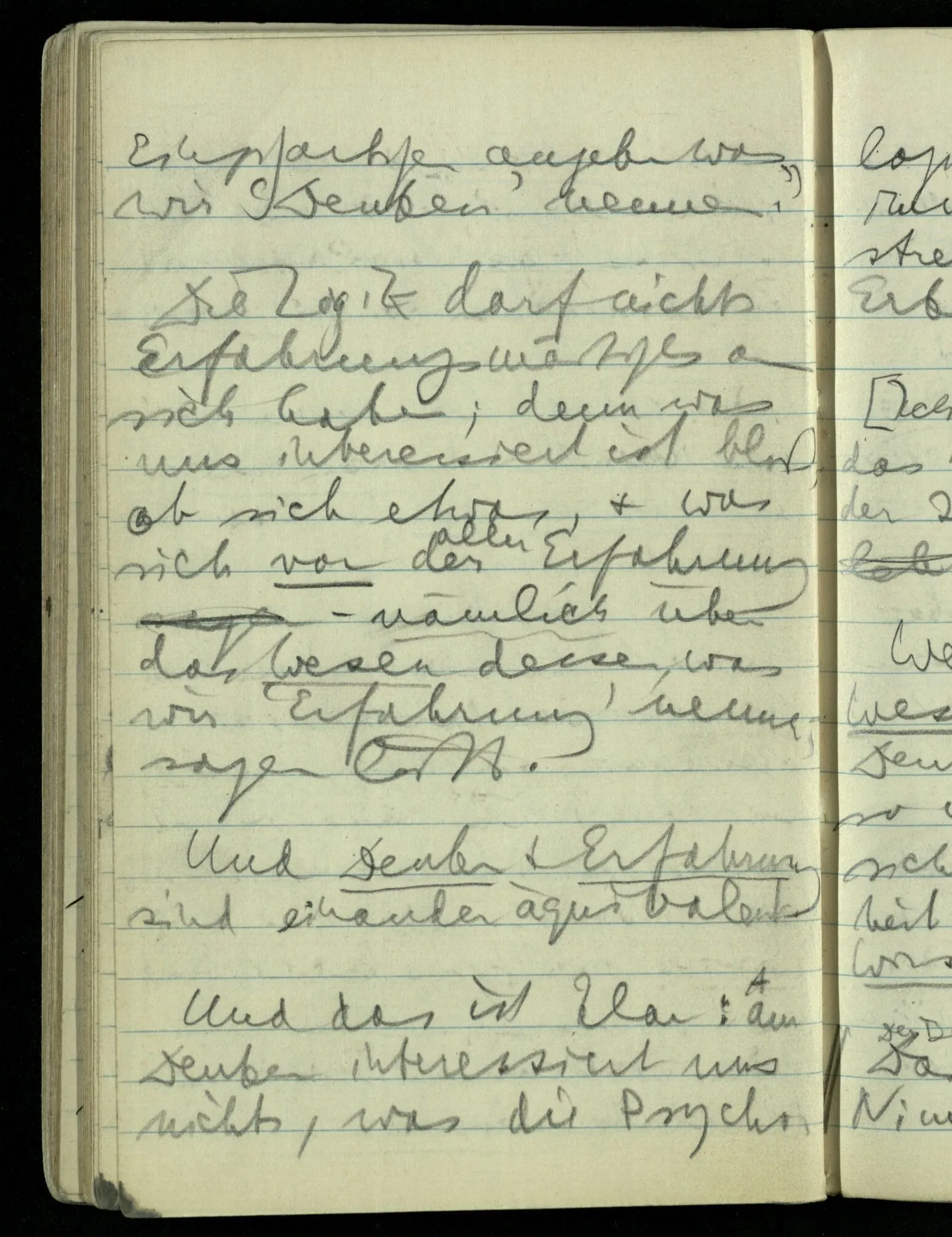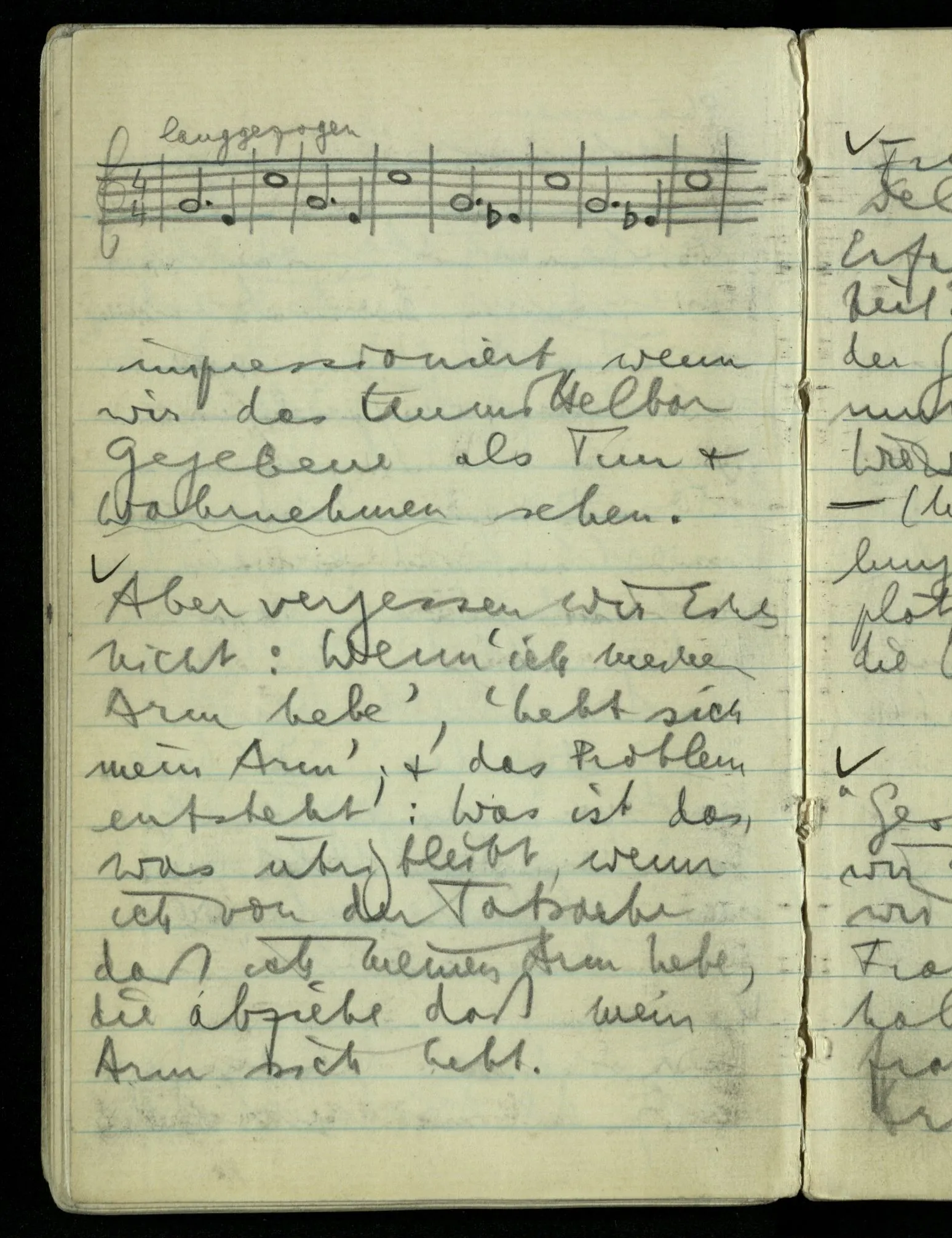 Hat nun mein Körper Schmerzen? – Man möchte sagen: “Wie kann denn der Körper Schmerzen haben? Der Körper ist doch an sich etwas Totes; ein Körper weiß doch nichts von sich selbst!” Und hier ist es wieder als sähen wir in das Wesen der Schmerzen & erkennten als eine Tatsache ihrer Natur, daß der Körper sie nicht haben könne & es ist als erkennten wir, daß das was sie hat ein Wesen anderer Art nämlich geistiger Art sein müsse.