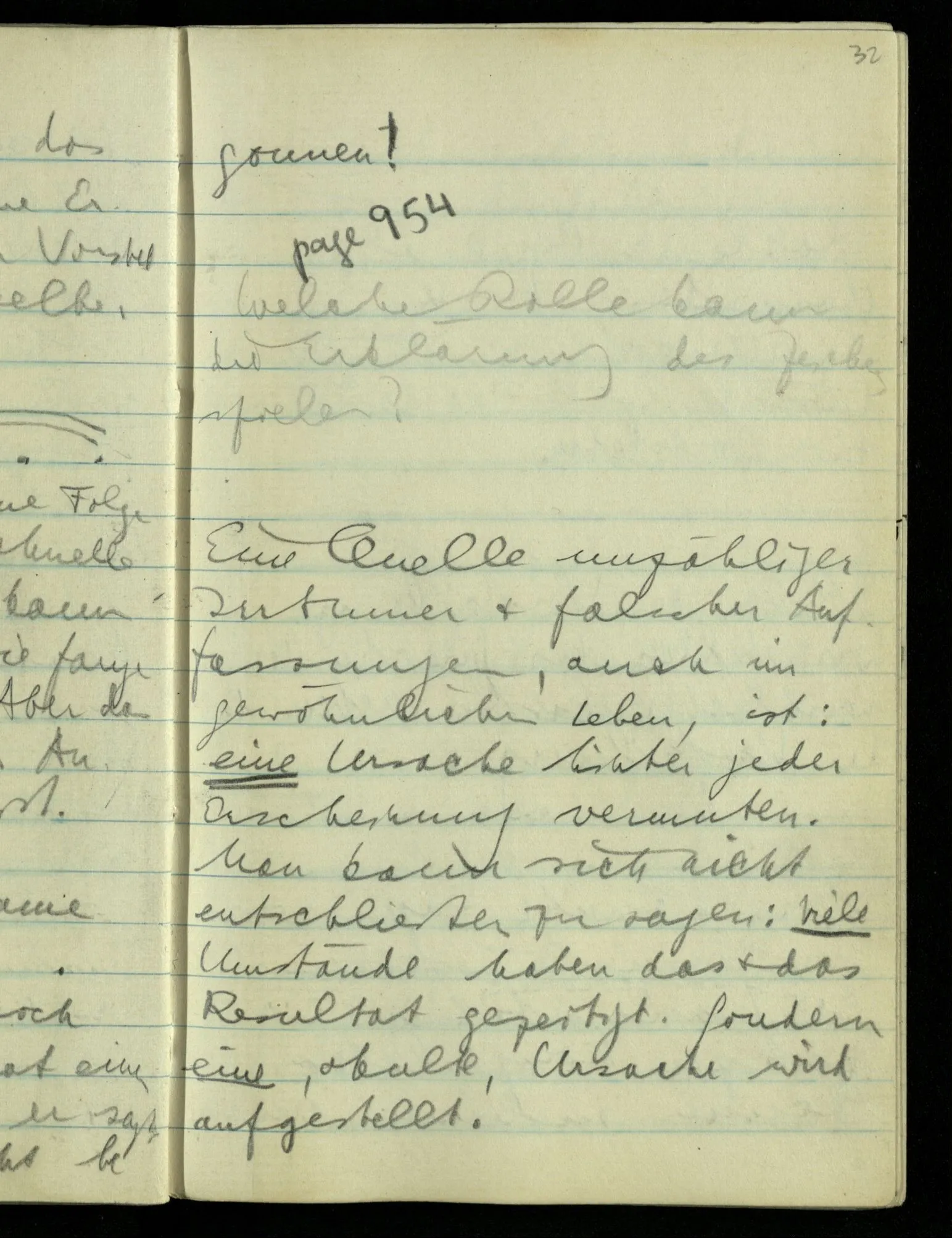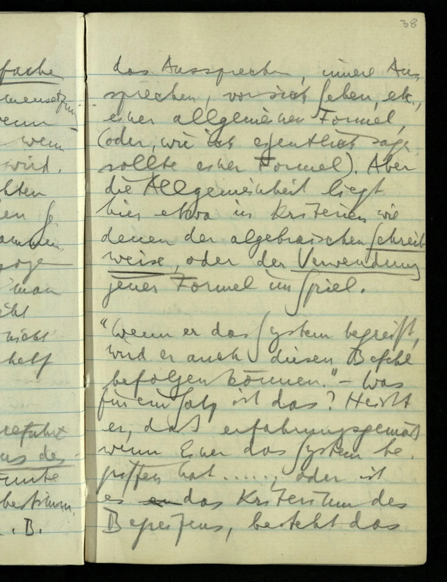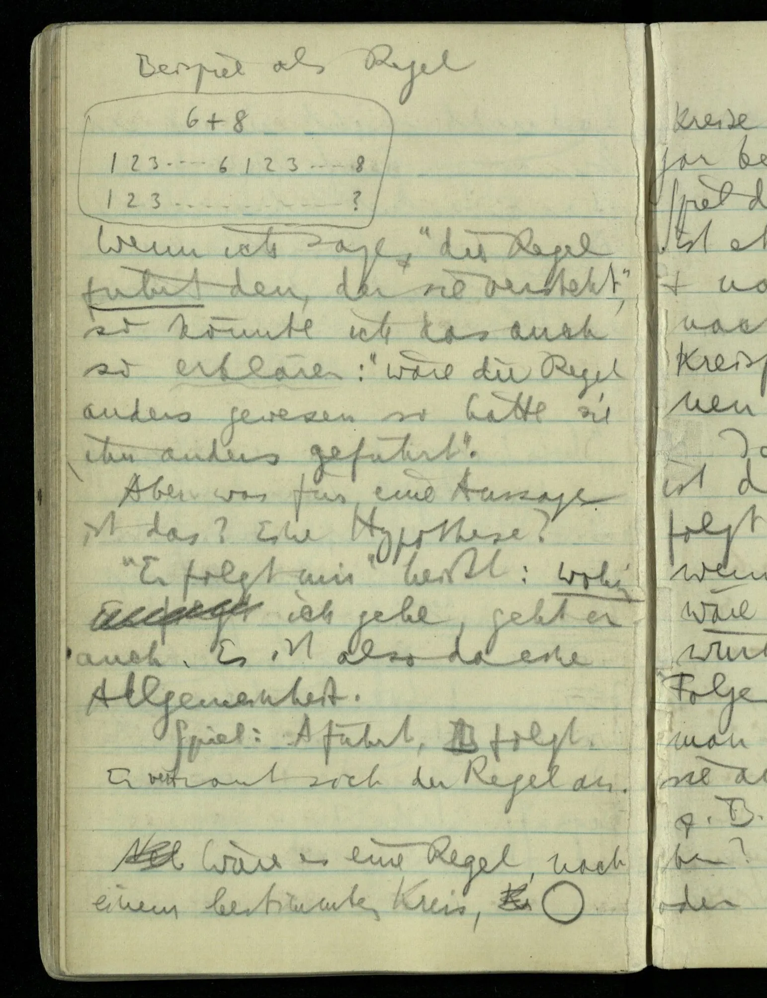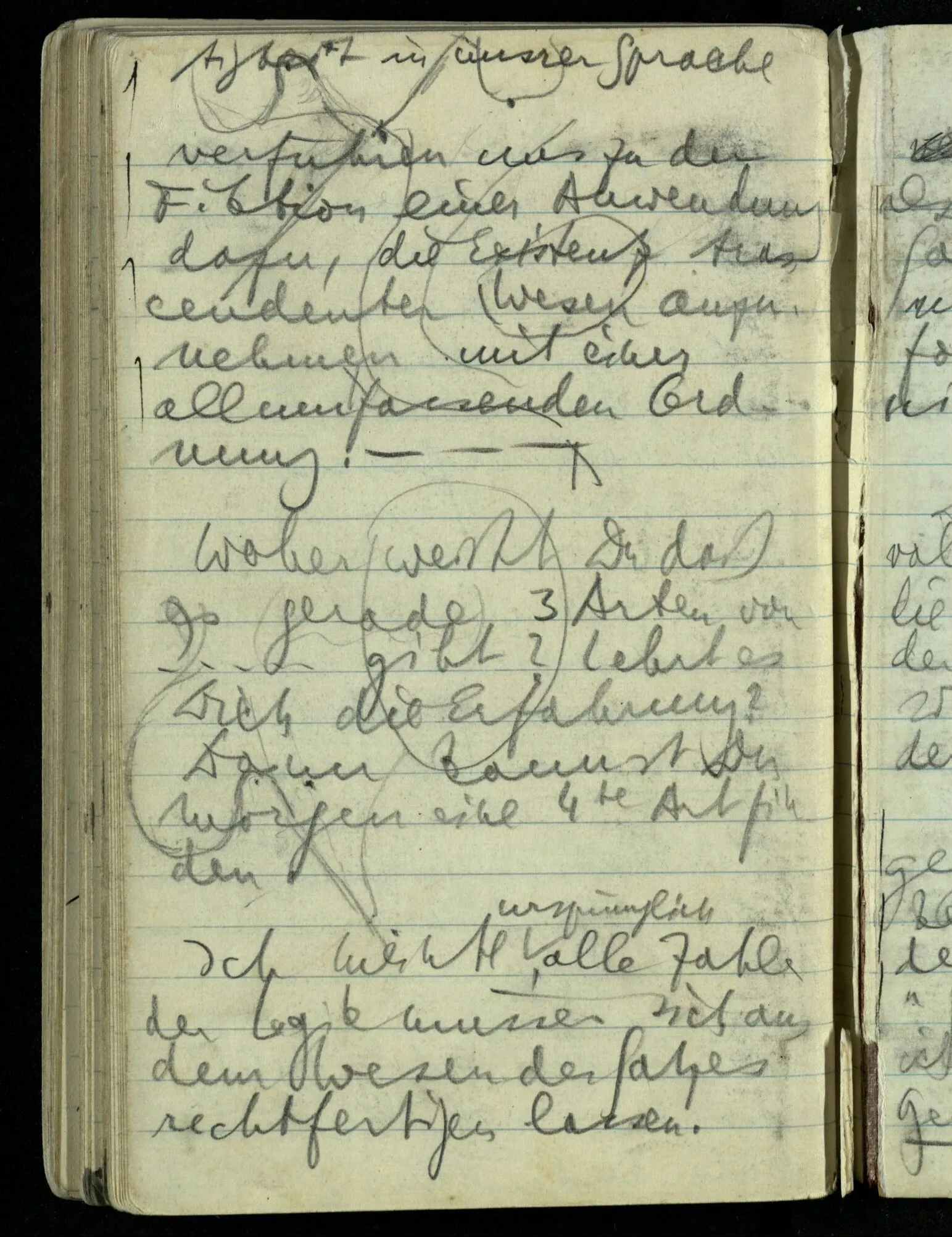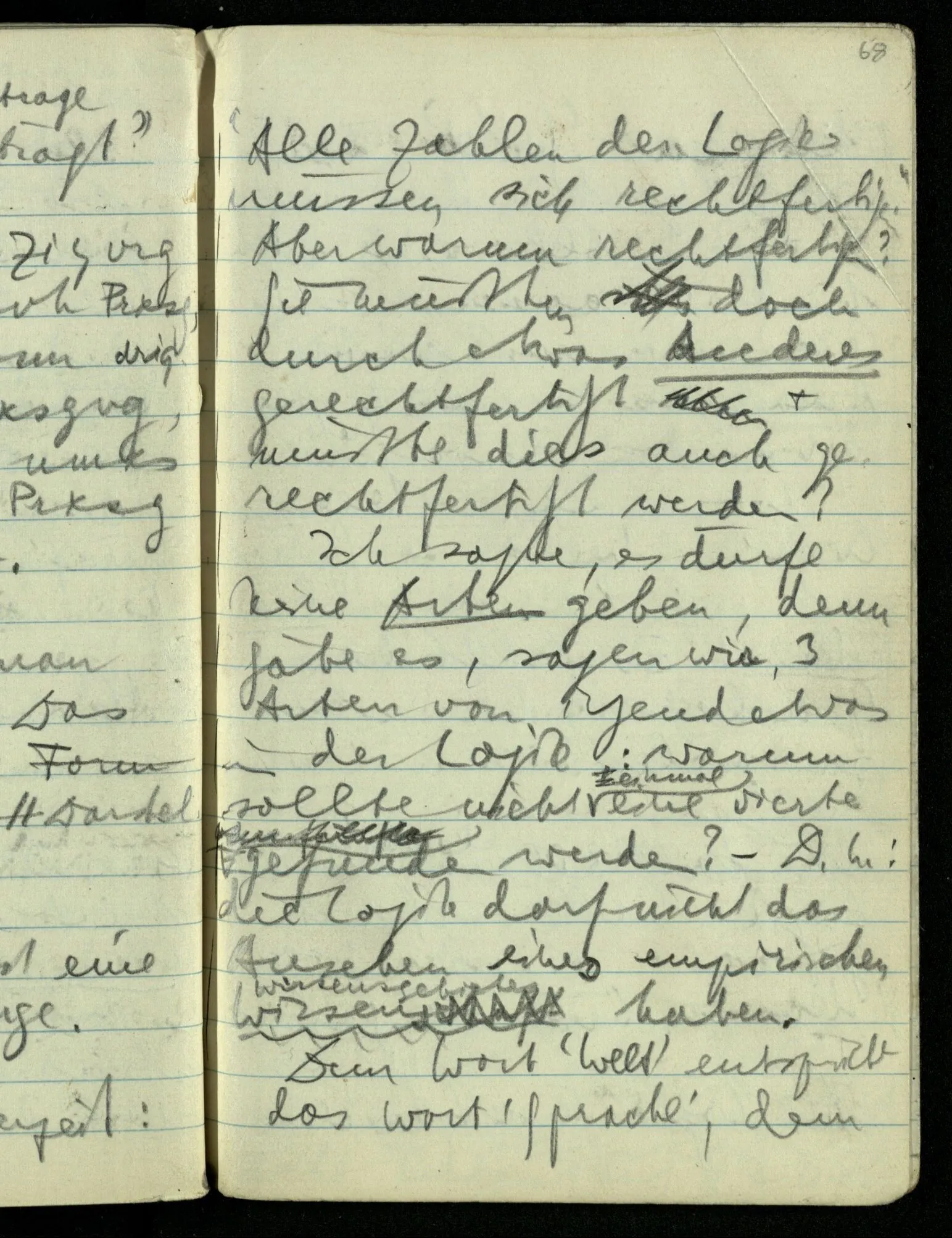 Ich sagte seinerzeit: “Alle Zahlen der Logik müssen sich rechtfertigen.” Aber warum rechtfertigen? Sie müßten doch durch etwas Anderes gerechtfertigt & müßte dies auch gerechtfertigt werden? Ich sagte, es dürfe keine Arten geben, denn gäbe es, sagen wir, 3 Arten von irgendetwas in der Logik: warum sollte nicht einmal eine vierte gefunden werden? – D.h.: die Logik darf nicht das Ansehen einer empirischen Wissenschaft haben. Dem Wort ‘Welt’ entspricht das Wort ‘Sprache’, dem das Wort ‘Satz’, das Wort “Wort”, das Wort “Logik”. Alle diese stehen hintereinander & es kann durch weitere Analyse nie ein Nebeneinander hervorgehen. Wozu aber ist dieses Wort “Welt” & “Sprache” etc. dann zu brauchen? Es fehlt das Sprachspiel, das mit ihnen zu spielen ist.