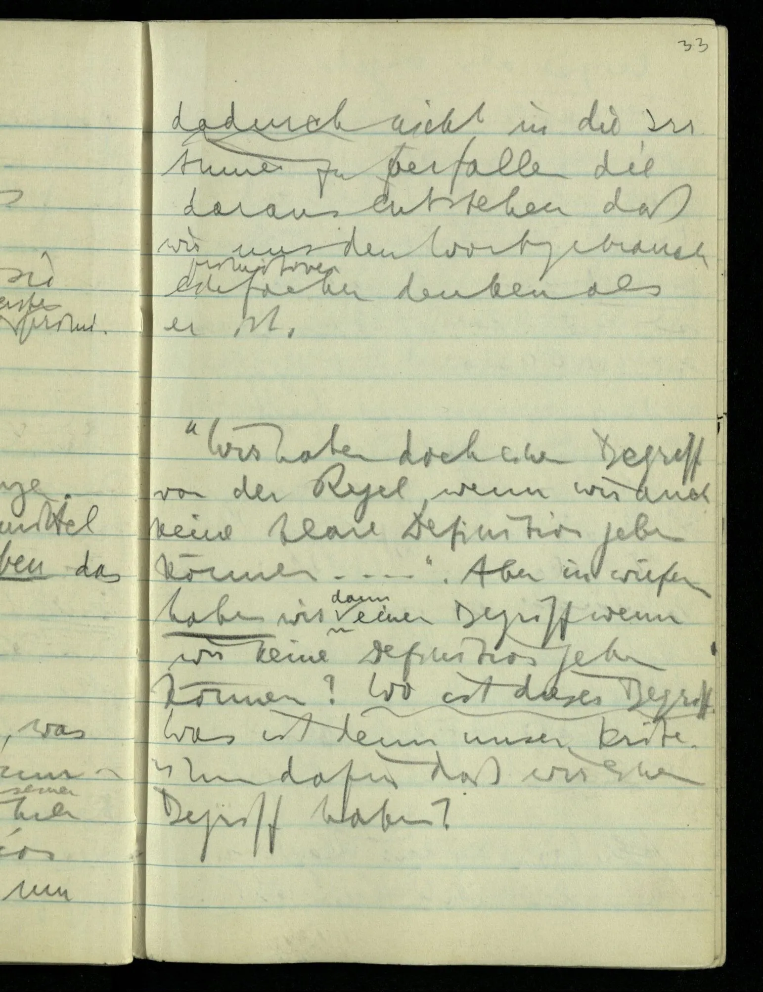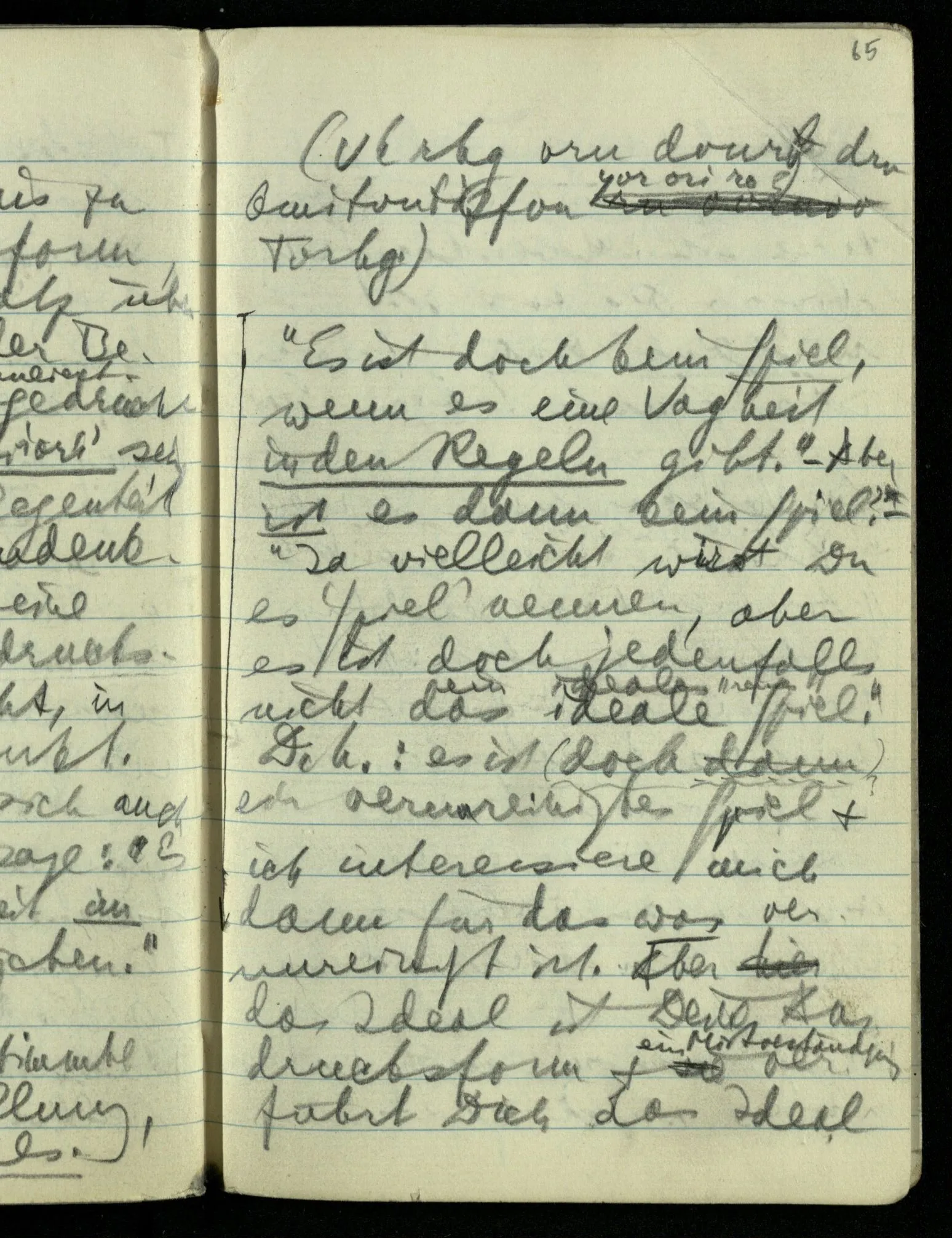 “Es ist doch kein Spiel, wenn es eine Vagheit in den Regeln gibt.” – Aber ist es dann kein Spiel? – “Ja vielleicht wirst Du es ‘Spiel’ nennen, aber es ist doch jedenfalls nicht das ideale Spiel.” D.h.: es ist (doch dann) ein verunreinigtes Spiel & ich interessiere mich dann für das was verunreinigt ist. Aber das Ideal ist Deine Ausdrucksform & ein Mißverständnis verführt Dich das Ideal falsch anzuwenden. Es ist, als wenn Du sagtest: “Der Umfang dieses Rades ist wirklich D.π” (so genau ist es gearbeitet).