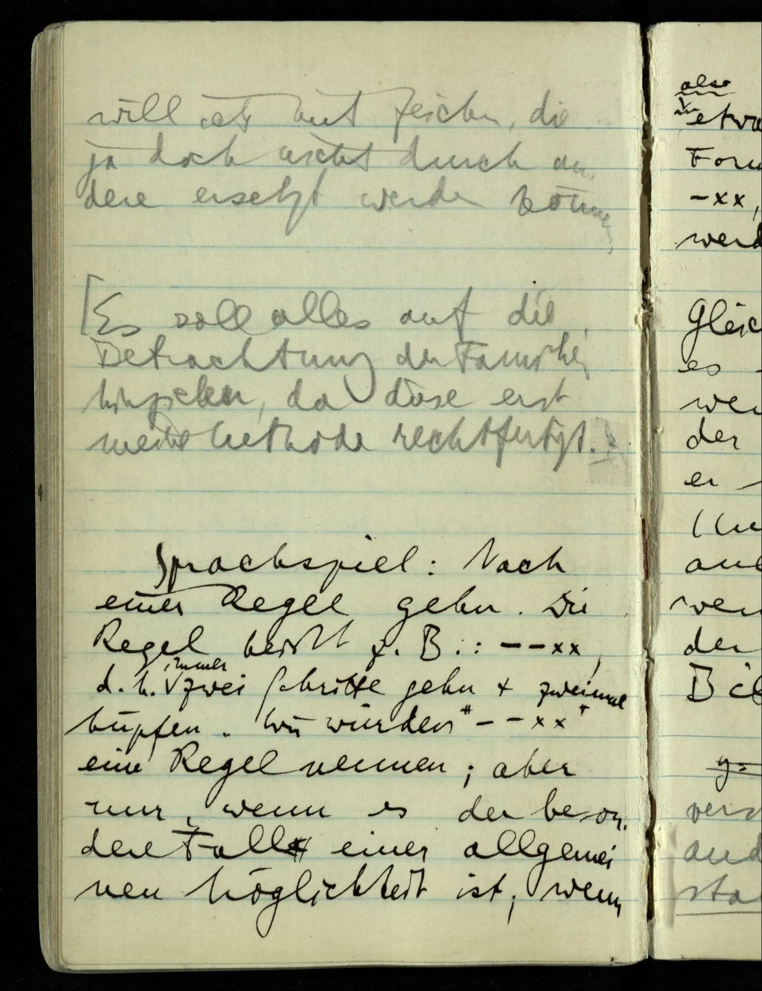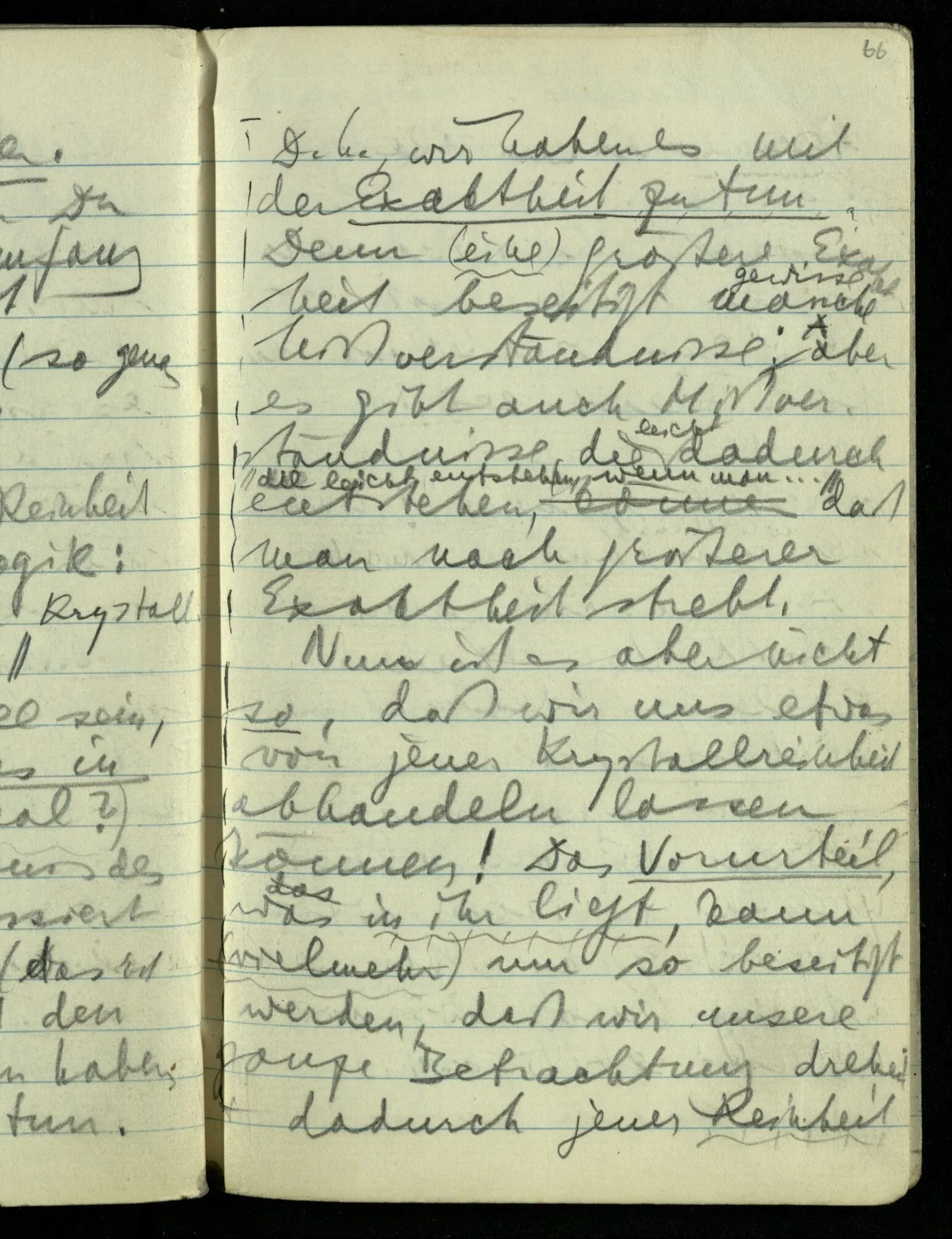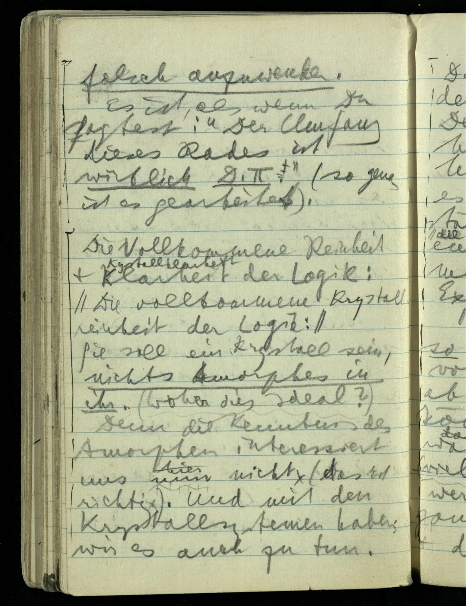 Denn die Kenntnis des Amorphen interessiert uns nun nicht (das ist richtig). Und mit den Kristallsystemen haben wir es auch zu tun. D.h., wir haben es mit der Exaktheit zu tun. Denn (eine) größere Exaktheit beseitigt manche Mißverständnisse: Aber es gibt auch Mißverständnisse, die leicht dadurch entstehen, daß man nach größerer Exaktheit strebt. Nun ist es aber nicht so, daß wir uns etwas von jener Kristallreinheit abhandeln lassen können! Das Vorurteil, was in ihr liegt, kann nur so beseitigt werden, daß wir unsere ganze Betrachtung drehen; dadurch jener Reinheit einen andern Platz geben. Es ist aber auch nicht so, daß man sagen könnte: “Das Vorurteil ist, daß das Ideal existiert. Während wir ihm nur nachstreben müssen.” Denn auch darin liegt das Mißverständnis. Die Rolle des Ideals ist damit nicht erfaßt.