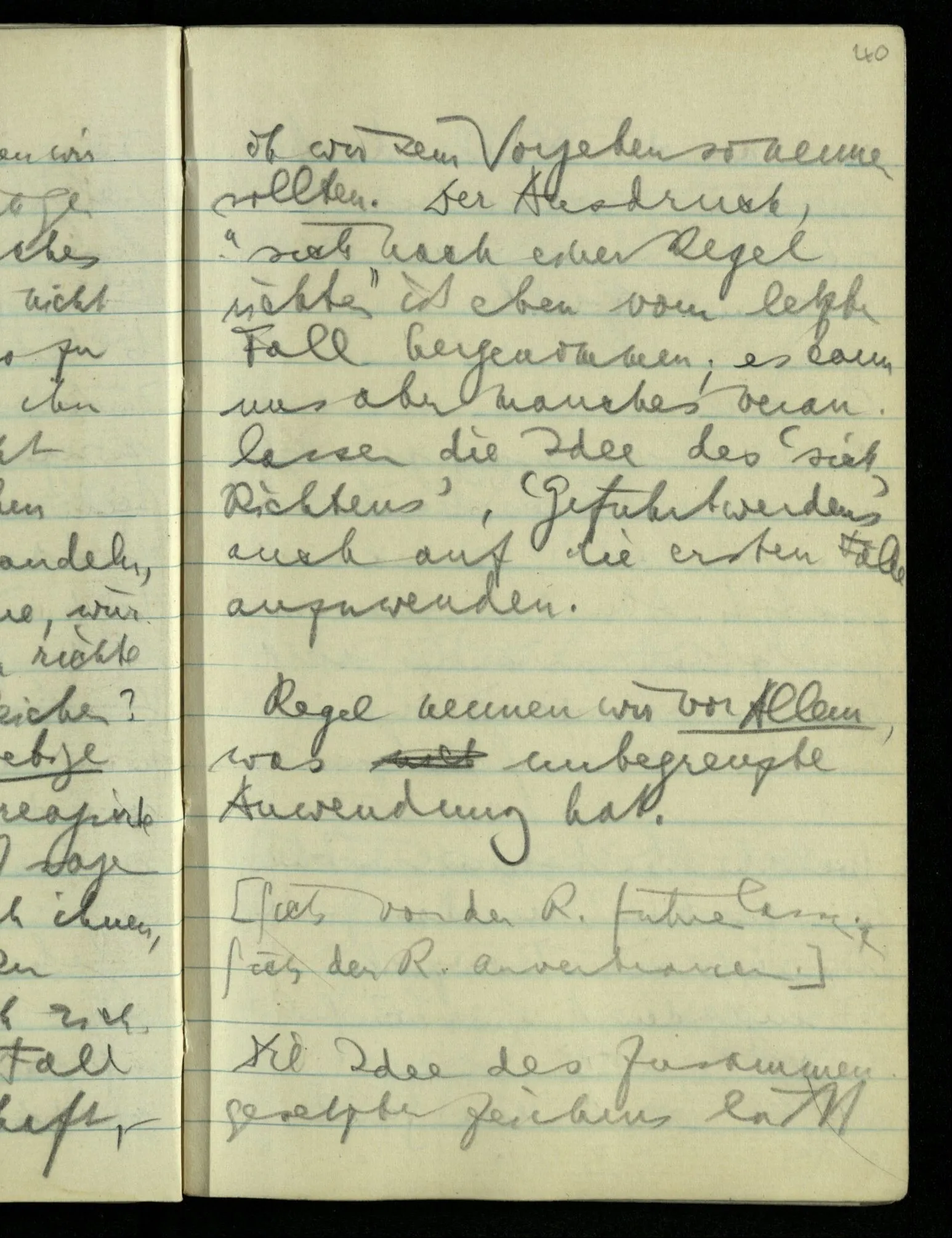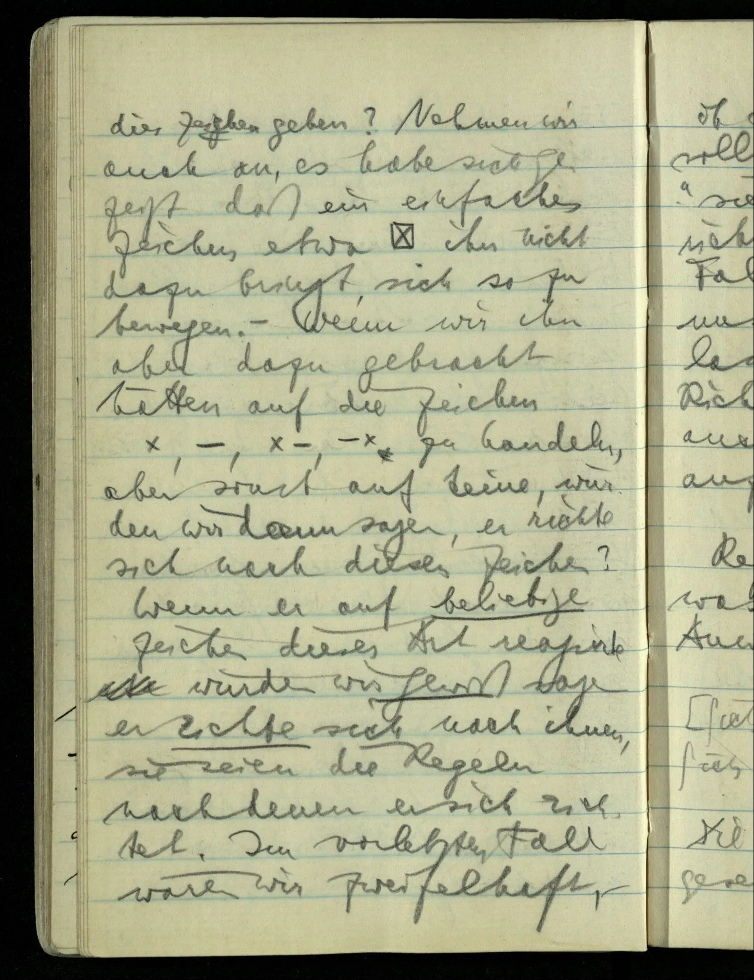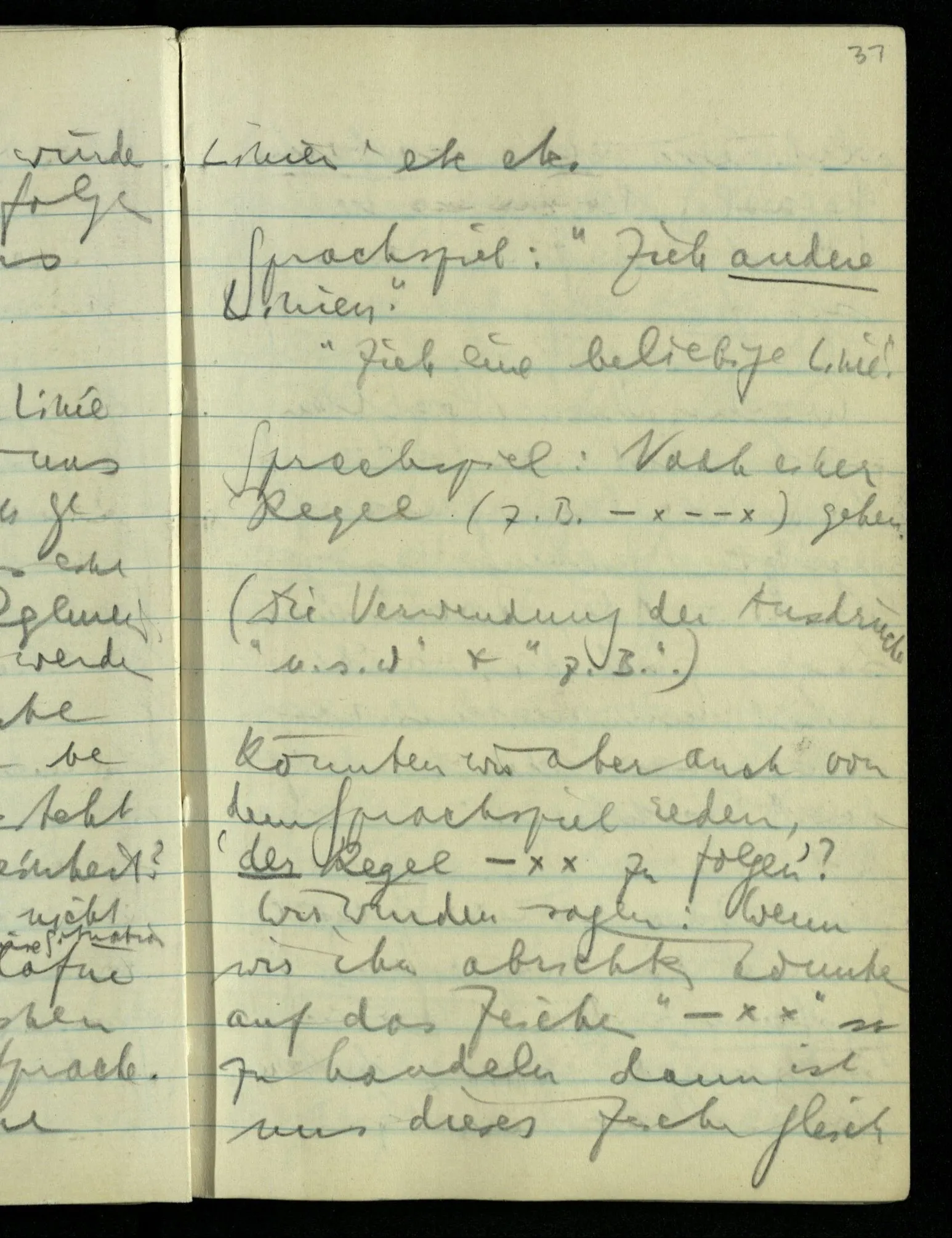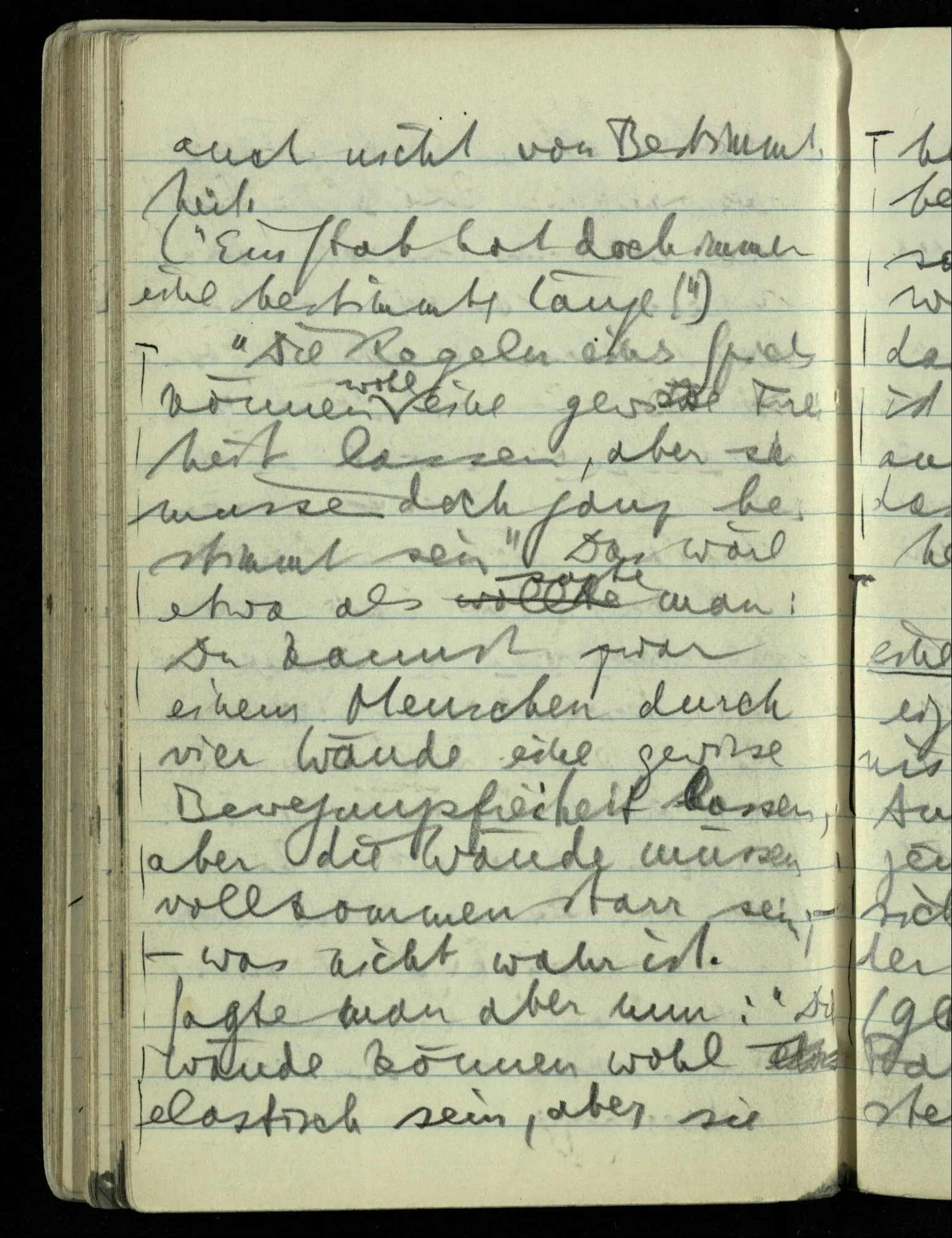 (“Ein Stab hat doch immer eine bestimmte Länge!”) “Die Regeln eines Spiels können wohl eine gewisse Freiheit lassen, aber sie müssen doch ganz bestimmt sein”. Das wäre etwa als sagte man: Du kannst zwar einem Menschen durch vier Wände eine gewisse Bewegungsfreiheit lassen, aber die Wände müssen vollkommen starr sein;– – was nicht wahr ist.