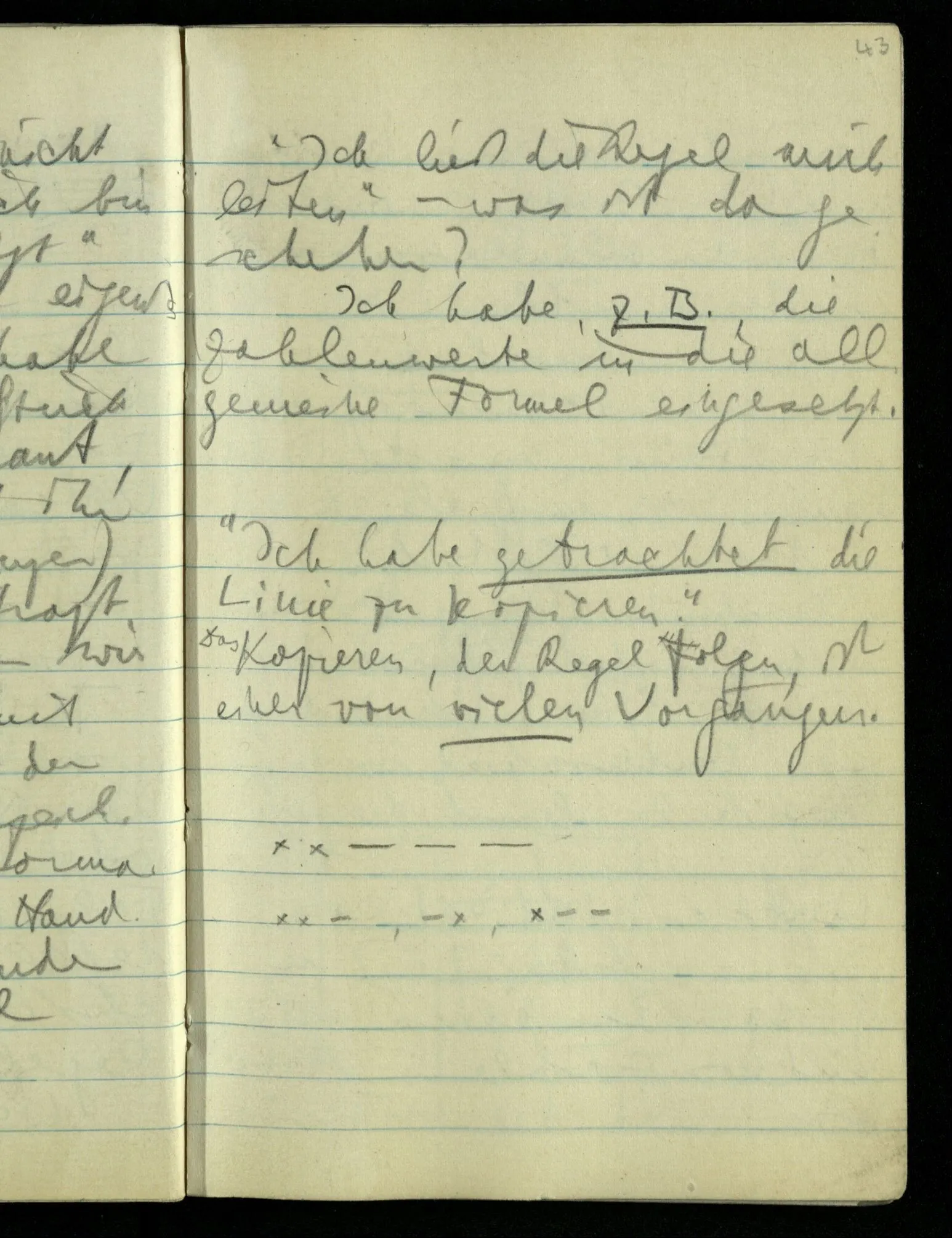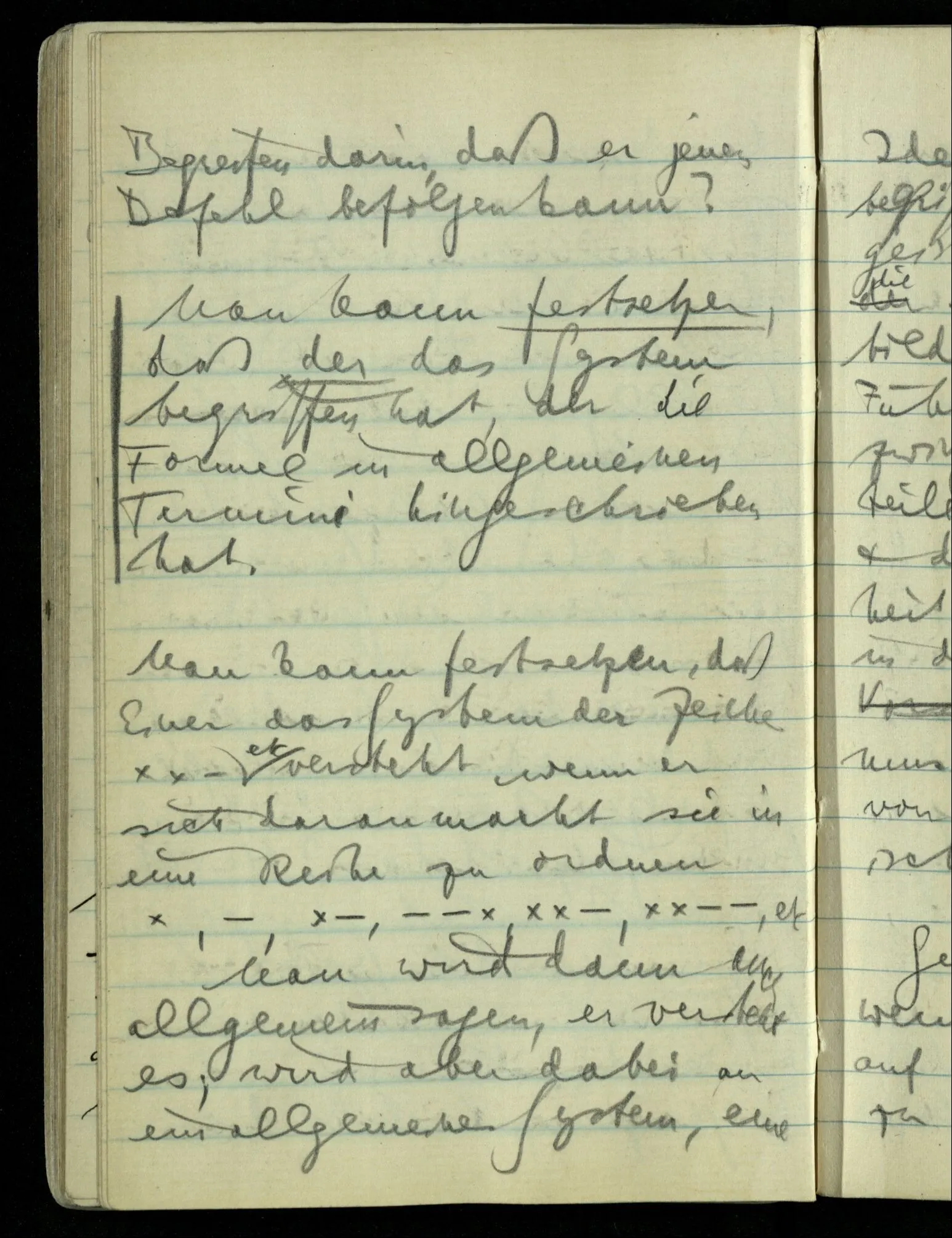 Ich meinte ursprünglich, alle Zahlen der Logik müssen sich aus dem Wesen des Satzes rechtfertigen lassen. Wenn man also das Wesen des Satzes ausspricht, so muß alles andre folgen. Es kann dann nicht anders sein.