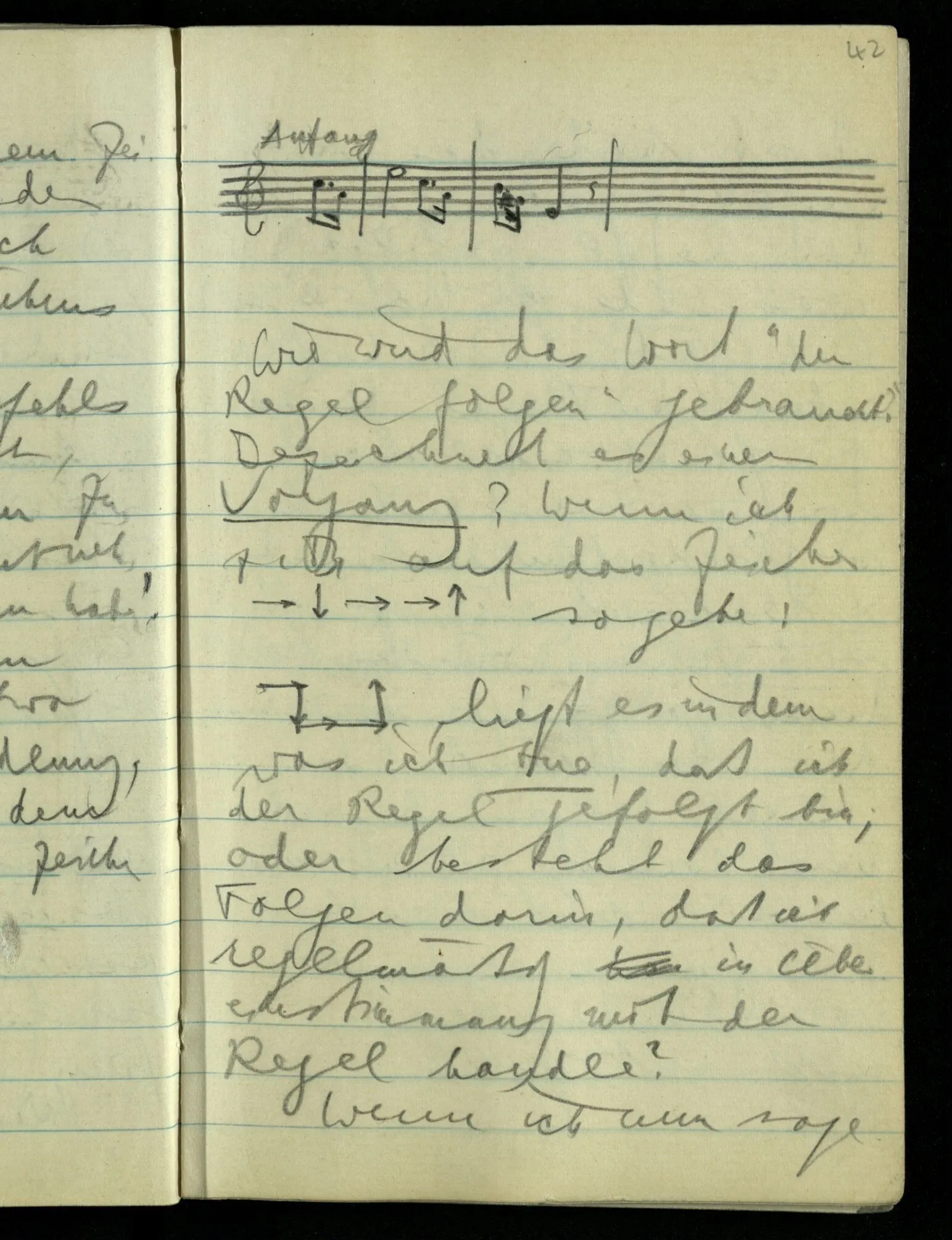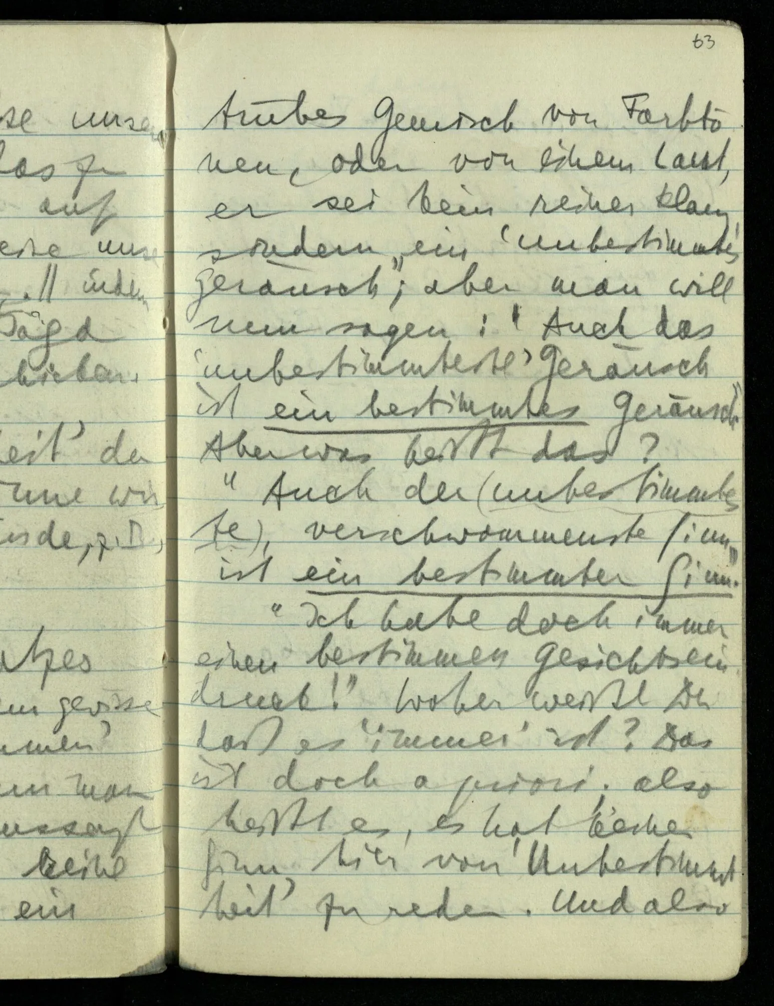 “Der Sinn eines Satzes kann wohl in einem gewissen Sinne ‘verschwommen’ sein, wie etwa wenn man von einem Ding aussagt es habe nicht eine reine Farbe sondern ein trübes Gemisch von Farbtönen, oder von einem Laut, er sei kein reiner Klang sondern ein ‘unbestimmtes’ Geräusch”; aber man will nun sagen: “Auch das ‘unbestimmteste’ Geräusch ist ein bestimmtes Geräusch”. Aber was heißt das? “Auch der (unbestimmteste), verschwommenste Sinn ist ein bestimmter Sinn”. “Ich habe doch immer einen bestimmten Gesichtseindruck!” Woher weißt Du daß es ‘immer’ ist? Das ist doch a priori; also heißt es, es hat keinen Sinn hier von ‘Unbestimmtheit’ zu reden. Und also auch nicht von Bestimmtheit.