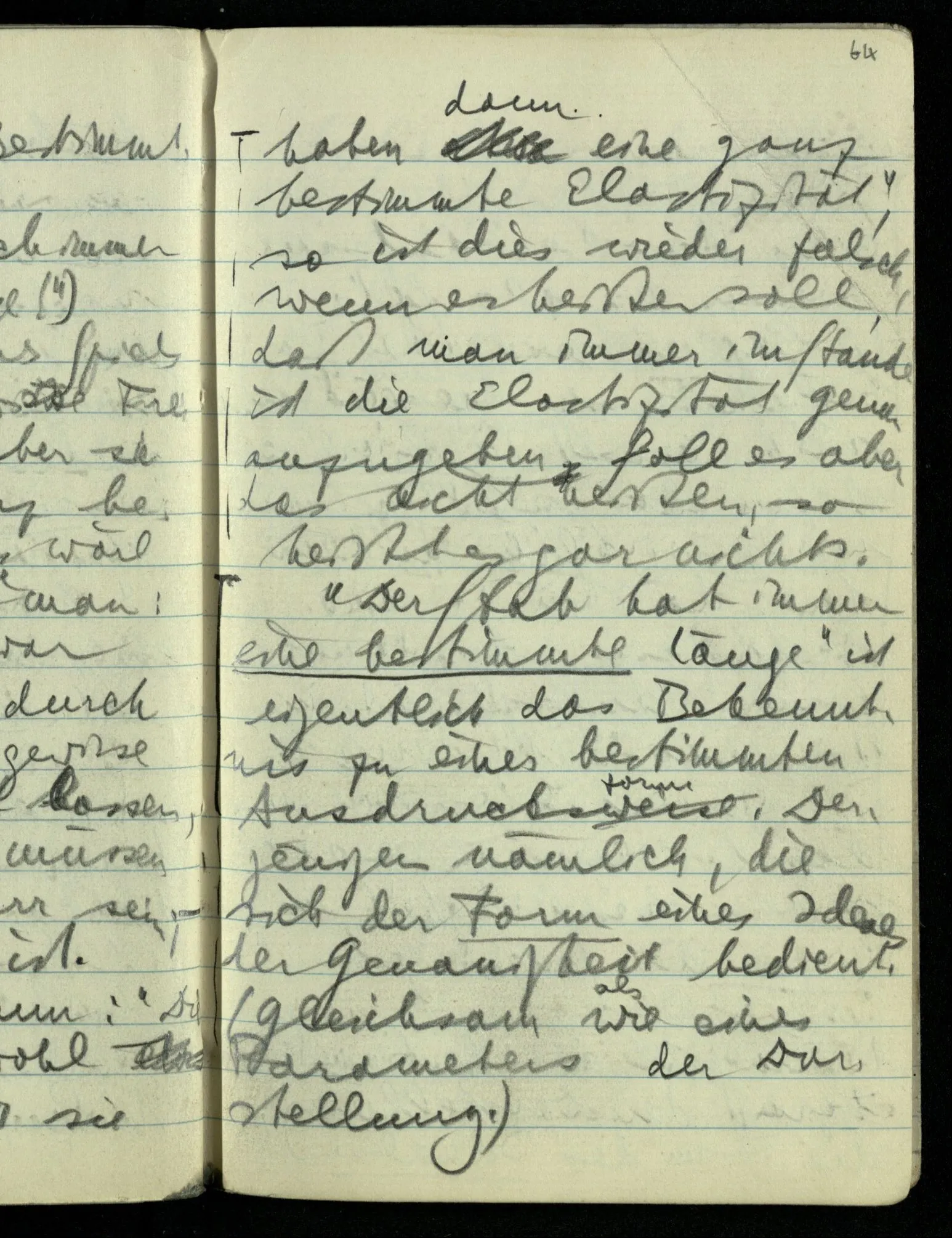 Sagte man aber nun: “Diese Wände können wohl elastisch sein, aber sie haben dann eine ganz bestimmte Elastizität”, so ist dies wieder falsch, wenn es heißen soll, daß man immer im Stande ist die Elastizität genau anzugeben. Soll es aber das nicht heißen, so heißt es gar nichts. “Der Stab hat immer eine bestimmte Länge” ist eigentlich das Bekenntnis zu einer bestimmten Ausdrucksform. Derjenigen nämlich, die sich der Form eines Ideals der Genauigkeit bedient. (Gleichsam wie eines Parameters der Darstellung.) Das Bekenntnis zu einer Ausdrucksform wenn es als Satz über die Gegenstände der Betrachtung ausgedrückt wird muß allerdings ‘a priori’ sein. Denn sein Gegenteil wird ja wirklich undenkbar, da ihm ja eine Denkform, Ausdrucksform, entspricht, in der man einfach nicht denkt. So verhält es sich auch damit, wenn ich sage: “Es kann keine Vagheit im Sinn des Satzes geben.”
