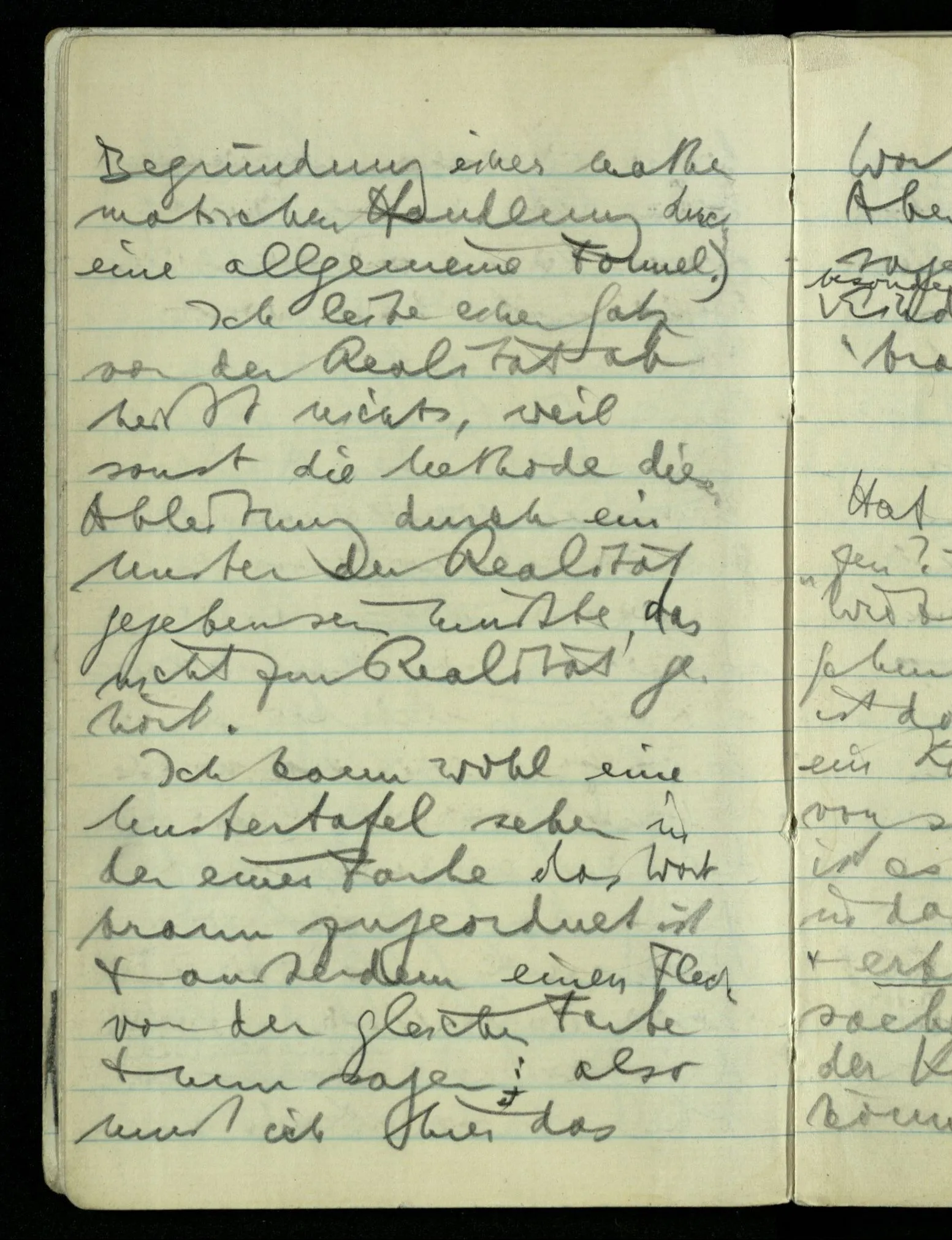 Das hängt nun damit zusammen, daß wir geneigt sind zu sagen, wir könnten nie wissen was der Andere wirklich sieht, wenn er sagt, er sähe ‘braun’. Wir könnten dem der das sagt vorschlagen, er solle zwei verschiedene Wörter statt des einen “braun” gebrauchen. Eines für diesen seinen Eindruck, den andern für das was jeder verstehen kann. Da wird er sehen daß irgend etwas an seiner Auffassung nicht stimmt. Und zwar liegt es darin, daß er eine Rechtfertigung dort sucht wo keine ist. (Wie in dem Fall wo einer glaubt die Kette der Gründe nehme kein Ende. Denke an die Begründung einer mathematischen Handlung durch eine allgemeine Formel.) Ich leite einen Satz von der Realität ab heißt nichts, weil sonst die Methode dieser Ableitung durch ein Muster der Realität gegeben sein müßte, das nicht zur Realität gehört. Ich kann wohl eine Mustertafel sehen in der einer Farbe das Wort “braun” zugeordnet ist & außerdem einen Fleck von der gleichen Farbe & nun sagen: also muß ich hier das Wort “braun” verwenden. Aber ich kann nicht sagen daß ich aus dem besondern Eindruck das Wort “braun” ableite.
