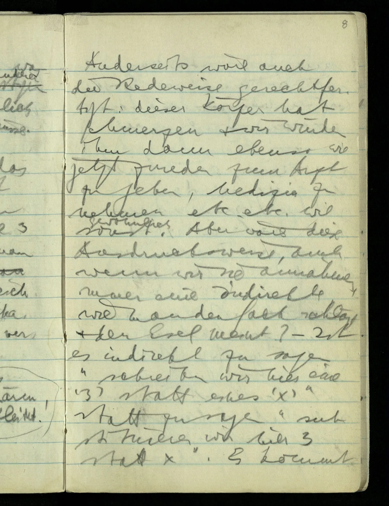 Anderseits wäre auch die Redeweise gerechtfertigt: dieser Körper hat Schmerzen & wir würden ihm dann ebenso wie jetzt zureden zum Arzt zu gehen, Medizin zu nehmen etc. etc. wie sonst. Aber wäre diese Ausdrucksweise, auch wenn wir sie annehmen, immer eine indirekte wie man den Sack schlägt & den Esel meint? – Ist es indirekt zu sagen “schreiben wir hier eine ‘3’ statt eines ‘x’” statt zu sagen “substituieren wir hier 3 statt x”. Es kommt nur darauf an wie wir unsere Worte weiter verwenden. Lassen wir uns doch nicht täuschen, daß das Meinen ein okkulter Vorgang sei der die ganze Verwendung des Zeichens wie der Samen den Baum enthalte!