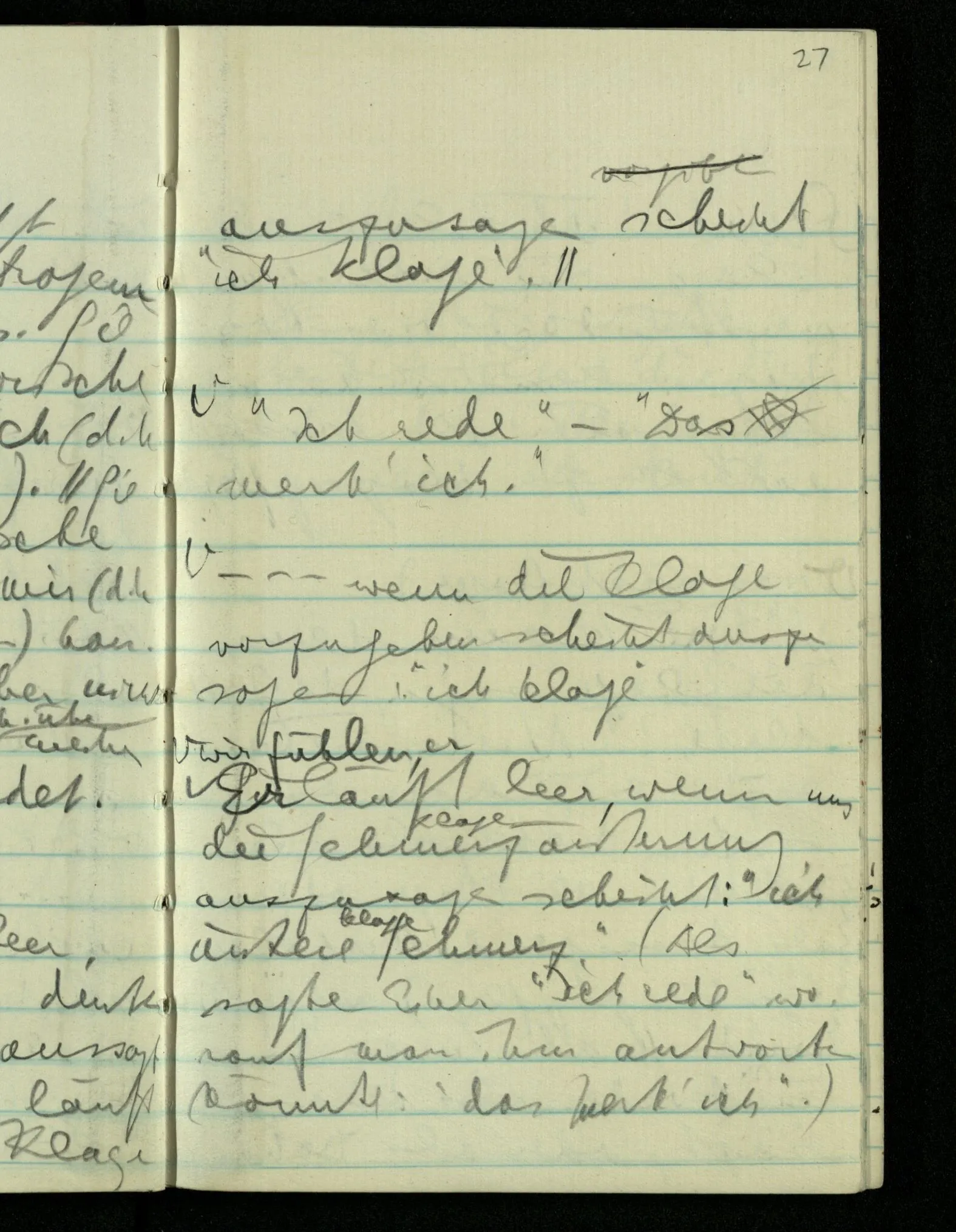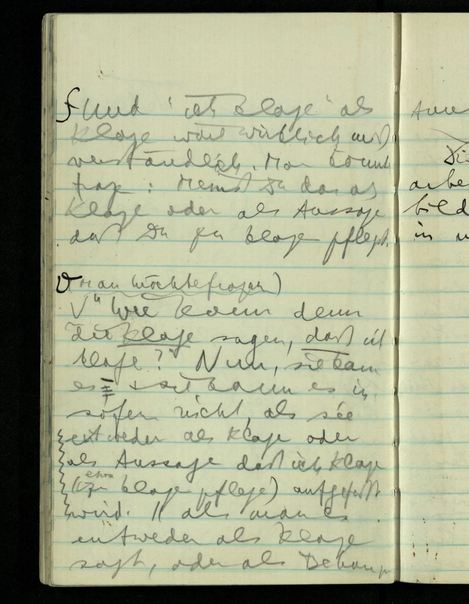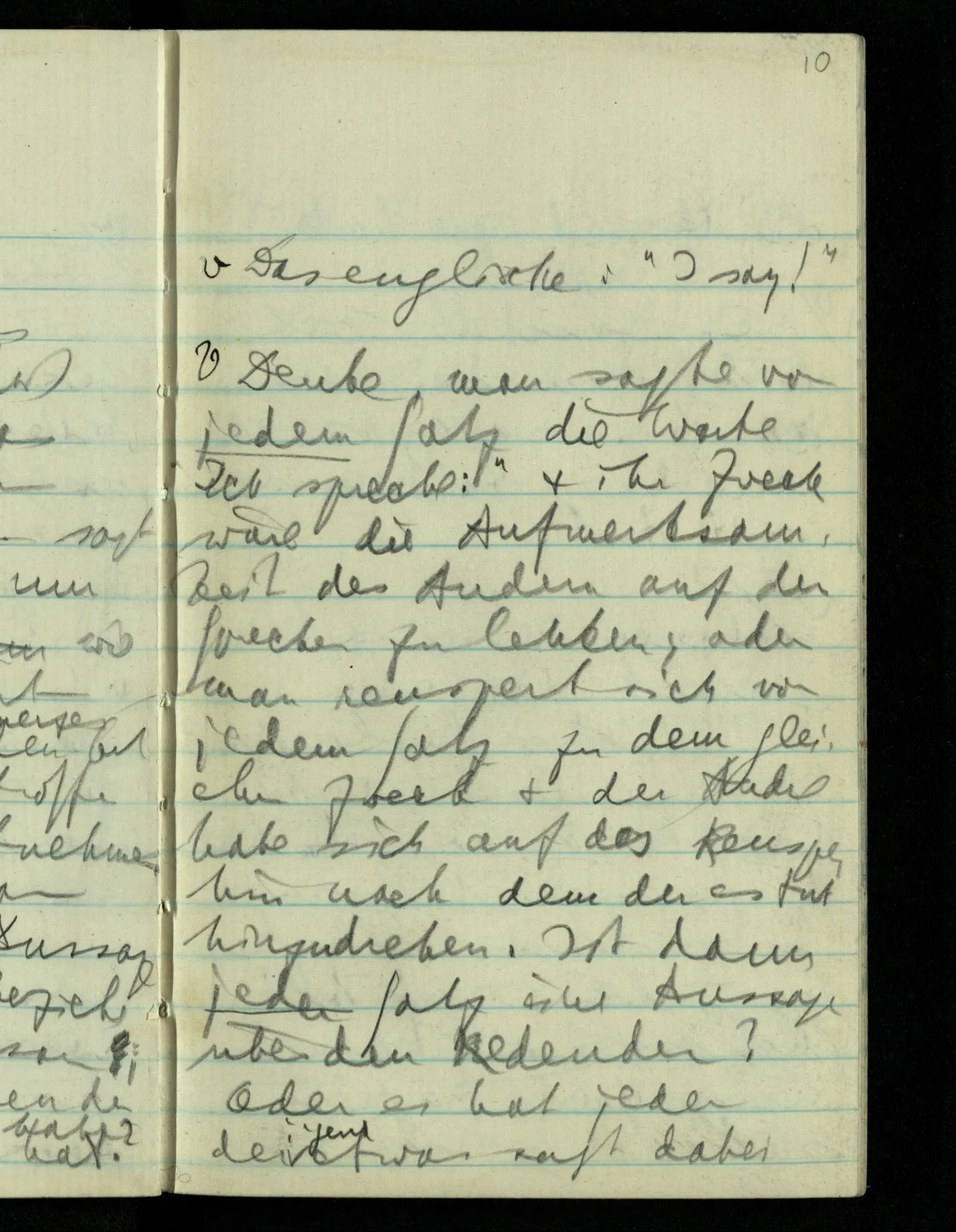 Denke man sagte vor jedem Satz die Worte “Ich spreche:” & ihr Zweck wäre die Aufmerksamkeit des Andern auf den Sprecher zu lenken; oder man räuspert sich vor jedem Satz zu dem gleichen Zweck & der Andre habe sich auf das Räuspern hin nach dem der es tut hinzudrehen. Ist dann jeder Satz eine Aussage über den Redenden? Oder es hat jeder der irgend etwas sagt dabei die Hand zu heben.