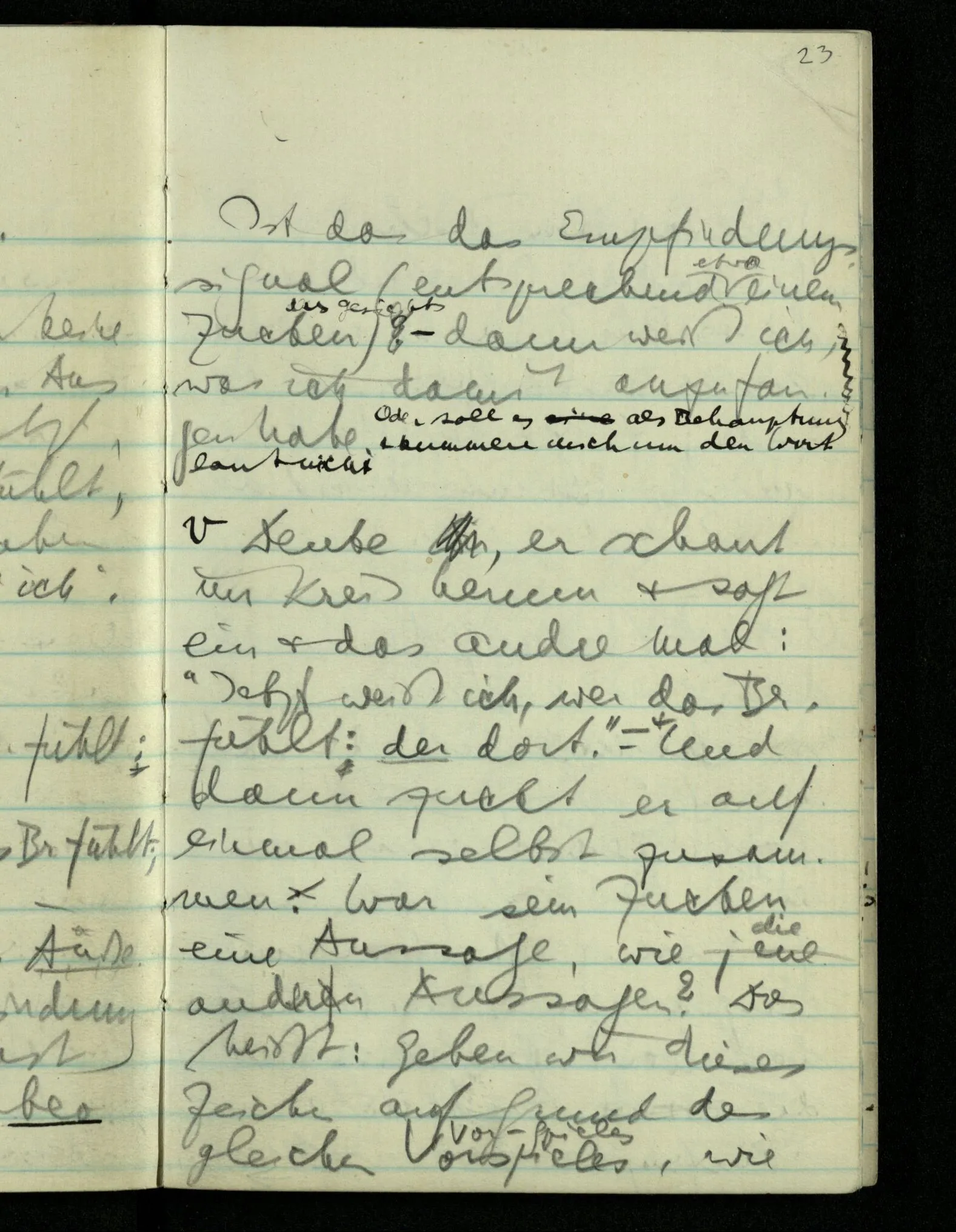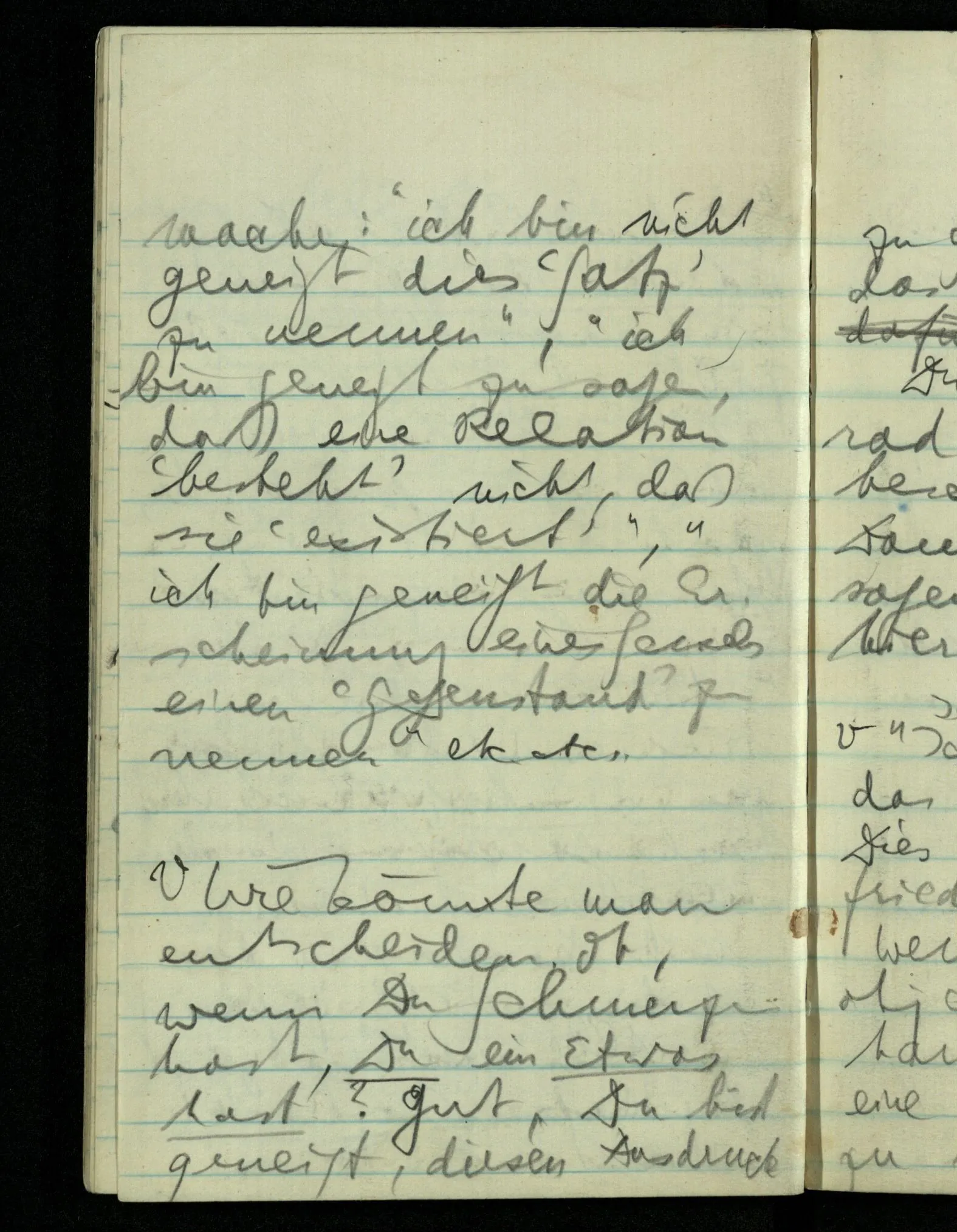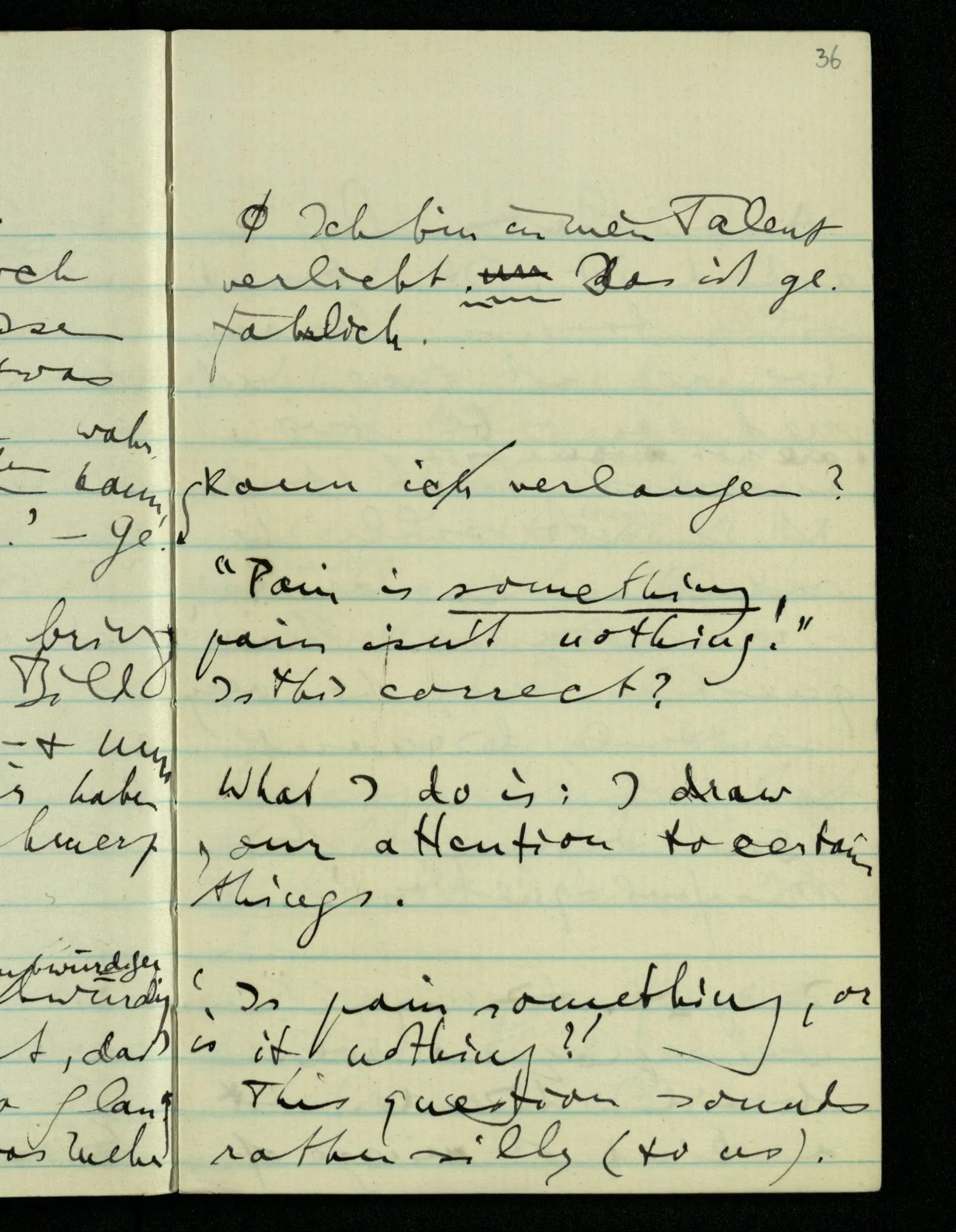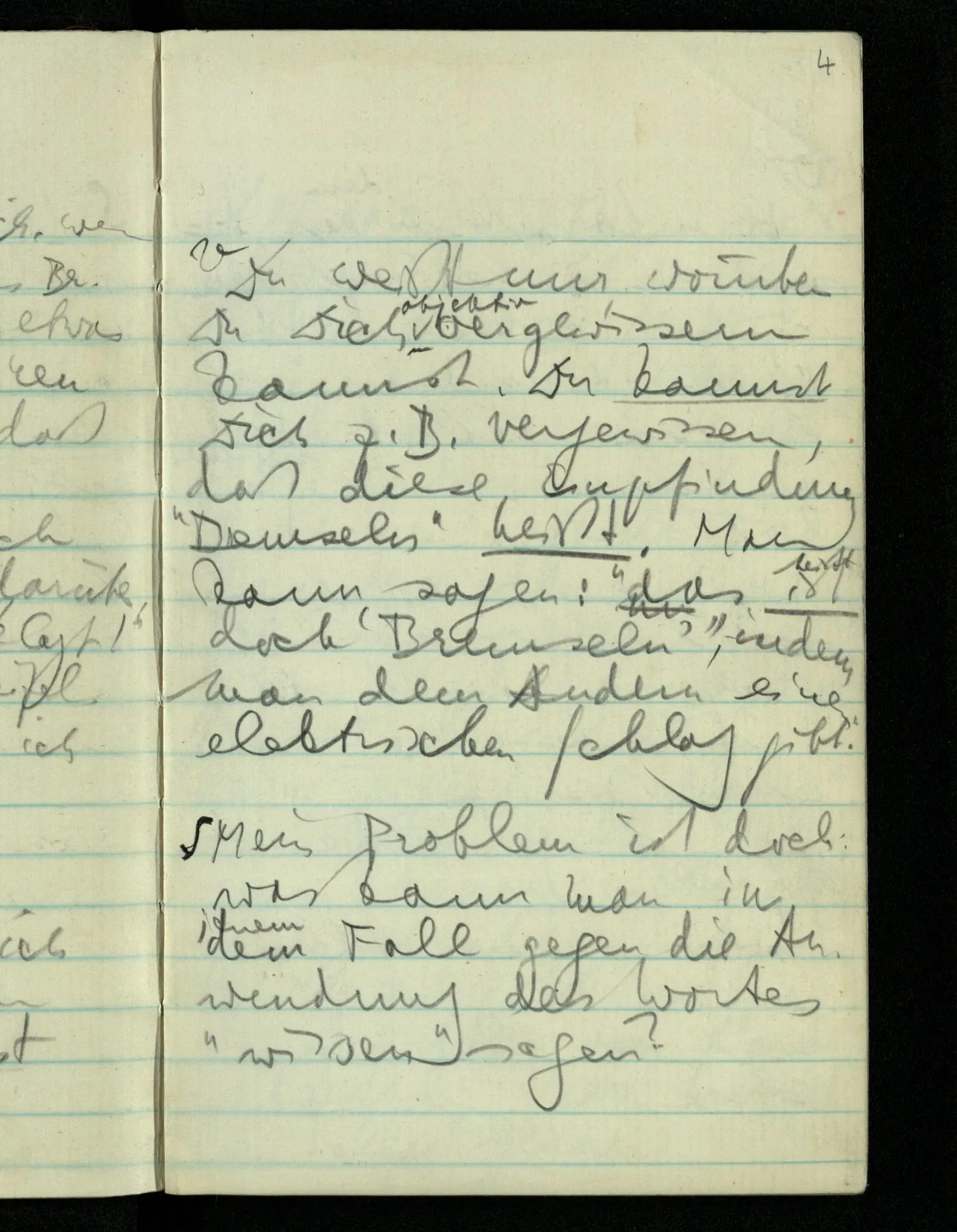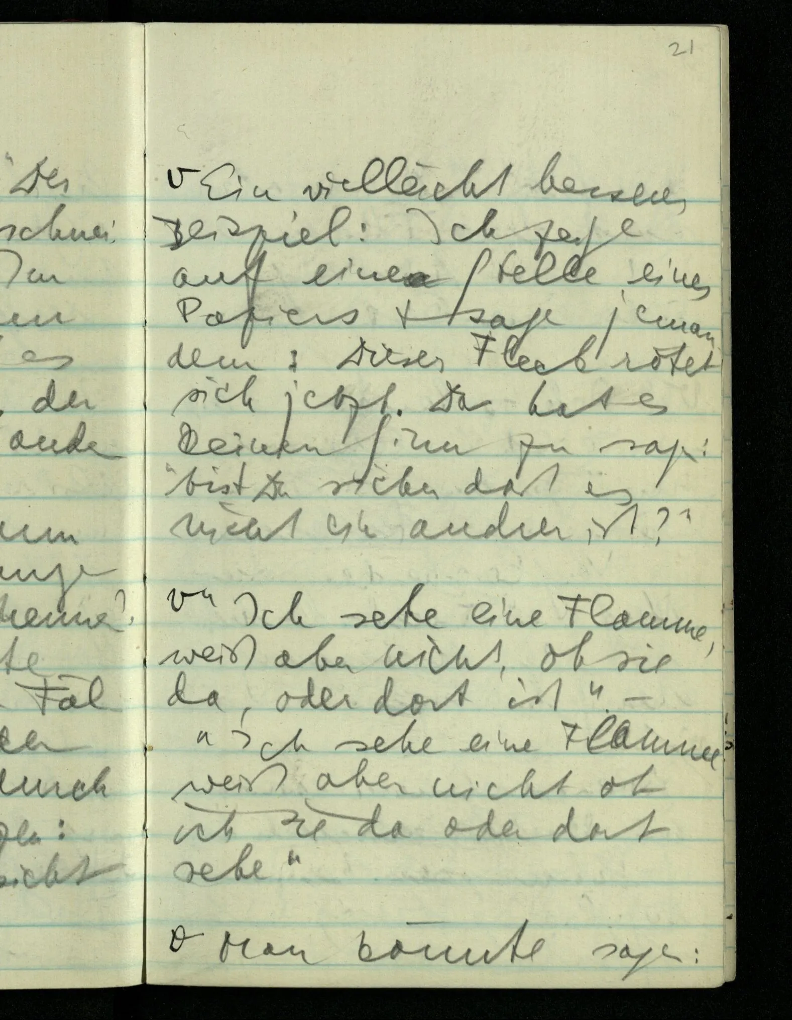 “Was heißt das, Du willst nicht sagen, daß Du etwas hast?” – Ich will nicht sagen daß jetzt etwas bei mir ist. Daß jetzt etwas eine Beziehung zu diesem Körper hat die es sonst zu einem andern hat.