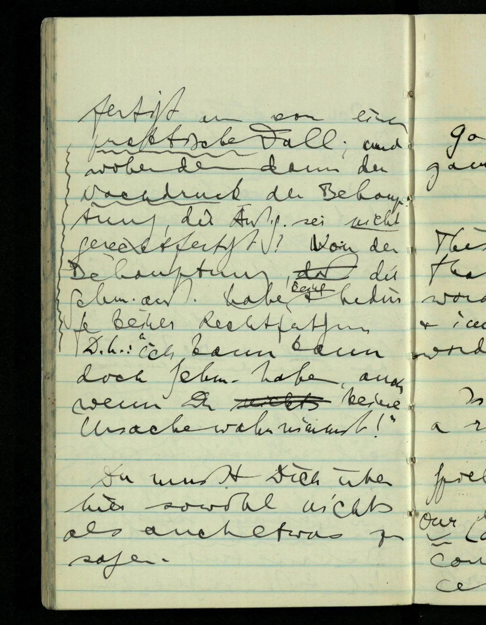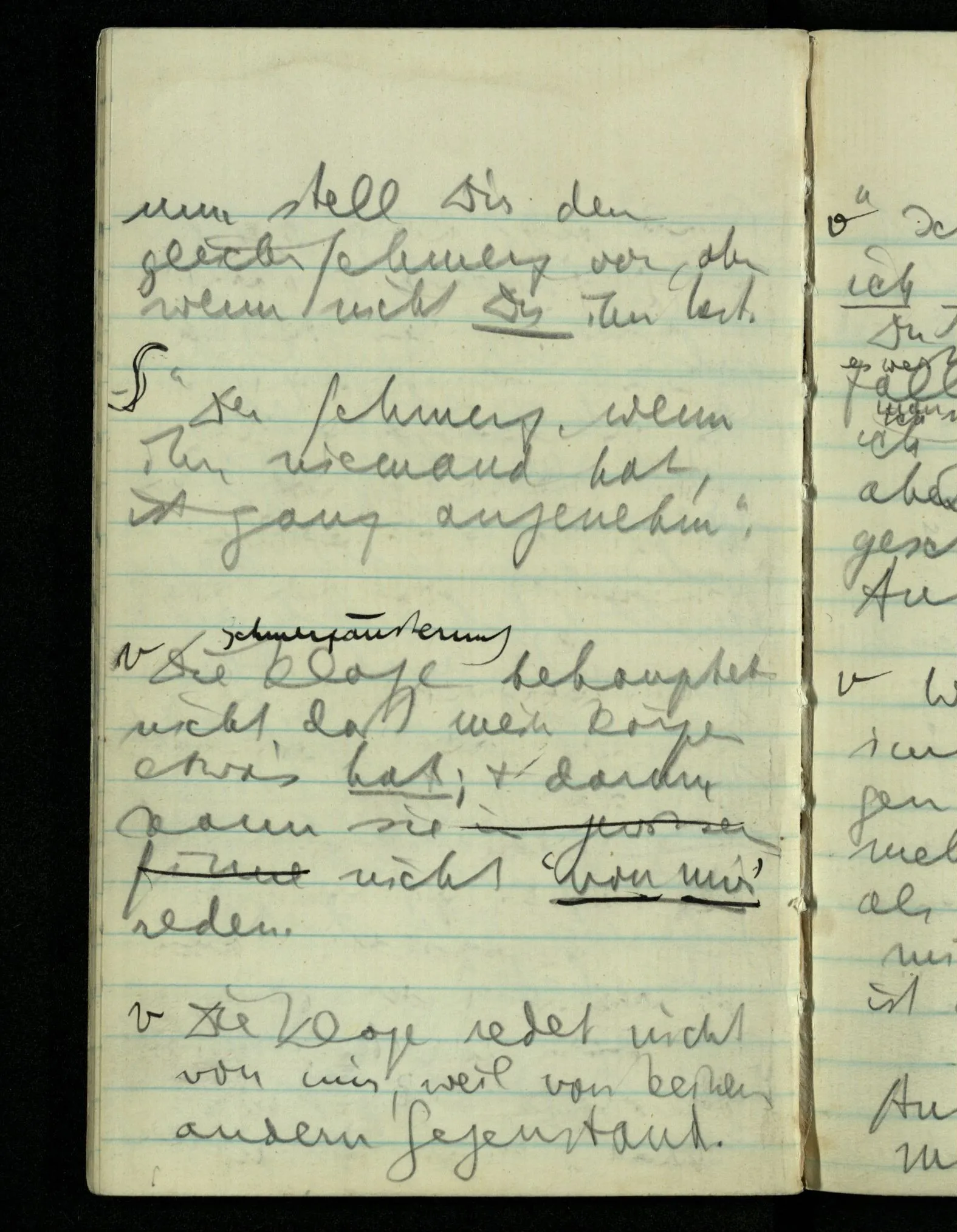 Wir sagen die Sätze mit Überzeugung, weil wir sie, in anderm Zusammenhang, wirklich behaupten können. Der Nachdruck hängt der Behauptung meine Schmerzäußerung sei gerechtfertigt an von einem praktischen Fall; und woher denn dann der Nachdruck der Behauptung, die Äußerung sei nicht gerechtfertigt? Von der Behauptung, die Schmerzäußerung habe keine & bedürfe keiner Rechtfertigung. D.h.: “ich kann doch Schmerzen haben, auch wenn Du keine Ursache wahrnimmst!”