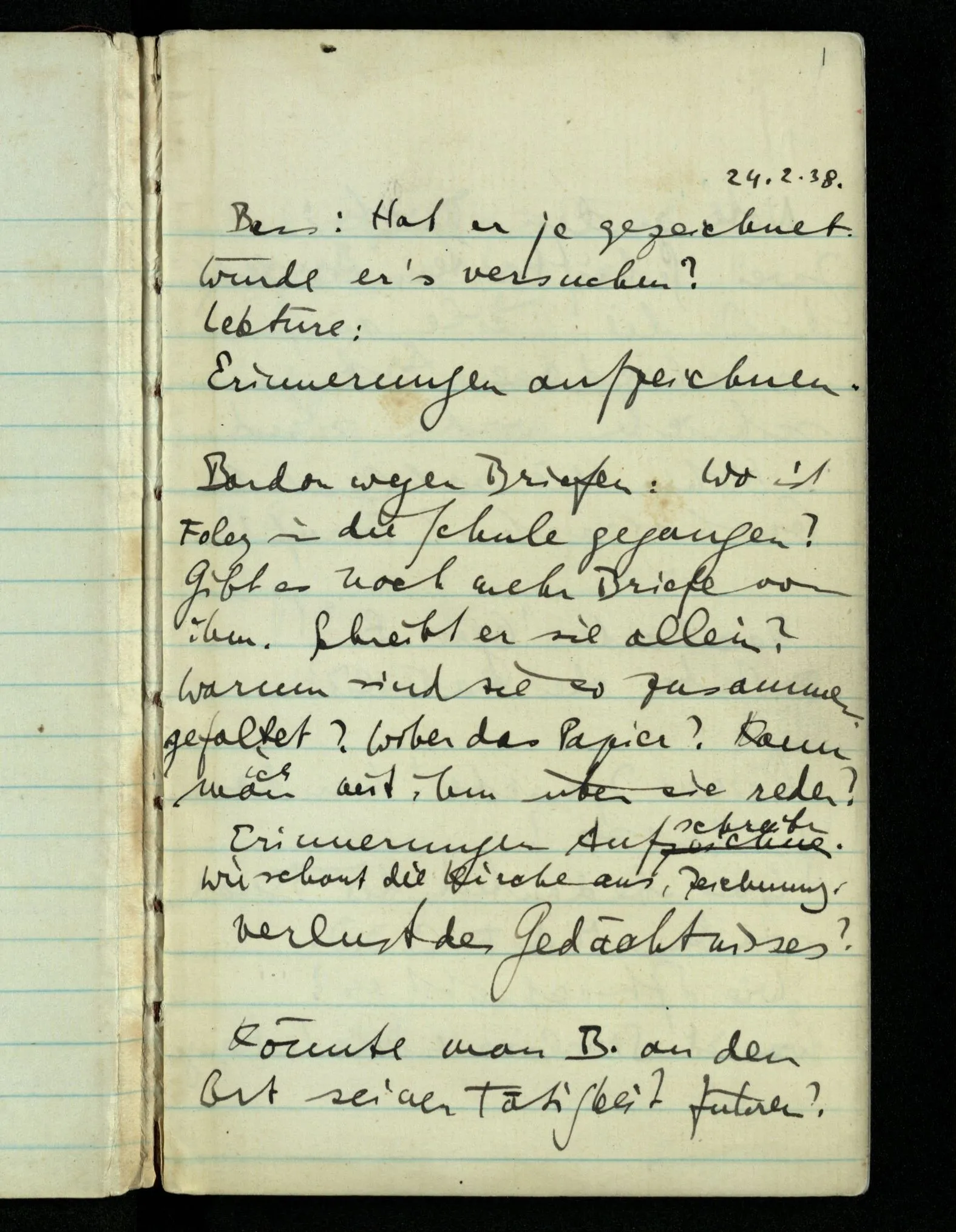 Bordon wegen Briefen: Wo ist Foley in die Schule gegangen? Gibt es noch mehr Briefe von ihm. Schreibt er sie allein? Warum sind sie so zusammengefaltet? Woher das Papier? Kann man mit ihm über sie reden? Erinnerungen aufschreiben. Wie schaut die Kirche aus, Zeichnung. Verlust des Gedächtnisses?