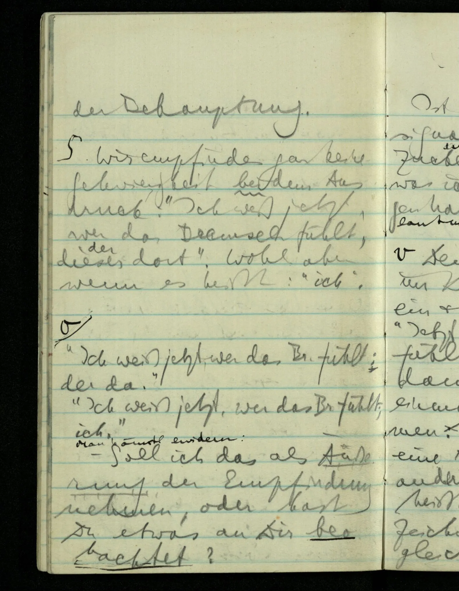 Was weißt Du eigentlich, wenn Du weißt, daß Du das Bremseln spürst? Weißt Du etwas über Dich, über Deinen Körper? Weißt Du, daß er klagt? “Aber ich bin doch nicht zweifelhaft darüber, welcher Körper klagt!” Ich bin soweit zweifelhaft darüber, als ich es sein kann.