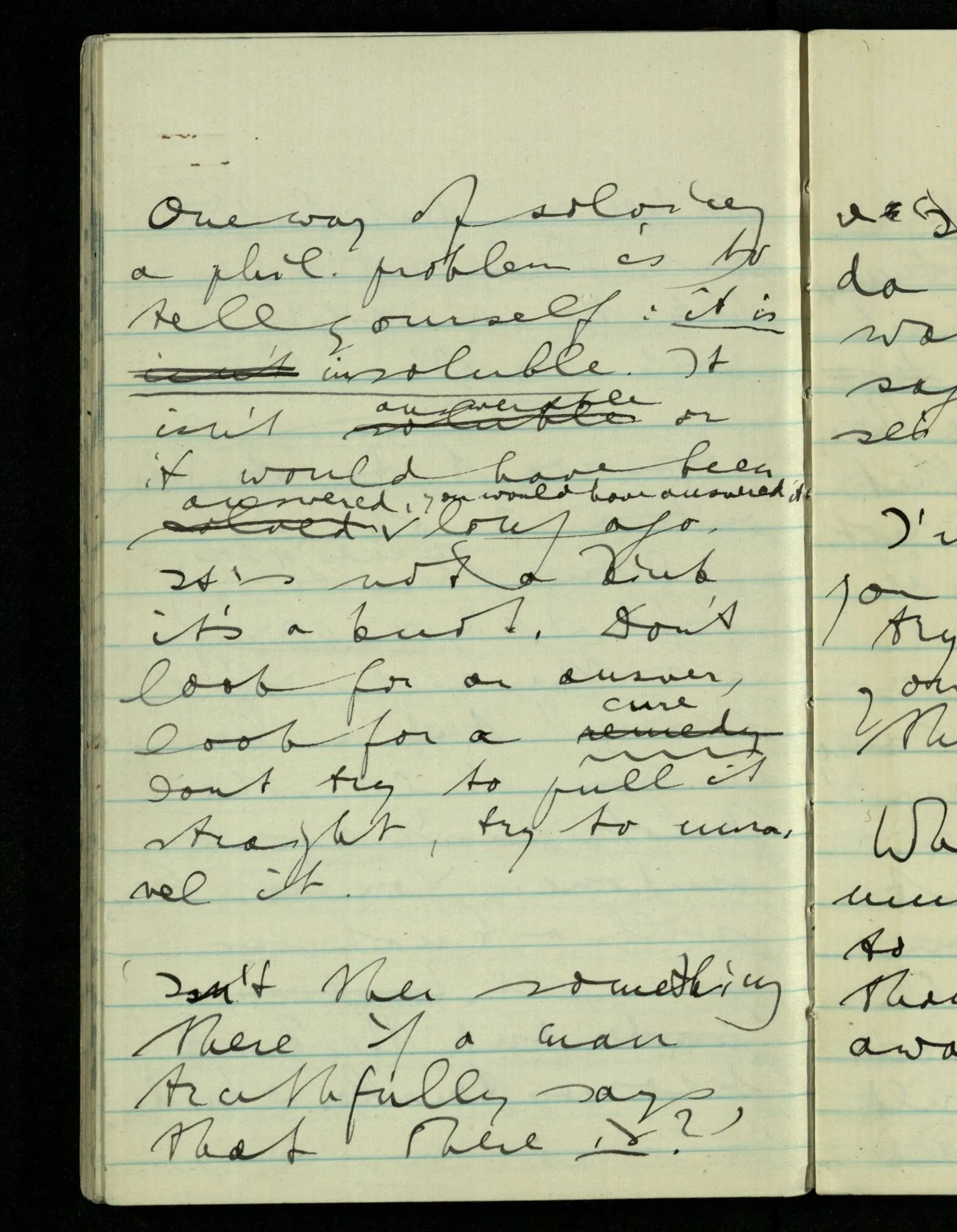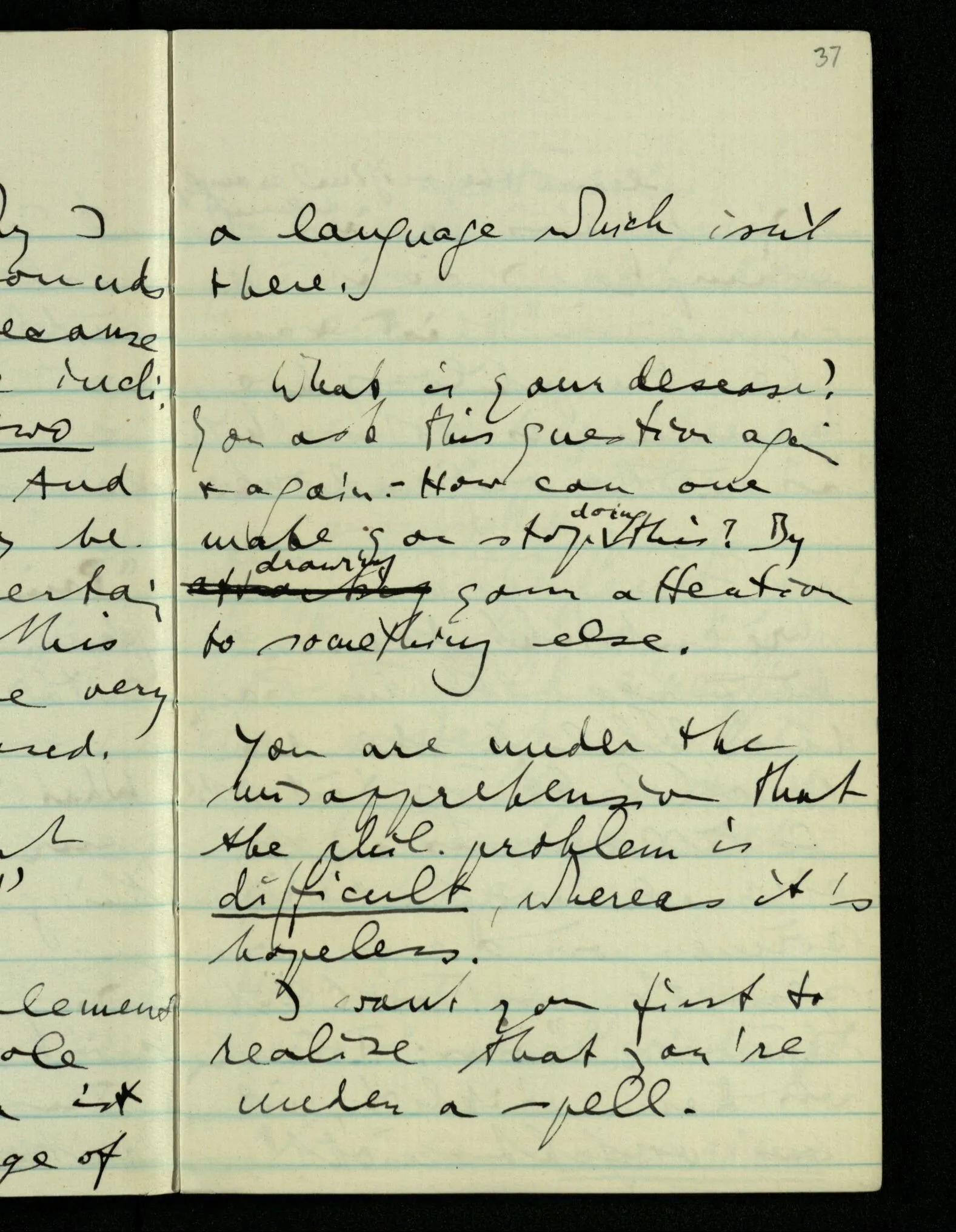 You are under the misapprehension that the philosophical problem is difficult, whereas it’s hopeless. I want you first to realise that you’re under a spell.