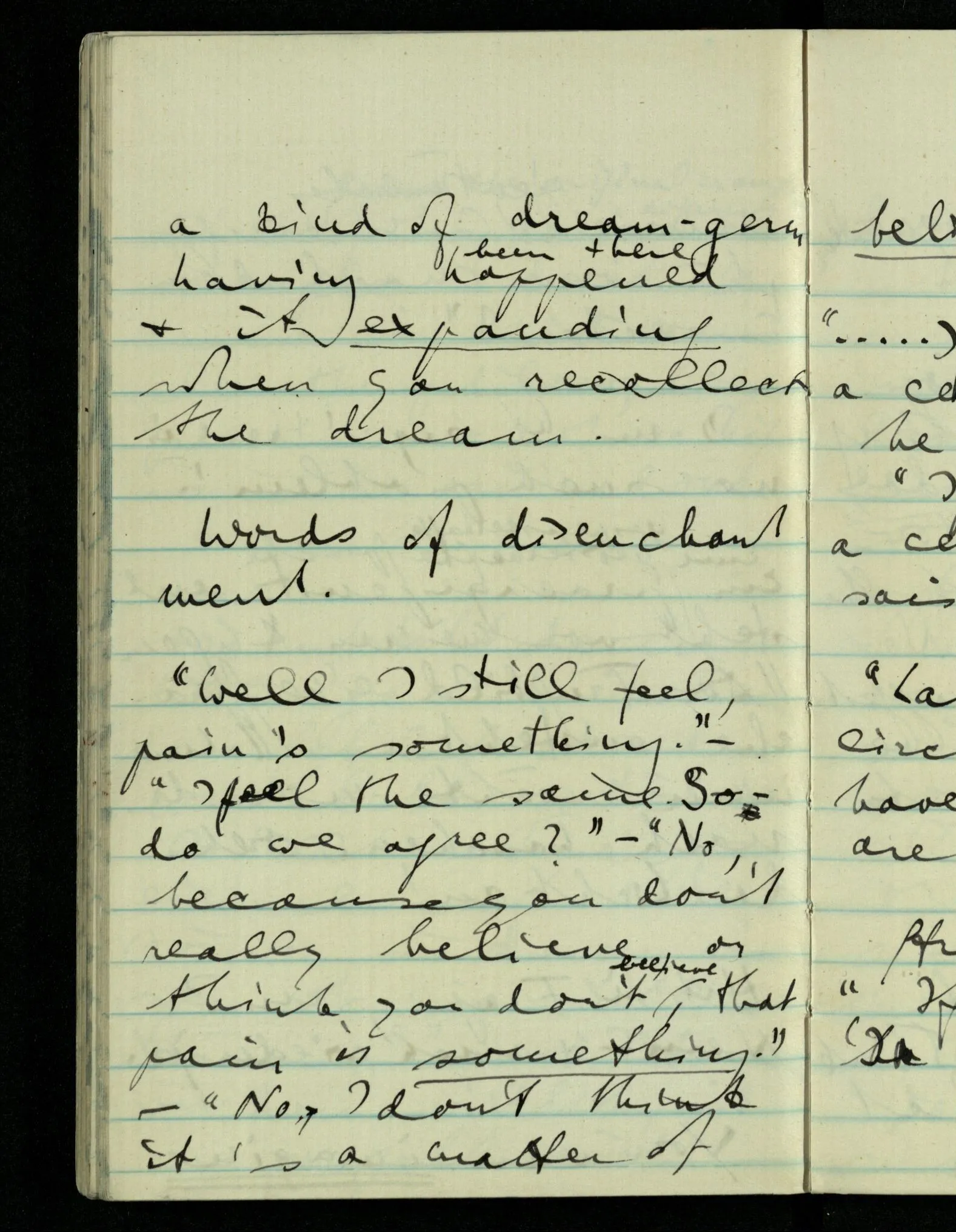 ‘Well I still feel, pain’s something.” – “I feel the same. So – do we agree?” – “No, because you don’t really believe, or think you don’t believe, that pain is something.” – “No, I don’t think it’s a matter of belief.”