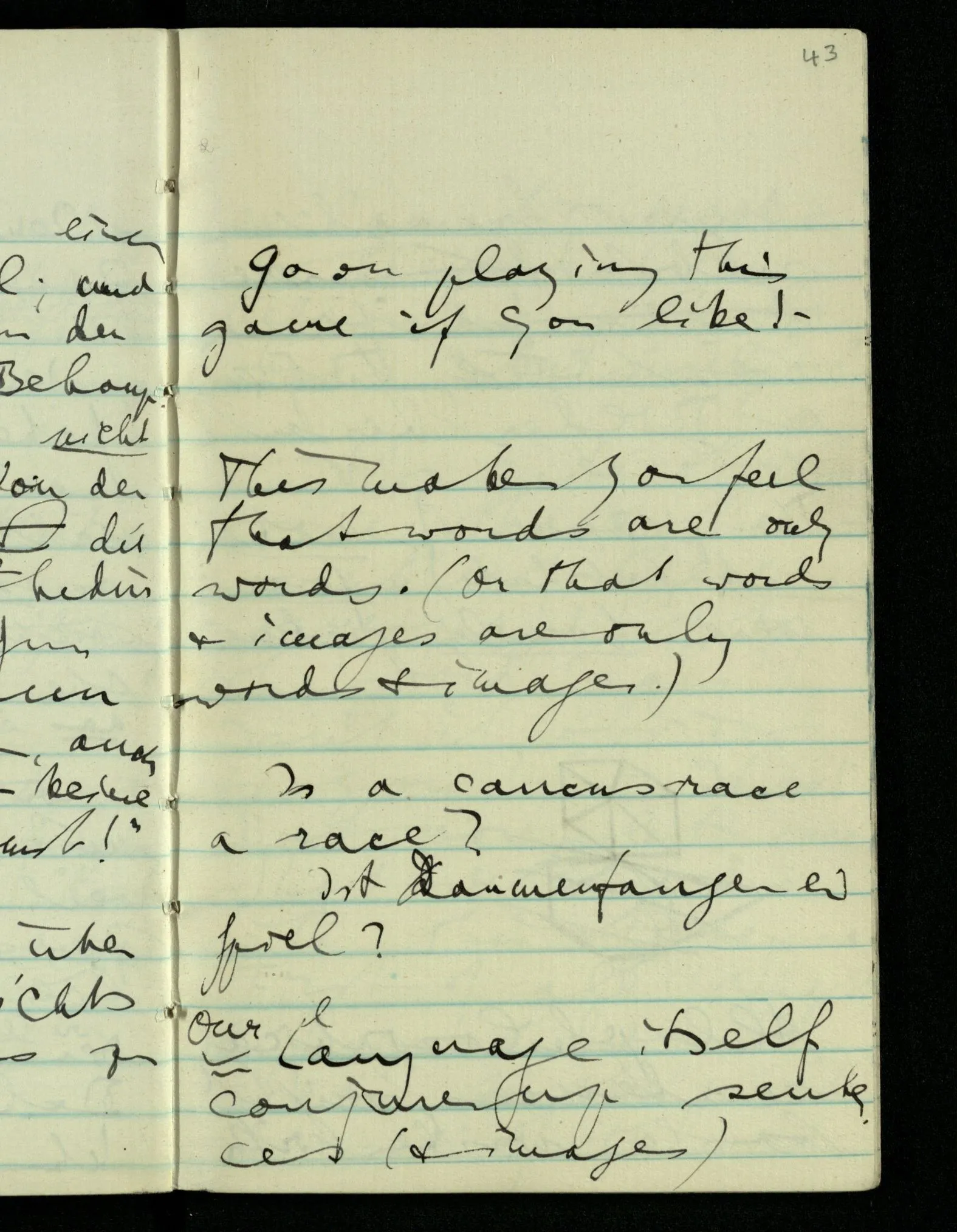 You say that it’s obvious to you that there’s something the word pain means. But you’re not satisfied, for in the next moment you think that it might be any number of things corresponding to the word “pain”, & then again that there is not anything corresponding to the word “pain” but that what seemed to correspond to it was really part of the experience of saying it; etc.. In other words the pictures vary & replace one another, the language game however remains, only it doesn’t really seem to interest us. If it did we wouldn’t philosophize.