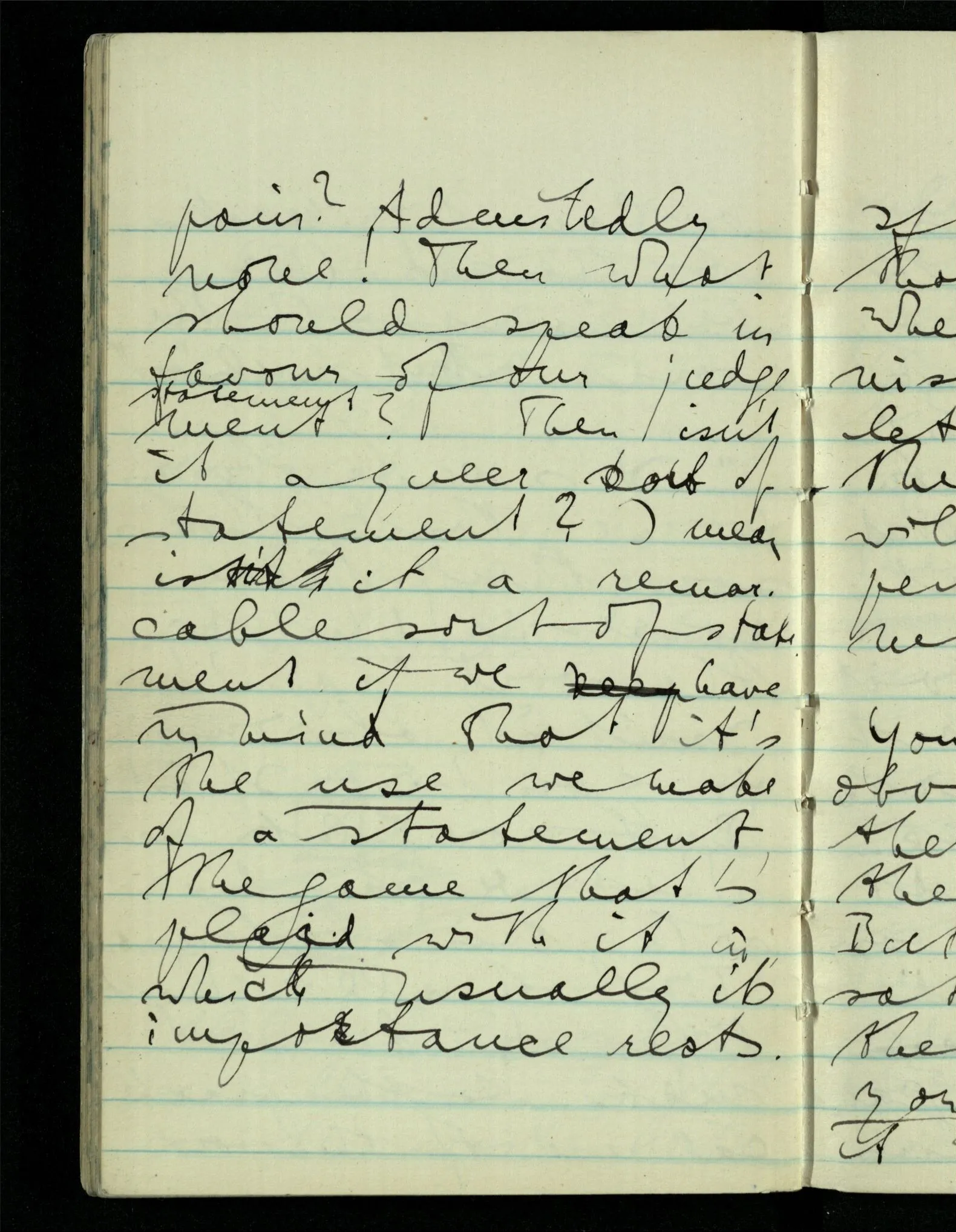 “It’s quite obvious to me that there’s something there corresponding to the word ‘pain’! Isn’t it obvious to you? –” – It is! But now let’s see what we can do with this statement. First of all: What difference does it make to the practical use of the word “pain”? Admittedly none! Then what should speak in favour of our judgement? Then isn’t it a queer sort of statement? I mean isn’t it a remarkable sort of statement if we have in mind that it’s the use we make of a statement, the game that’s played with it in which usually its importance rests.