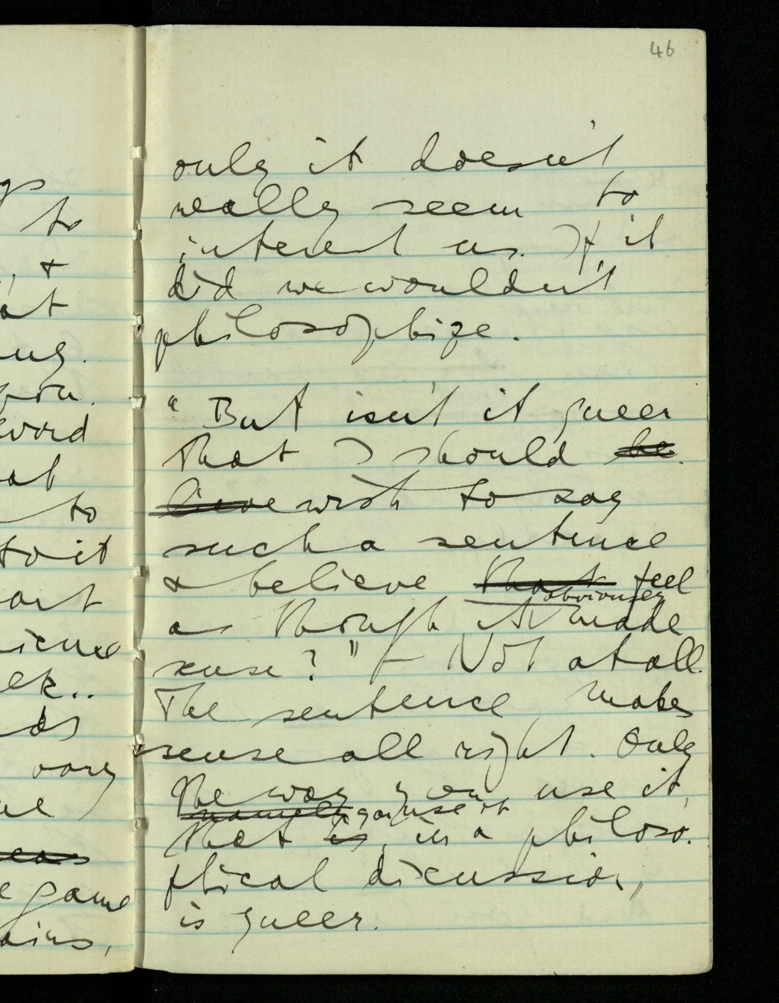 “But isn’t it queer that I should wish to say such a sentence & feel as though it obviously made sense?” – Not at all. The sentence makes sense all right. Only the way you use it, that you use it in a philosophical discussion, is queer.