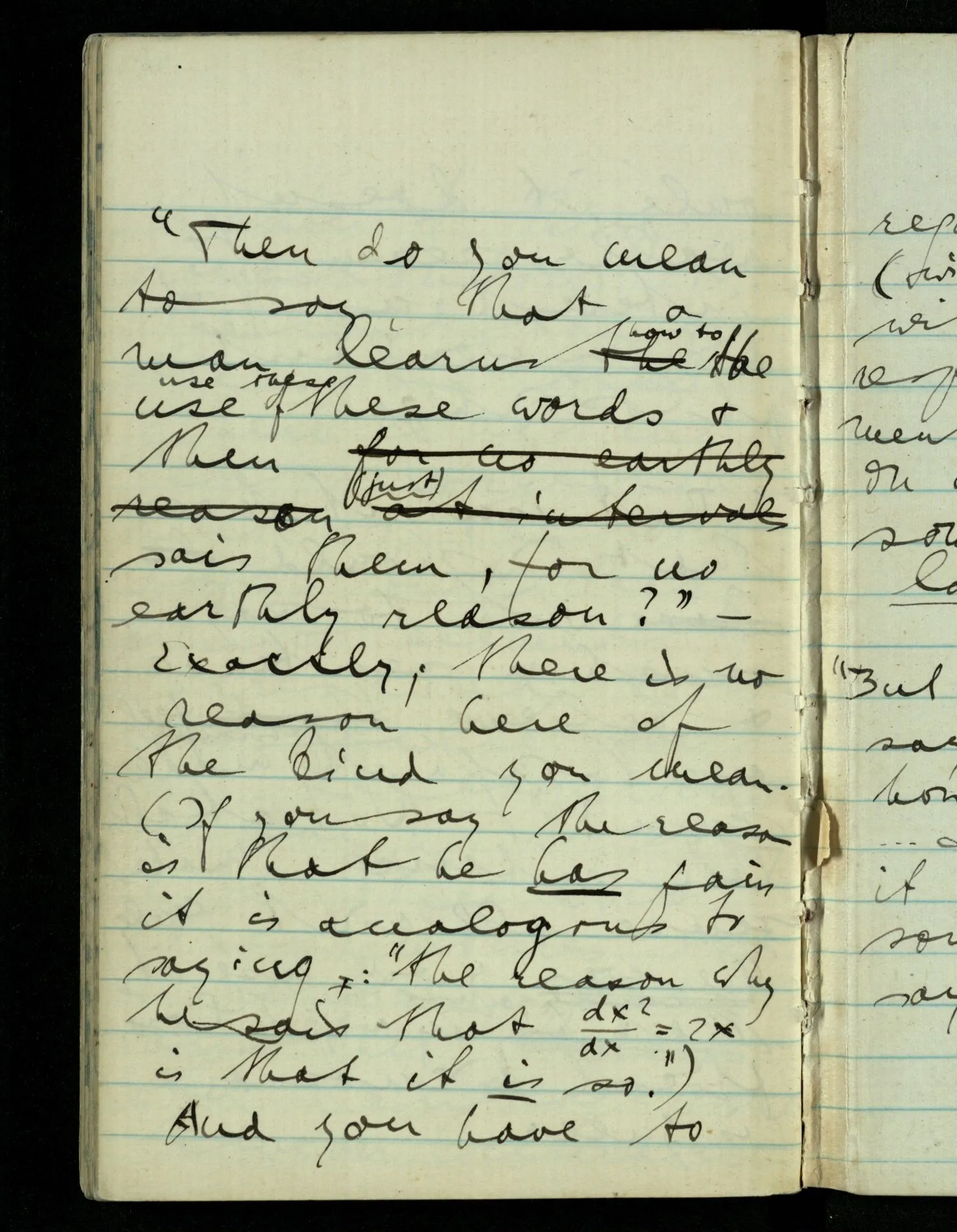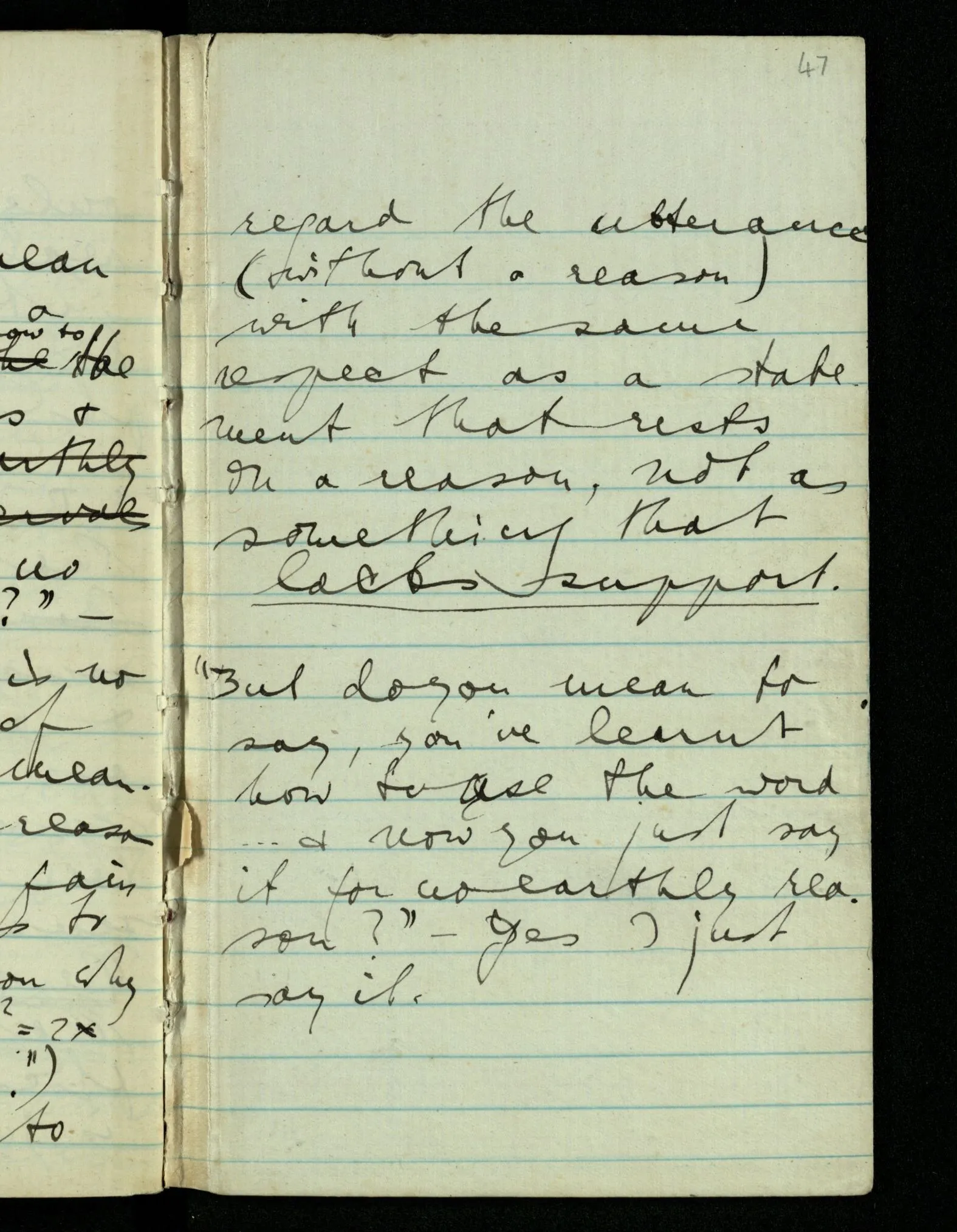 “Then do you mean to say, that a man learns how to use these words & then (just) says them, for no earthly reason?” – Exactly; there is no reason here of the kind you mean. (If you say the reason is that he has pain it is analogous to saying: “the reason why he says that is that it is so.”) And you have to regard the utterance (without a reason) with the same respect as a statement that rests on a reason, not as something that lacks support.
