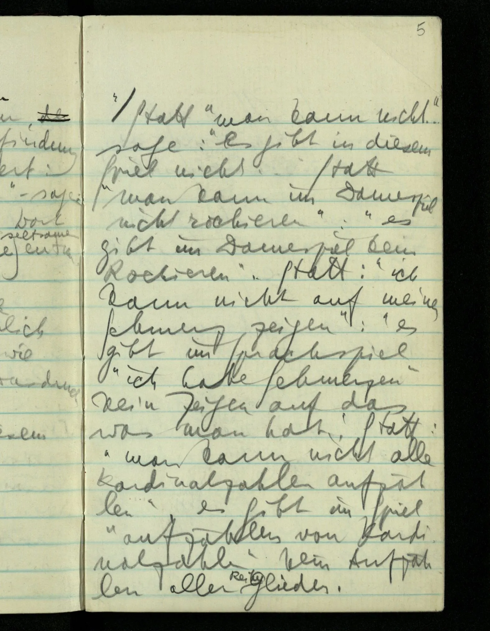 Statt “man kann nicht” sagen: “es gibt in diesem Spiel nicht …” Statt “man kann im Damespiel nicht rochieren”: “es gibt im Damespiel kein Rochieren”. Statt: “ich kann nicht auf meinen Schmerz zeigen”: “es gibt im Sprachspiel “ich habe Schmerzen” kein Zeigen auf das was man hat.” Statt “man kann nicht alle Kardinalzahlen aufzählen”, es gibt im Spiel “aufzählen von Kardinalzahlen” kein Aufzählen aller Reihen-Glieder. ‘Wissen’ heißt nach gewissen Kriterien vorgehen & zu einem Ergebnis gelangt sein.