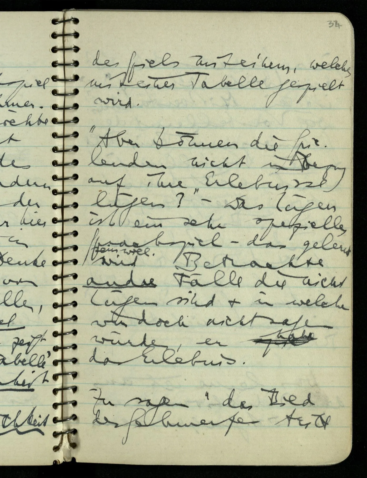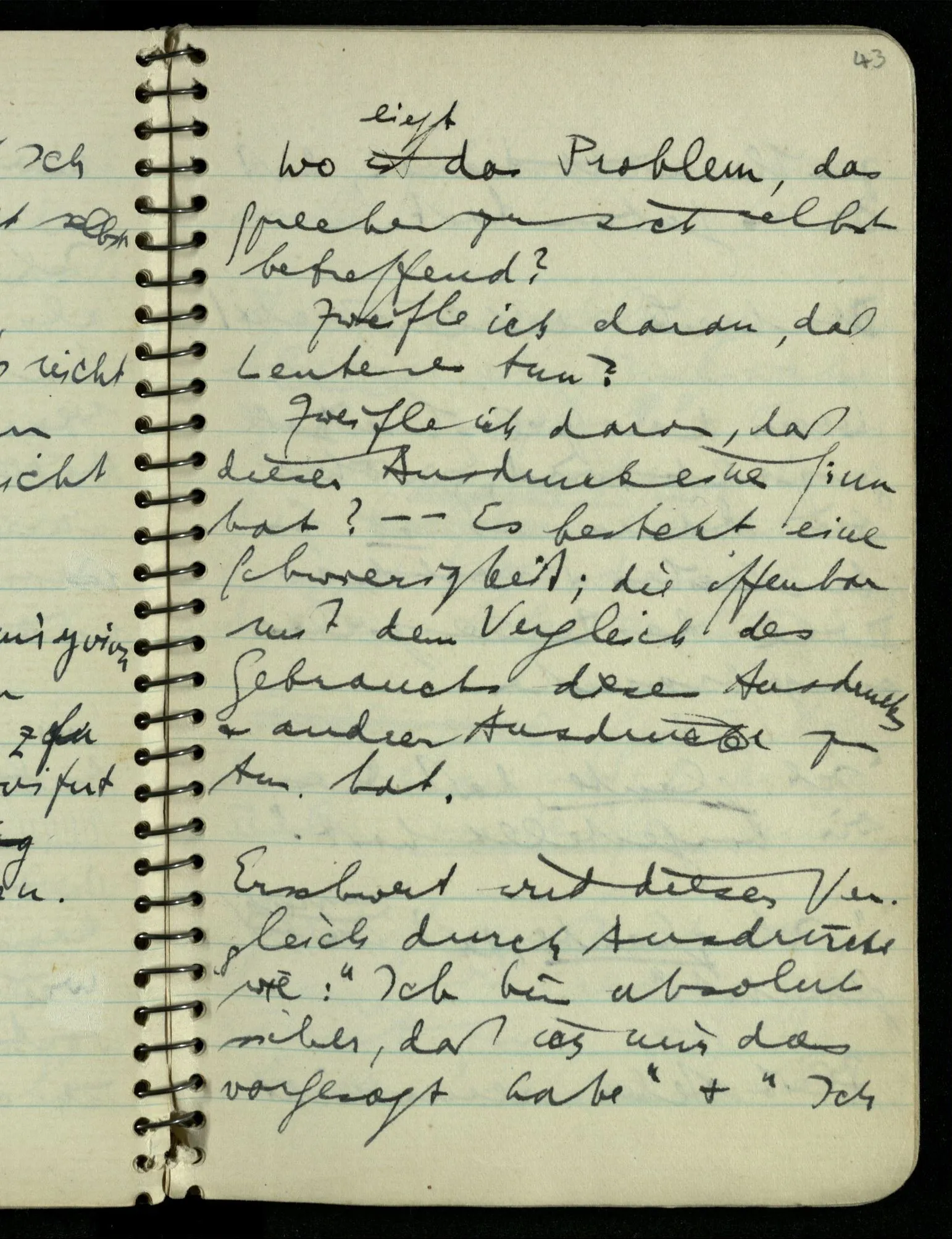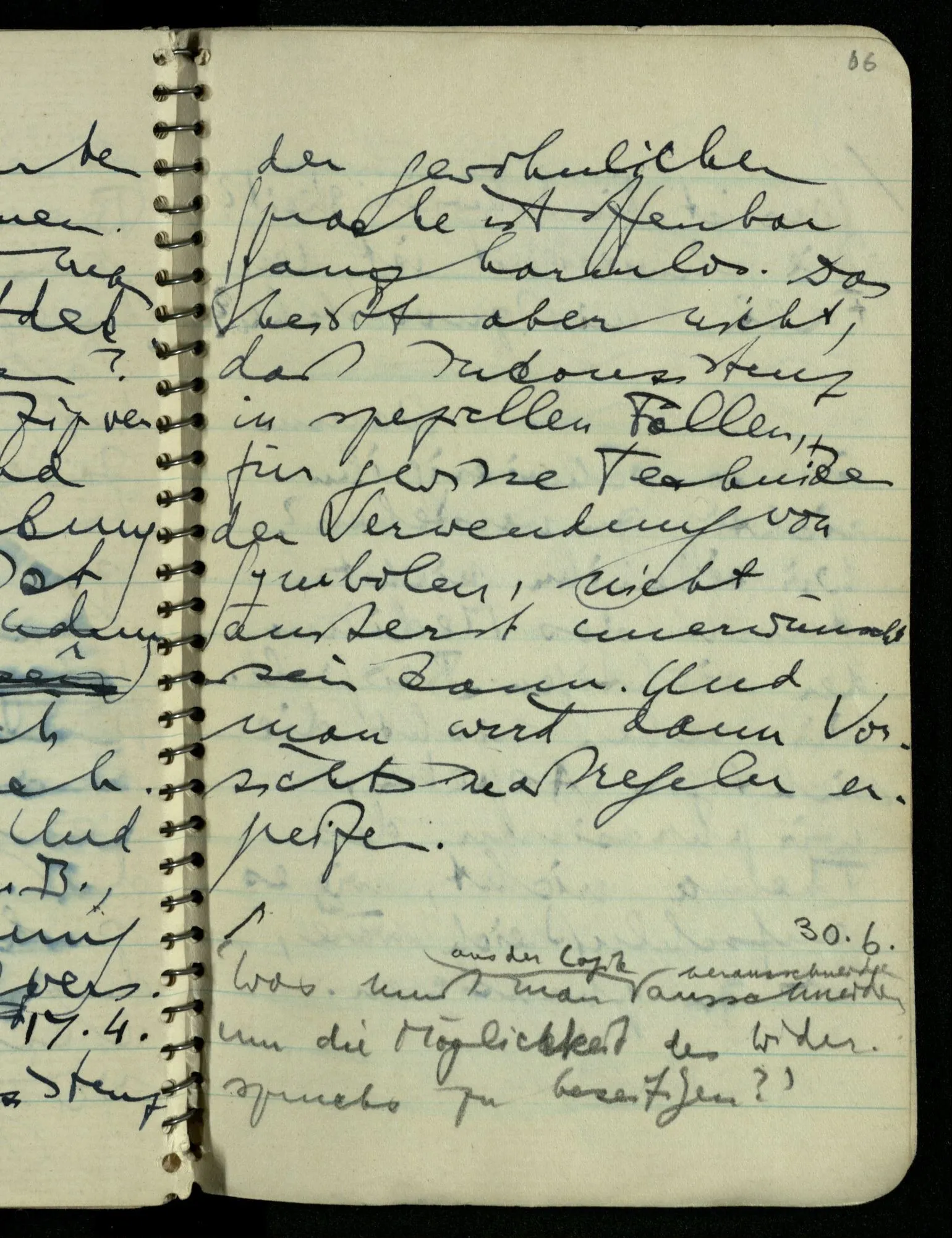 17.04.1940 Die Inkonsistenz der gewöhnlichen Sprache ist offenbar ganz harmlos. Das heißt aber nicht, daß Inkonsistenz in speziellen Fällen, für gewisse Techniken der Verwendung von Symbolen, nicht äußerst unerwünscht sein kann. Und man wird dann Vorsichtsmaßregeln ergreifen.