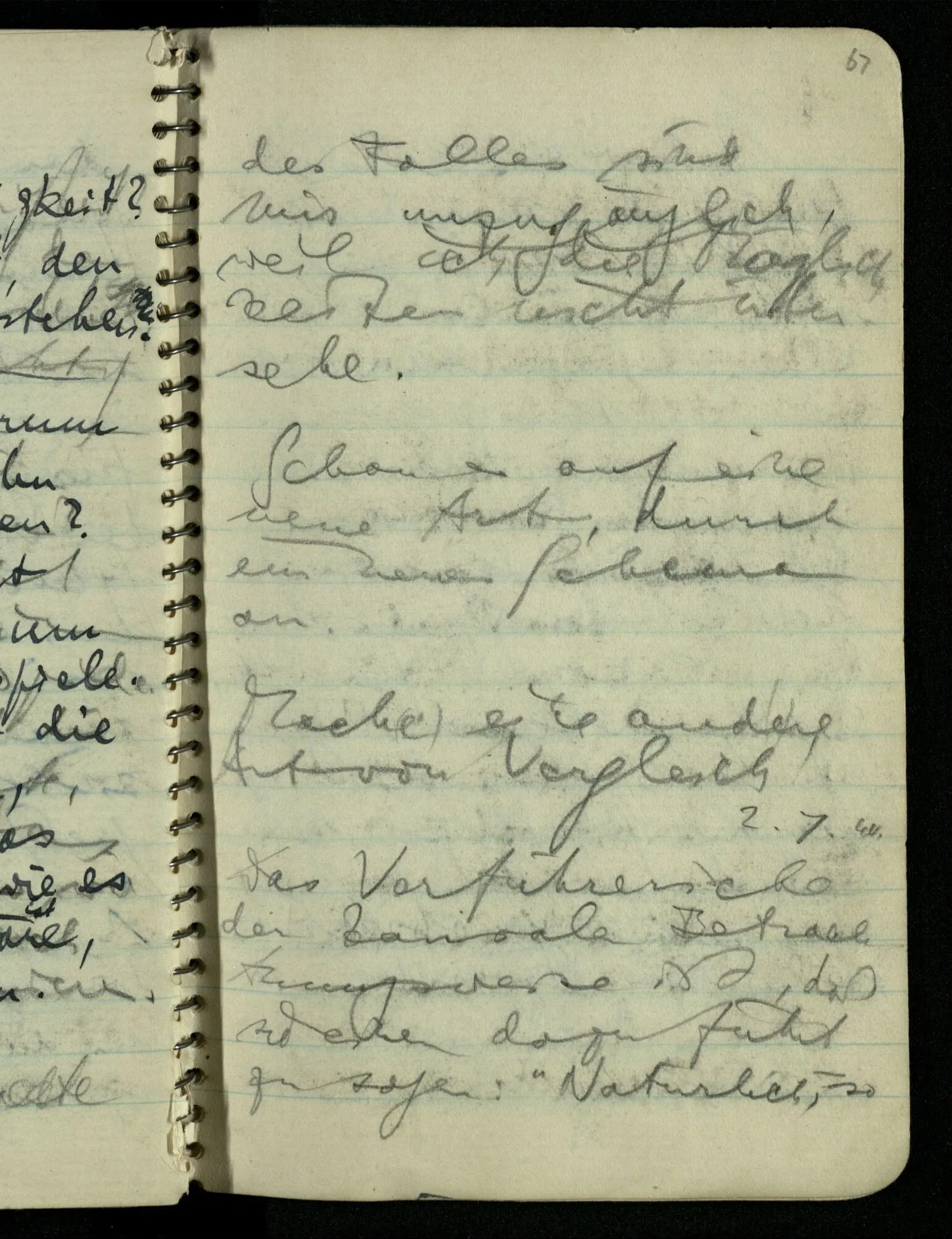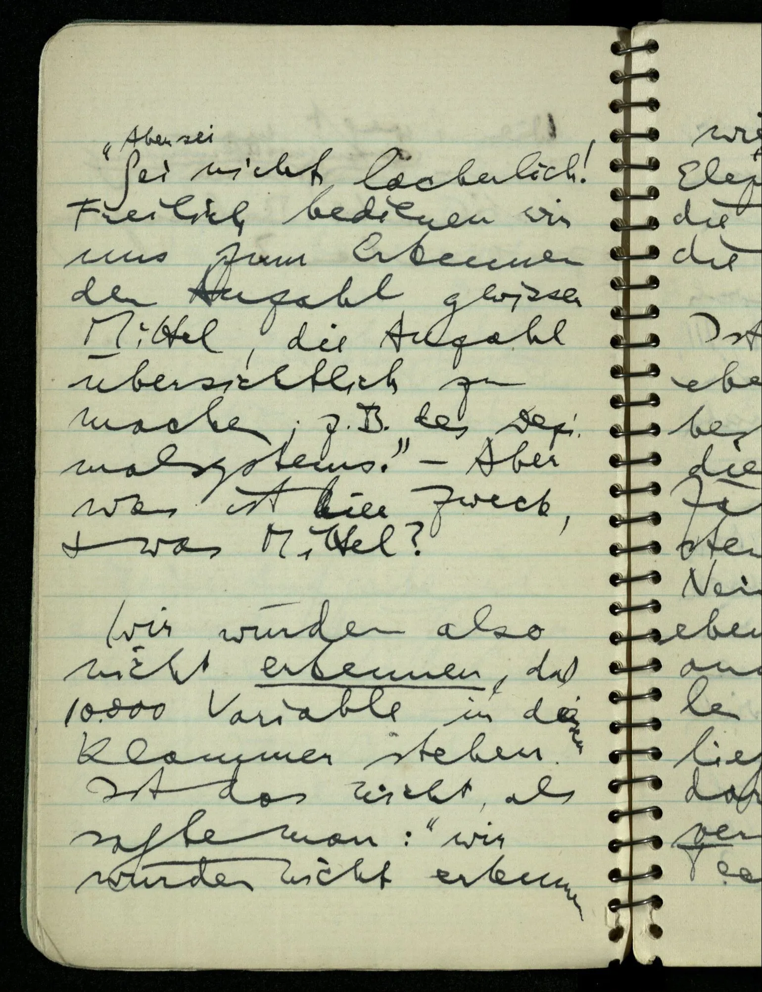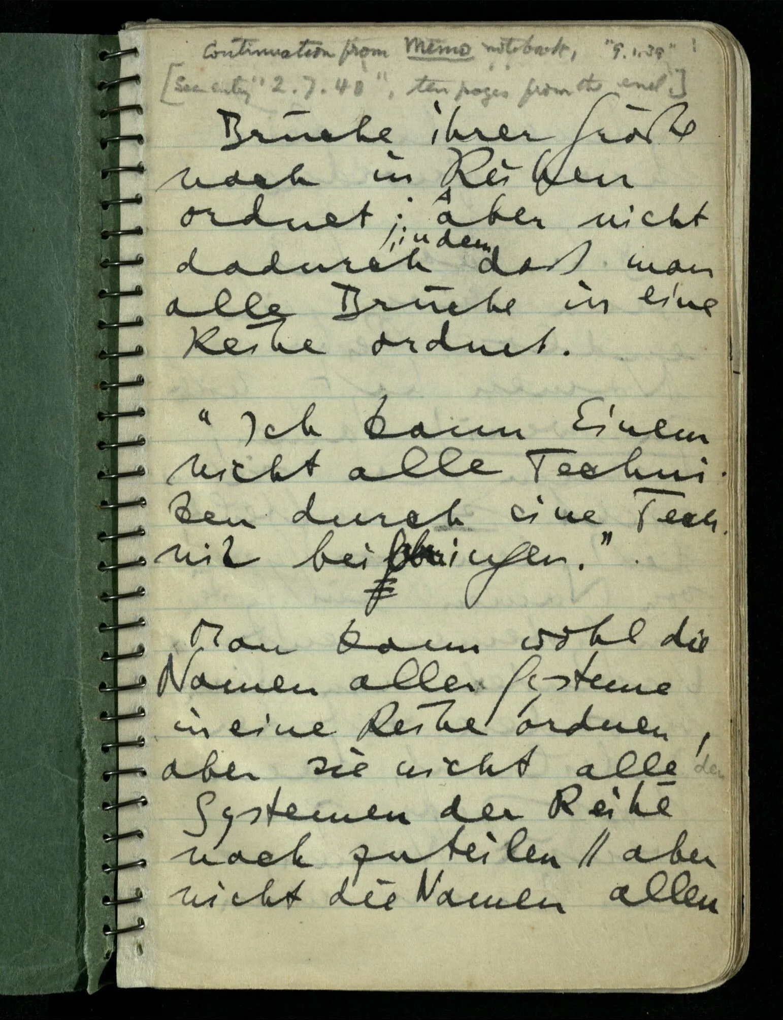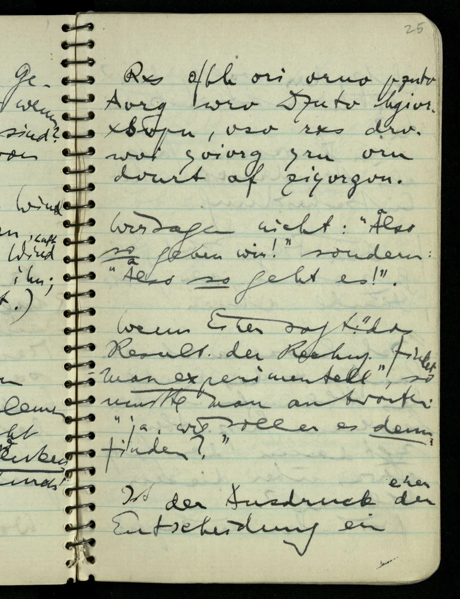 02.07.1940 Das Verführerische der kausalen Betrachtungsweise ist, daß sie einen dazu führt zu sagen: “Natürlich, so muß es geschehen.” Während man denken sollte: so, & auf viele andere Weisen kann es geschehen sein.