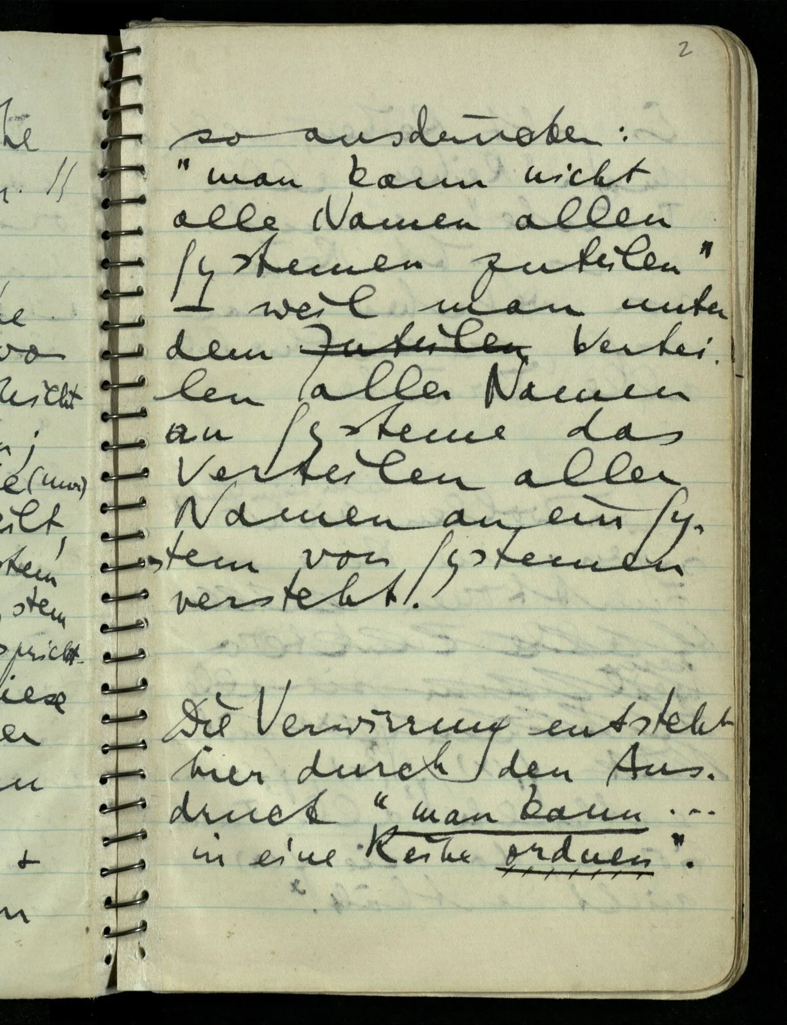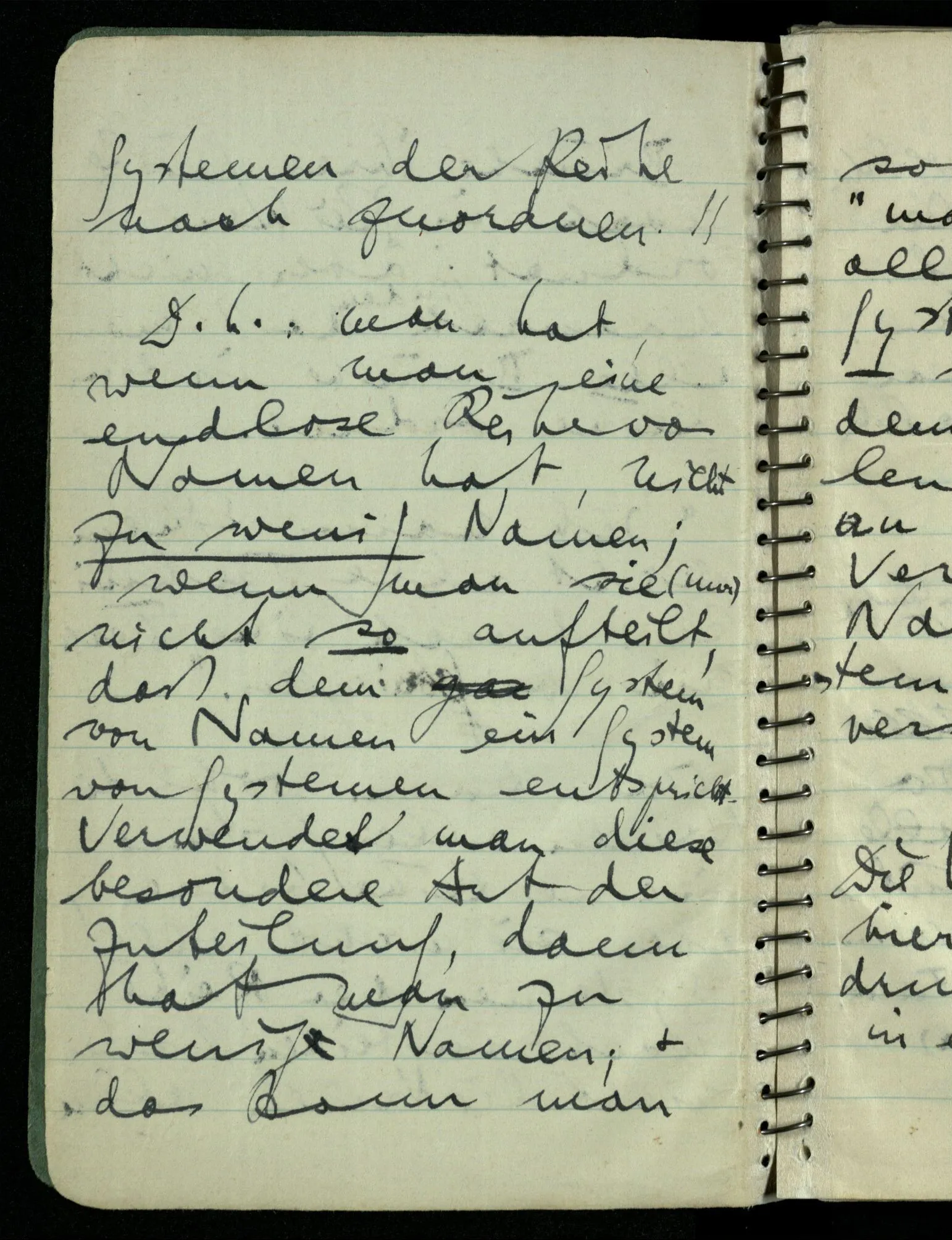 D.h. man hat, wenn man eine endlose Reihe von Namen hat, nicht zu wenig Namen; wenn man sie (nur) nicht so aufteilt, daß dem System von Namen ein System von Systemen entspricht. Verwendet man diese besondere Art der Zuteilung, dann hat man zu wenig Namen; und das kann man so ausdrücken: “man kann nicht alle Namen allen Systemen zuteilen” – weil man unter dem Verteilen aller Namen an Systeme das Verteilen aller Namen an ein System von Systemen versteht.