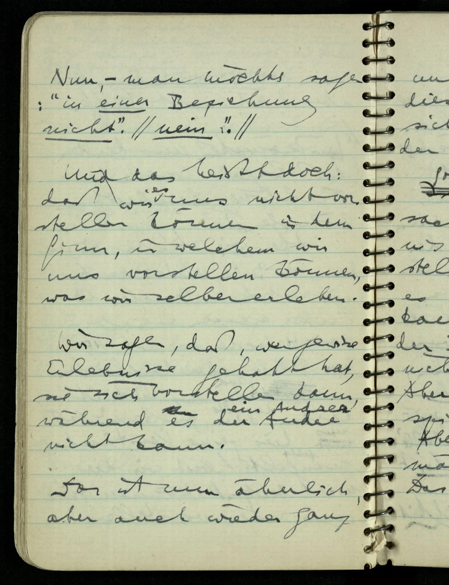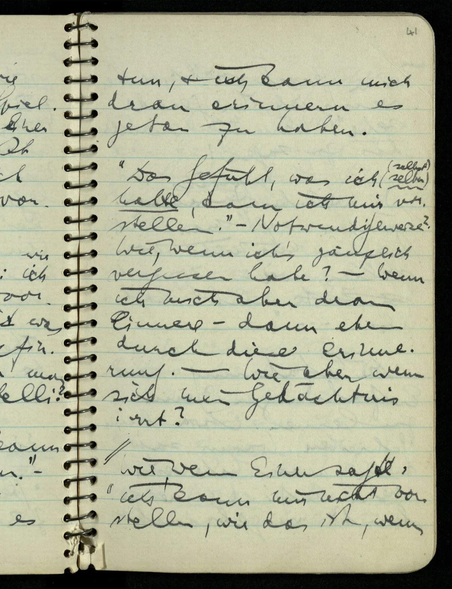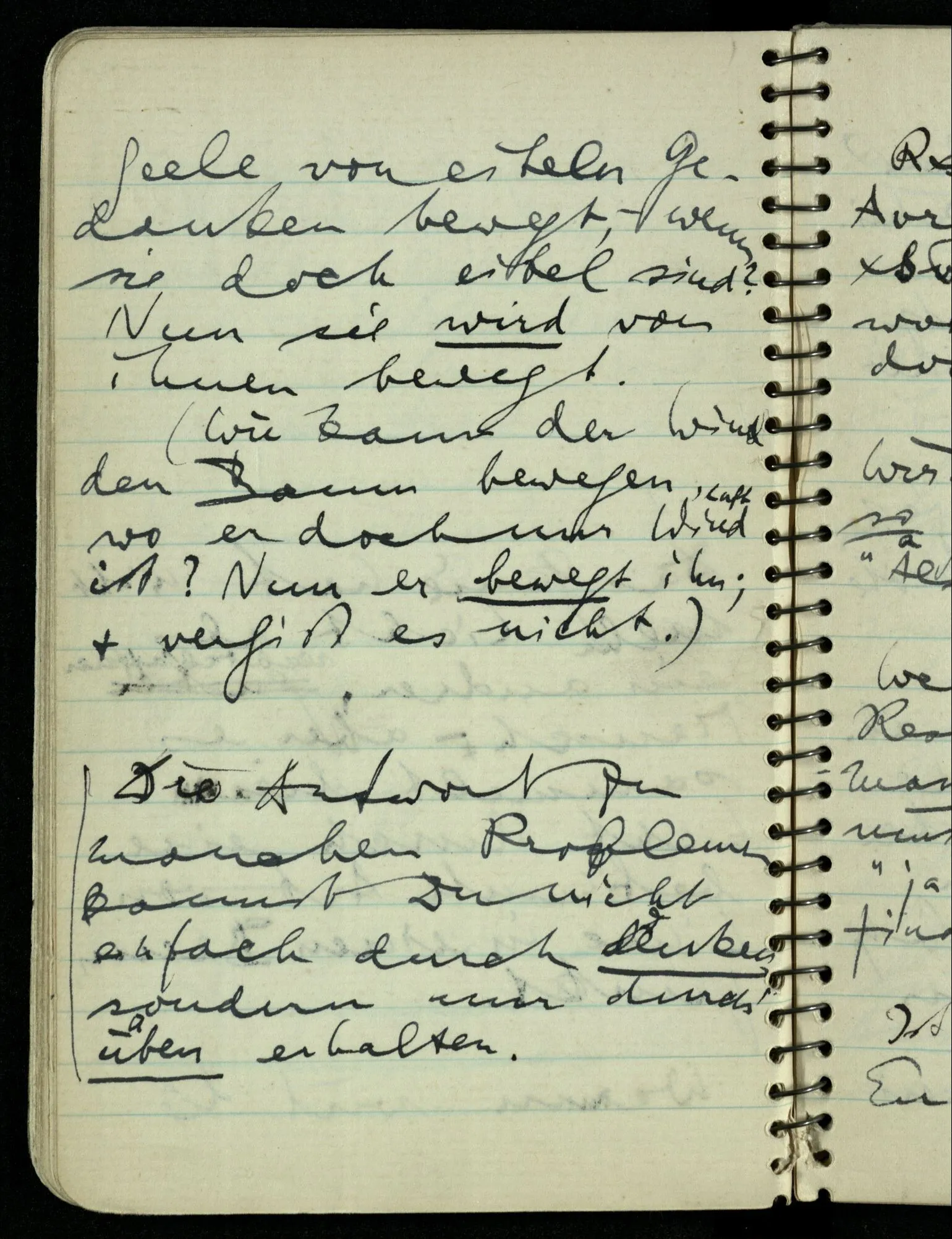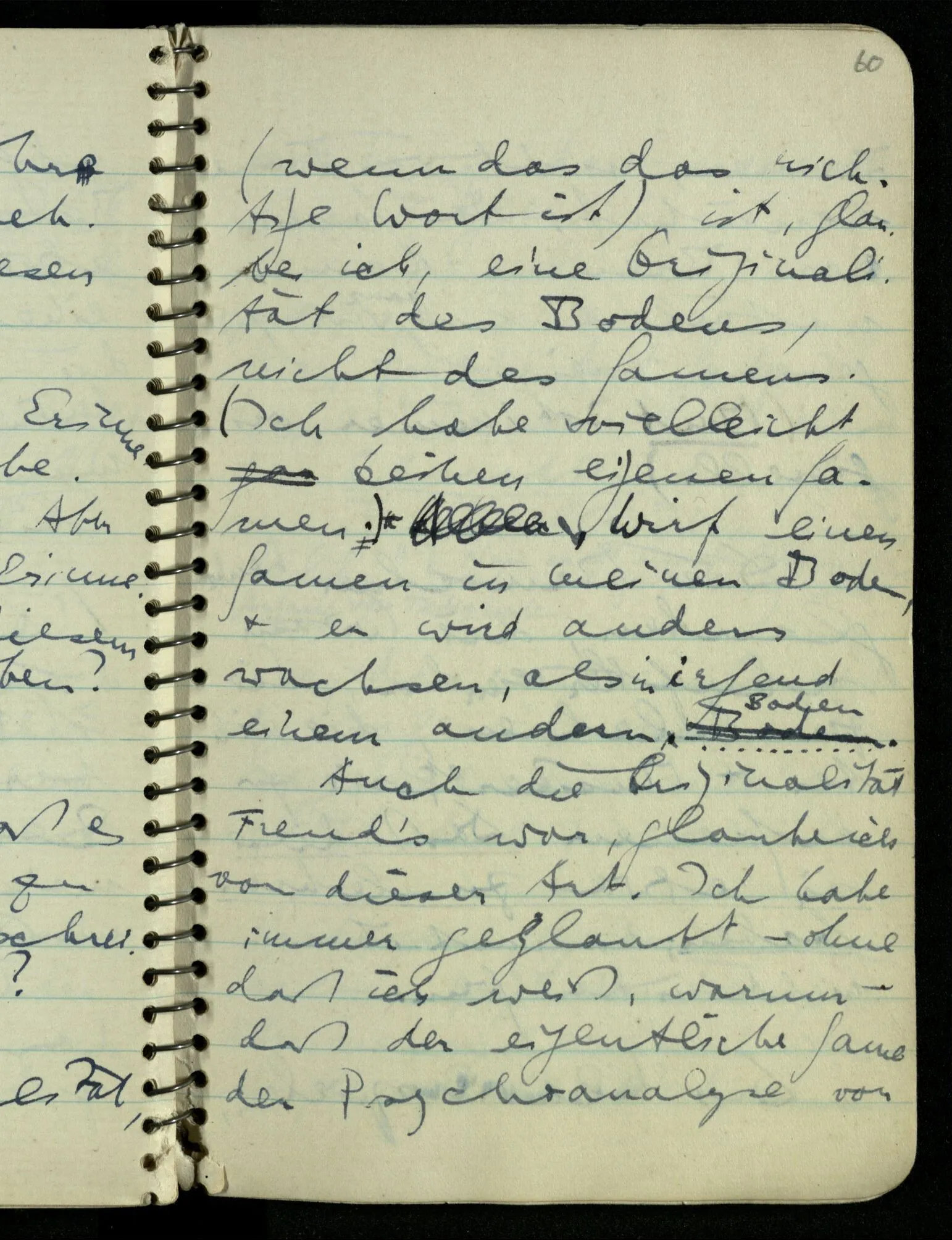 Meine Originalität, (wenn das das richtige Wort ist), ist, glaube ich, eine Originalität des Bodens, nicht des Samens. (Ich habe vielleicht keinen eigenen Samen.) Wirf einen Samen in meinen Boden, & er wird anders wachsen, als in irgend einem andern Boden. Auch die Originalität Freud’s war, glaube ich, von dieser Art. Ich habe immer geglaubt – ohne daß ich weiß, warum – daß der eigentliche Same der Psychoanalyse von Breuer, nicht von Freud herrührt. Das Samenkorn Breuers kann natürlich nur ganz winzig gewesen sein. (Mut ist immer originell.)