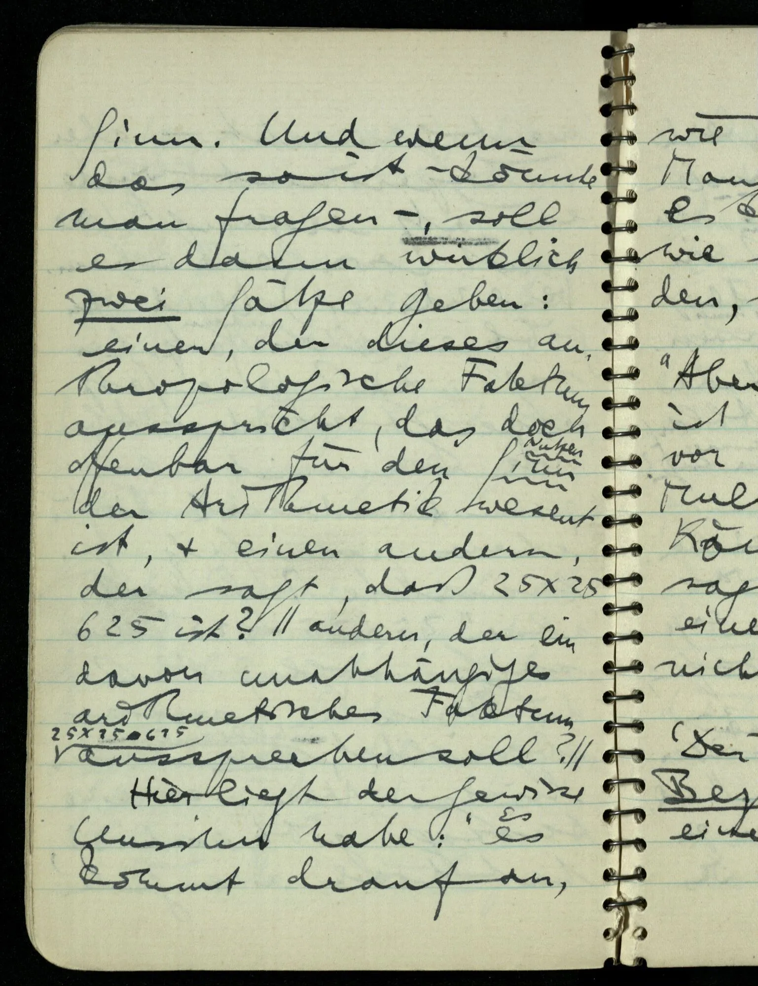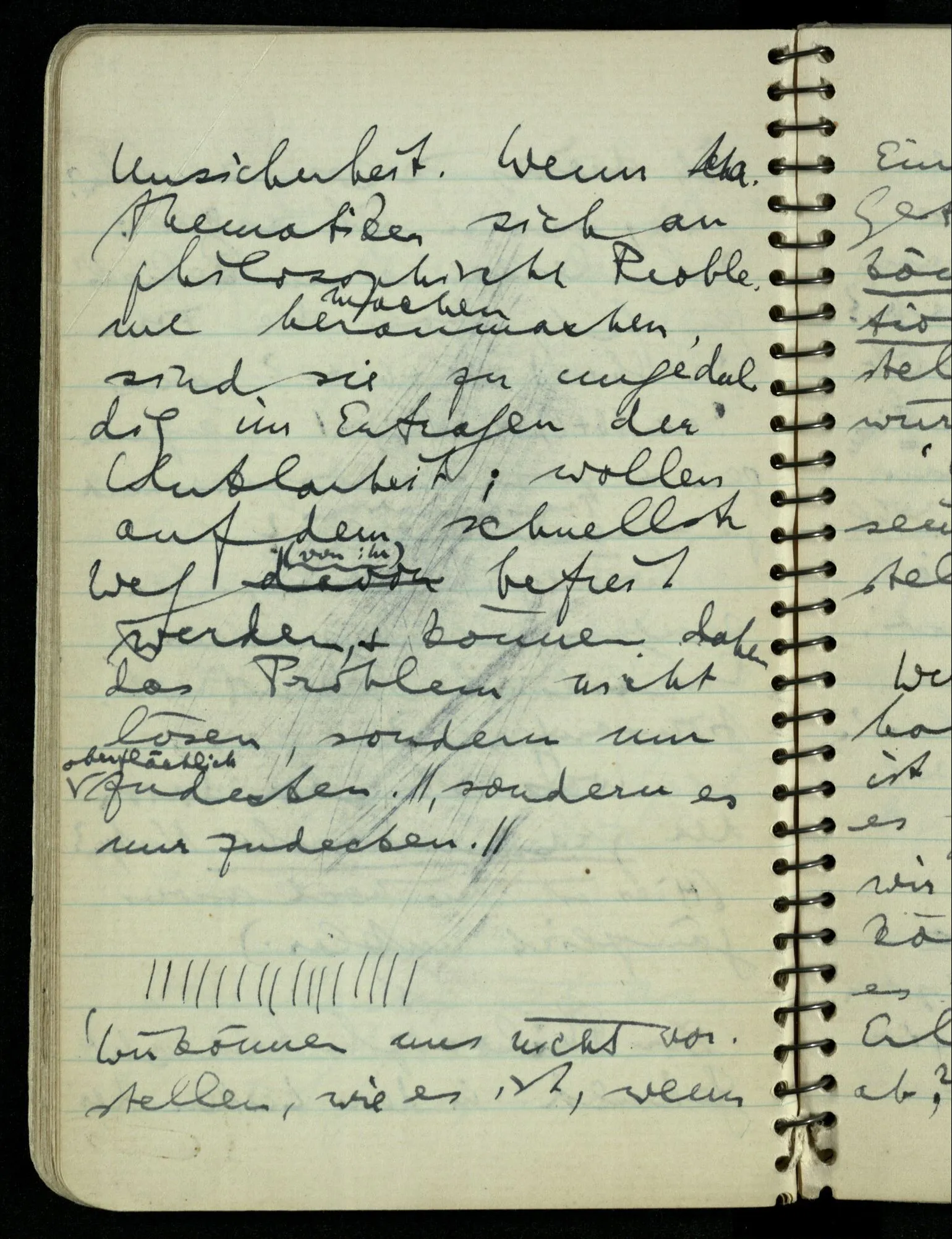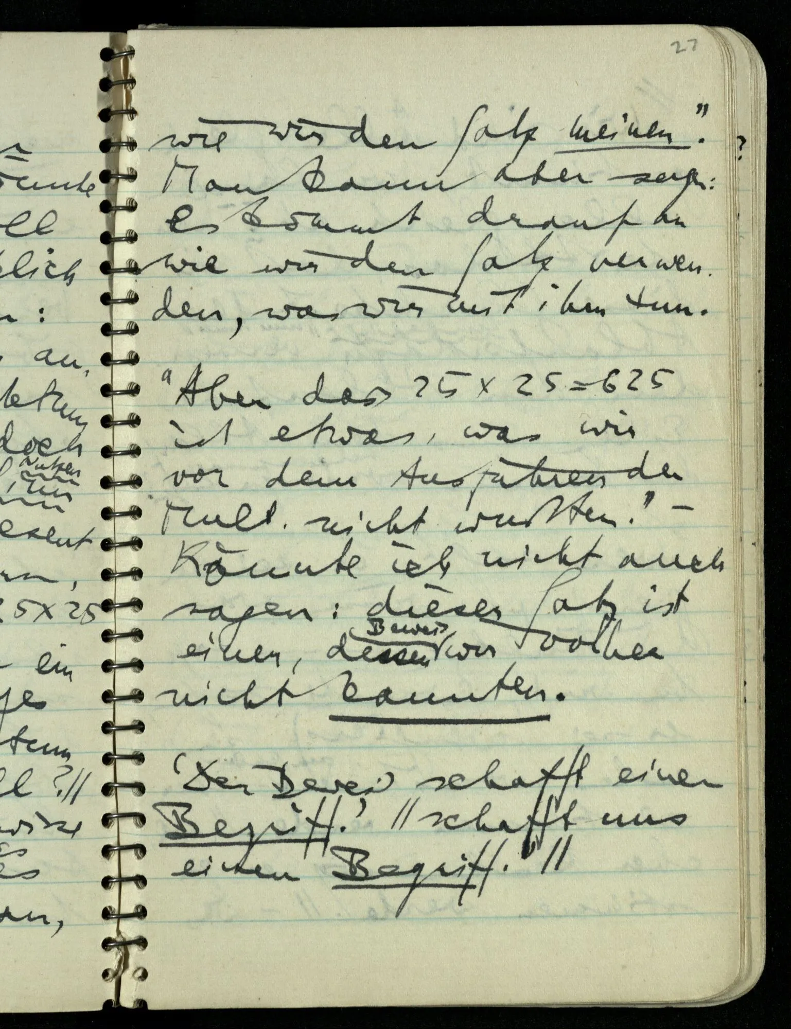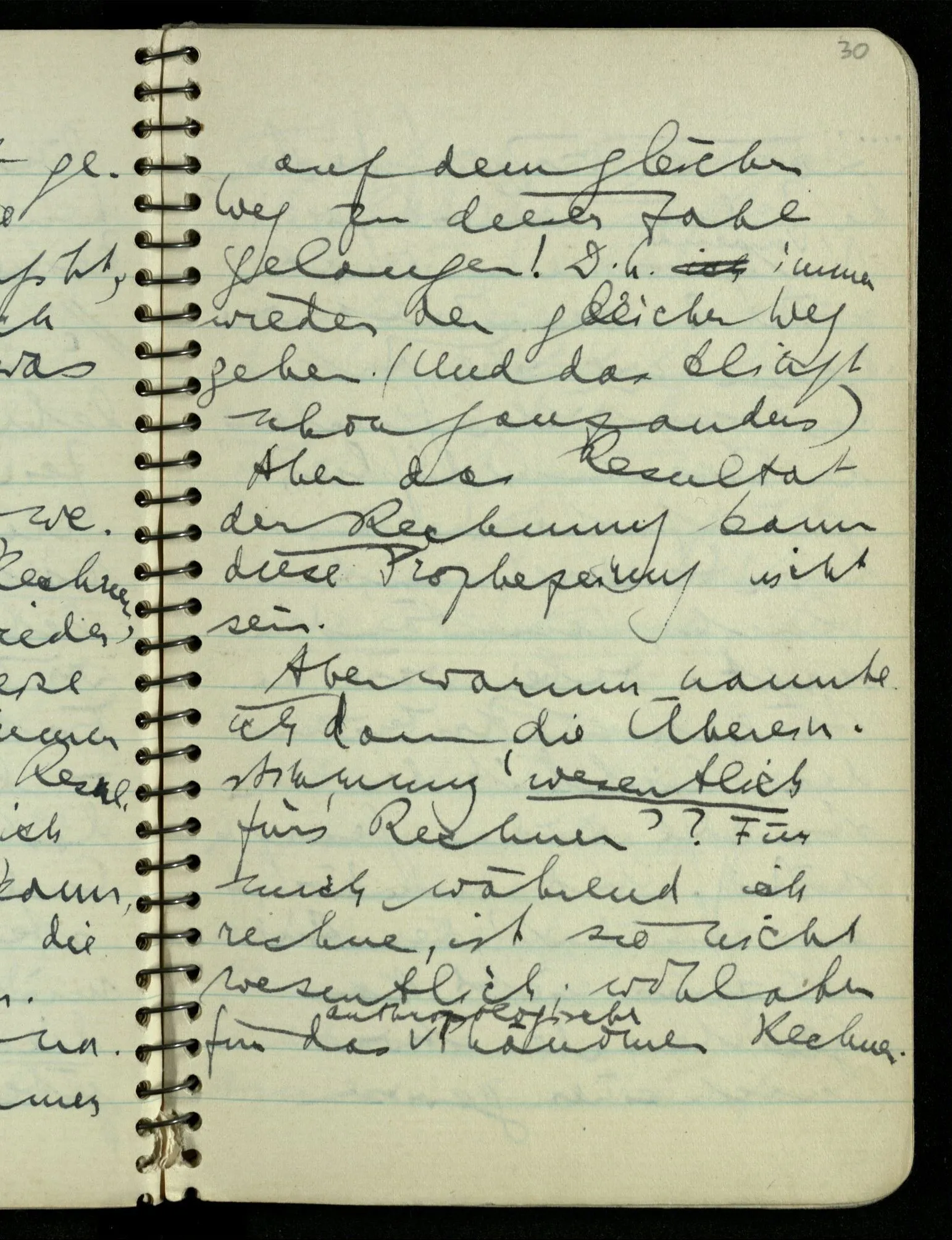 “Es sollte doch wieder das Gleiche herauskommen; & es kommt etwas andres heraus!” – Ich muß mich verrechnet haben. Angenommen, dann finde ich, ich habe mich nicht verrechnet, sondern etwas in den Prinzipien meines Kalküls übersehen – was ist das für eine Änderung? Muß ich die neue Entdeckung annehmen?