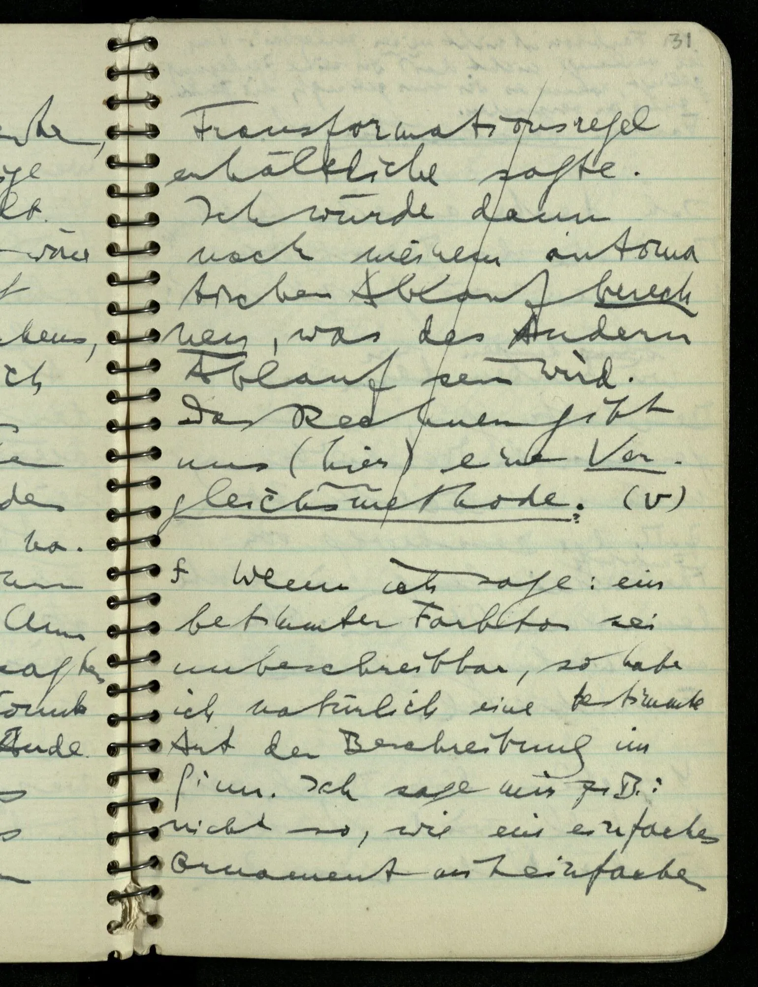 10.04.1940 Die Erfindung eines Mechanismus zur Erzeugung irgend einer gewünschten Bewegung; ist sie auch eine physikalische Entdeckung? Sagt der, der auf die Idee kommt, Zahnräder, Hebel & Stangen so & so zu verbinden, er habe eine neue physikalische Entdeckung gemacht? Freilich entdeckt er daß sich Maschinenteile in dieser neuen Verbindung so wie gewöhnlich, & wie zu erwarten war, benehmen. Aber nennt man das: eine Entdeckung machen? Hat wer den Zipverschluß erfand, so eine Entdeckung gemacht? Ist so eine Erfindung nicht in einer Weise ähnlich der einer Rechnungsweise? Und verschieden, z.B., von der Erfindung des Schießpulvers.