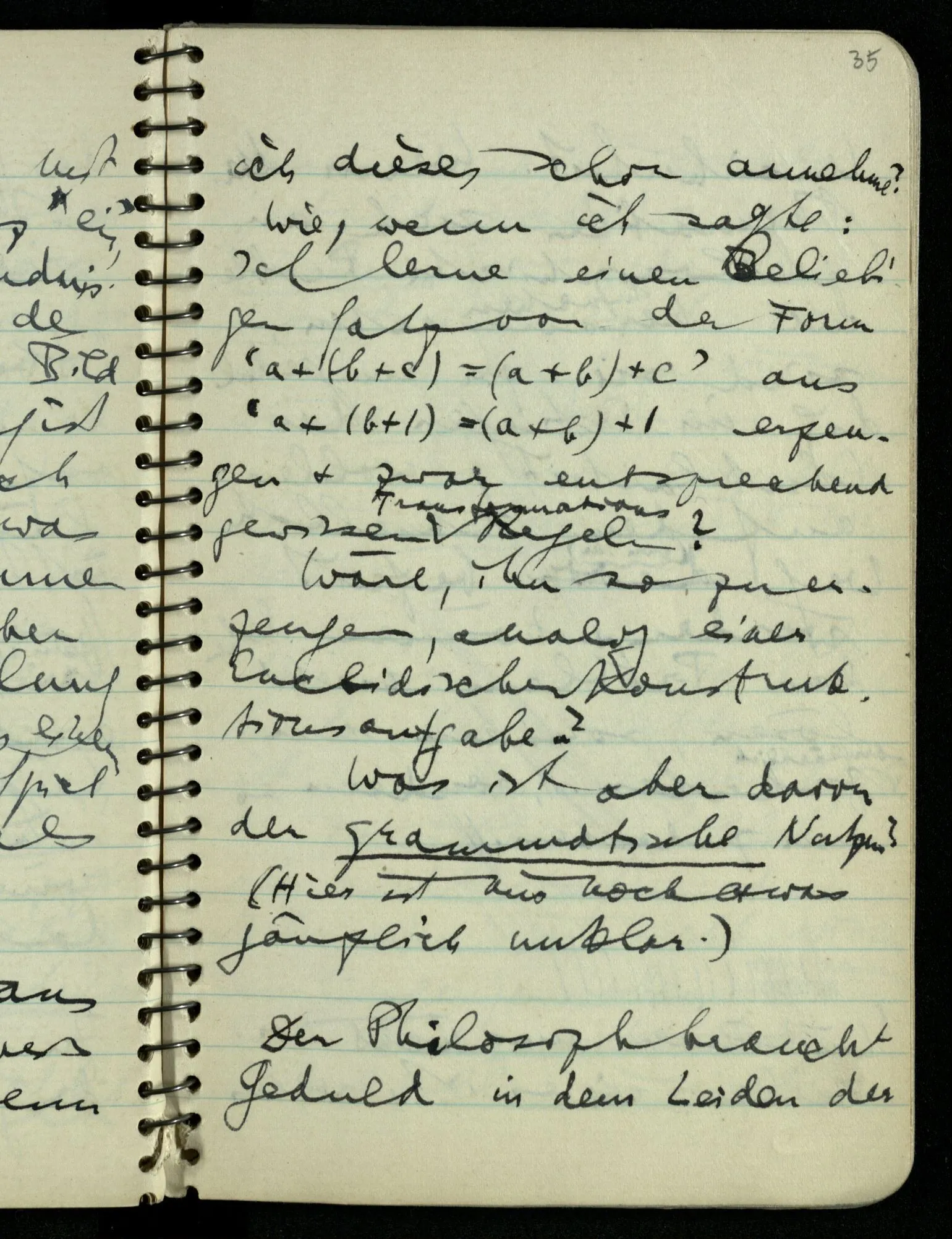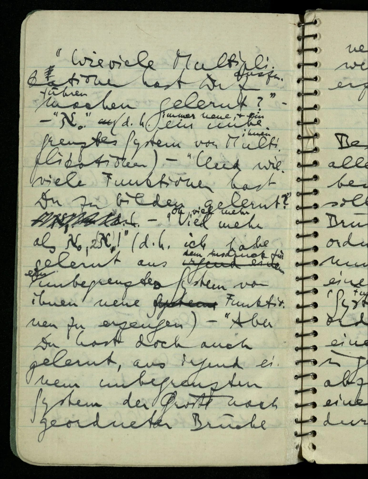 ‘Wir wollen unter keinen Umständen von einer Reihe aller Reihen sprechen.’ ‘Wir wollen unter keinen Umständen von einer Kiste sagen, sie enthielte alle Kisten.’ “Wieviele Multiplikationen hast Du zu machen gelernt?” – – (d.h. ein unbegrenztes System von Multiplikationen). – “Und wieviele Funktionen hast Du zu bilden gelernt?” – “Viel mehr als !” (d.h. ich habe gelernt, aus dem Ausdruck für ein unbegrenztes System von ihnen, neue Funktionen zu erzeugen). – “Aber Du hast doch auch gelernt, aus irgend einem unbegrenzten System der Größe nach geordneter Brüche weitere solche Systeme zu erzeugen.”