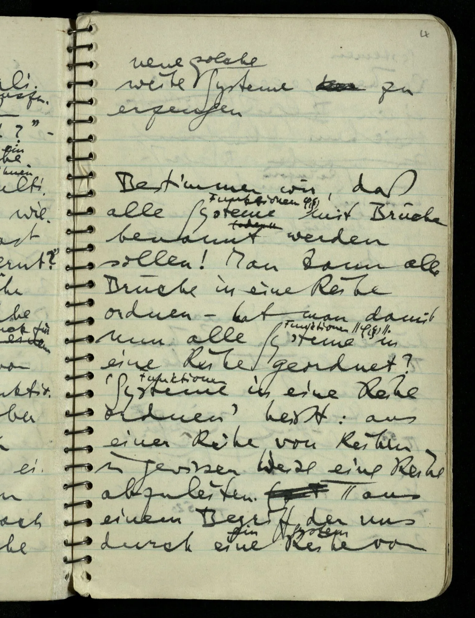 Bestimmen wir, daß alle Systeme mit Brüchen benannt werden sollen! Man kann alle Brüche in eine Reihe ordnen – hat man damit nun alle Systeme in eine Reihe geordnet? ‘Systeme in eine Reihe ordnen’ heißt: aus einer Reihe von Reihen in gewisser Weise eine Reihe abzuleiten.