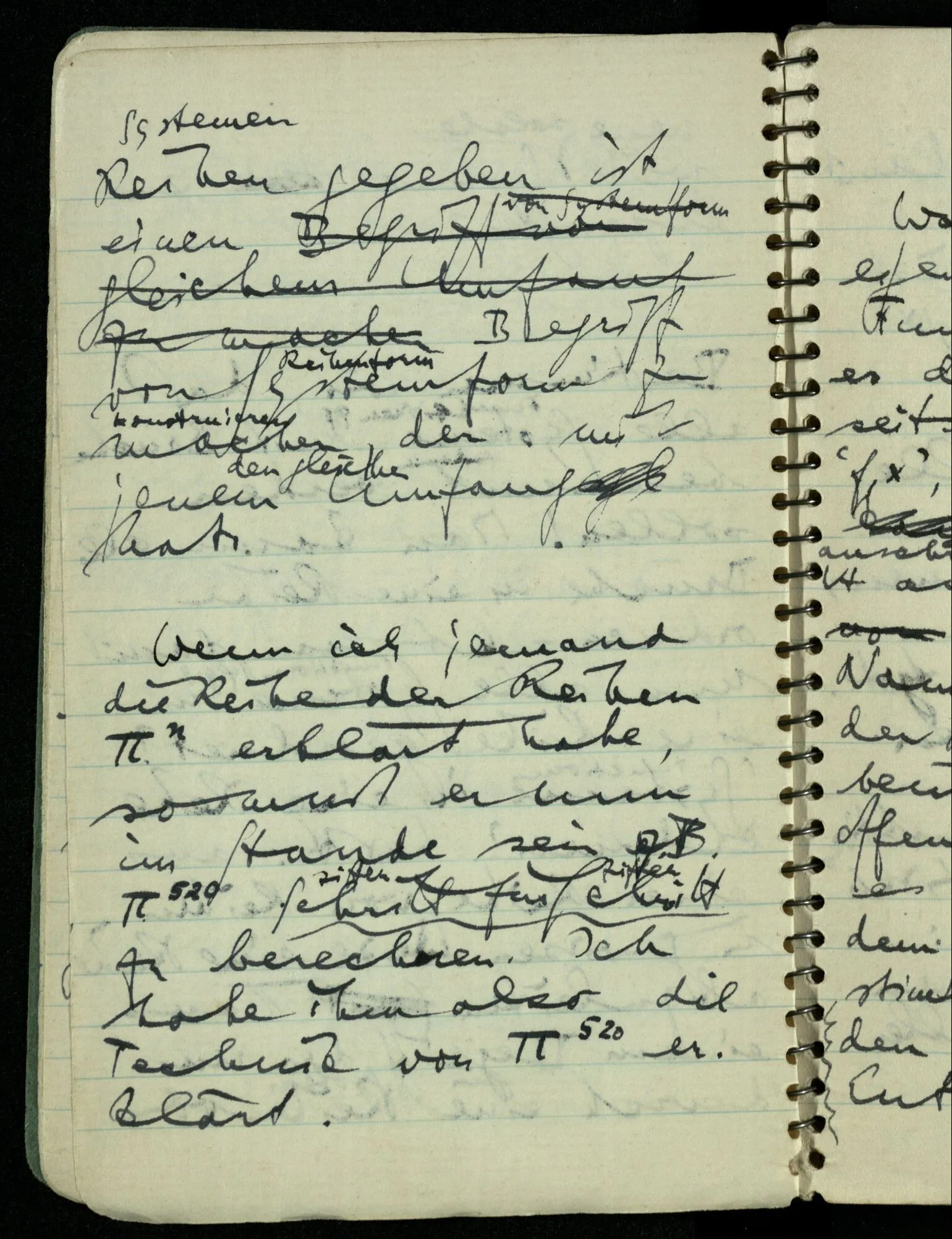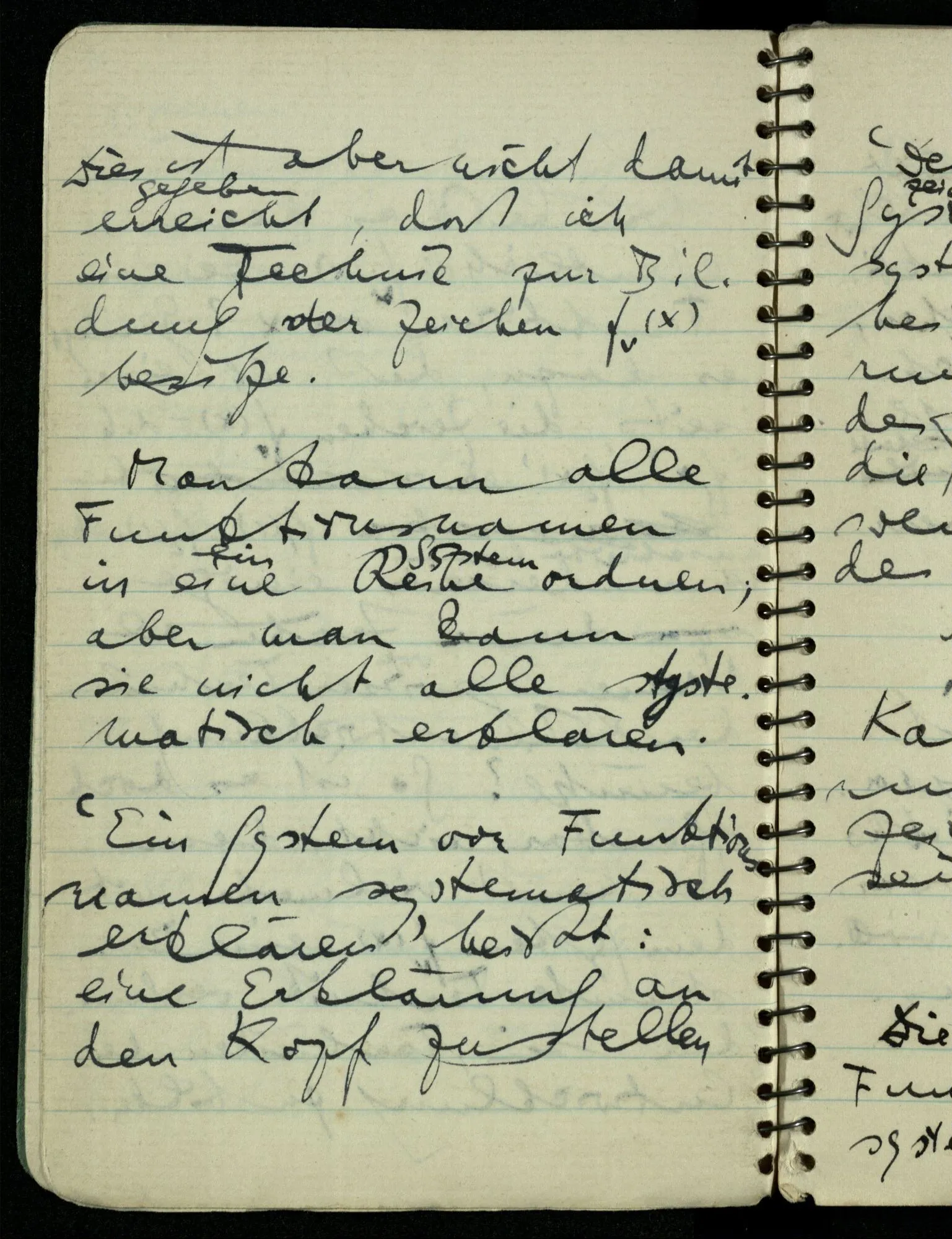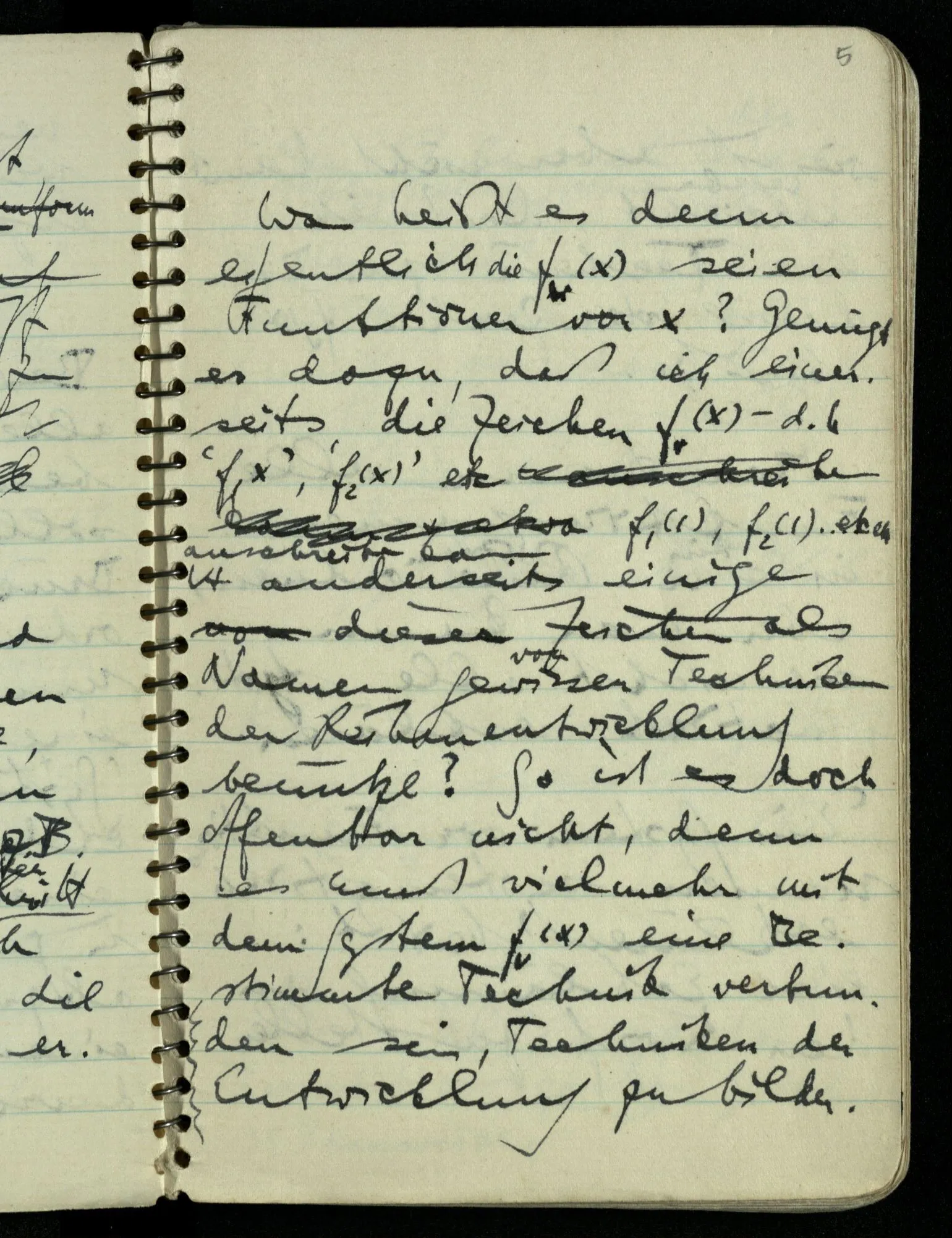 Was heißt es denn eigentlich die seien Funktionen von x? Genügt es dazu, daß ich einerseits die Zeichen – d.h. ‘’, ‘’ etc. etc. , etc. etc. anschreiben kann & anderseits einige dieser Zeichen als Namen gewisser Techniken der Reihenentwicklung benütze? So ist es doch offenbar nicht, denn es muß vielmehr mit dem System eine bestimmte Technik verbunden sein, Techniken der Entwicklung zu bilden. Dies ist aber nicht damit erreicht, daß ich eine Technik zur Bildung der Zeichen besitze.
