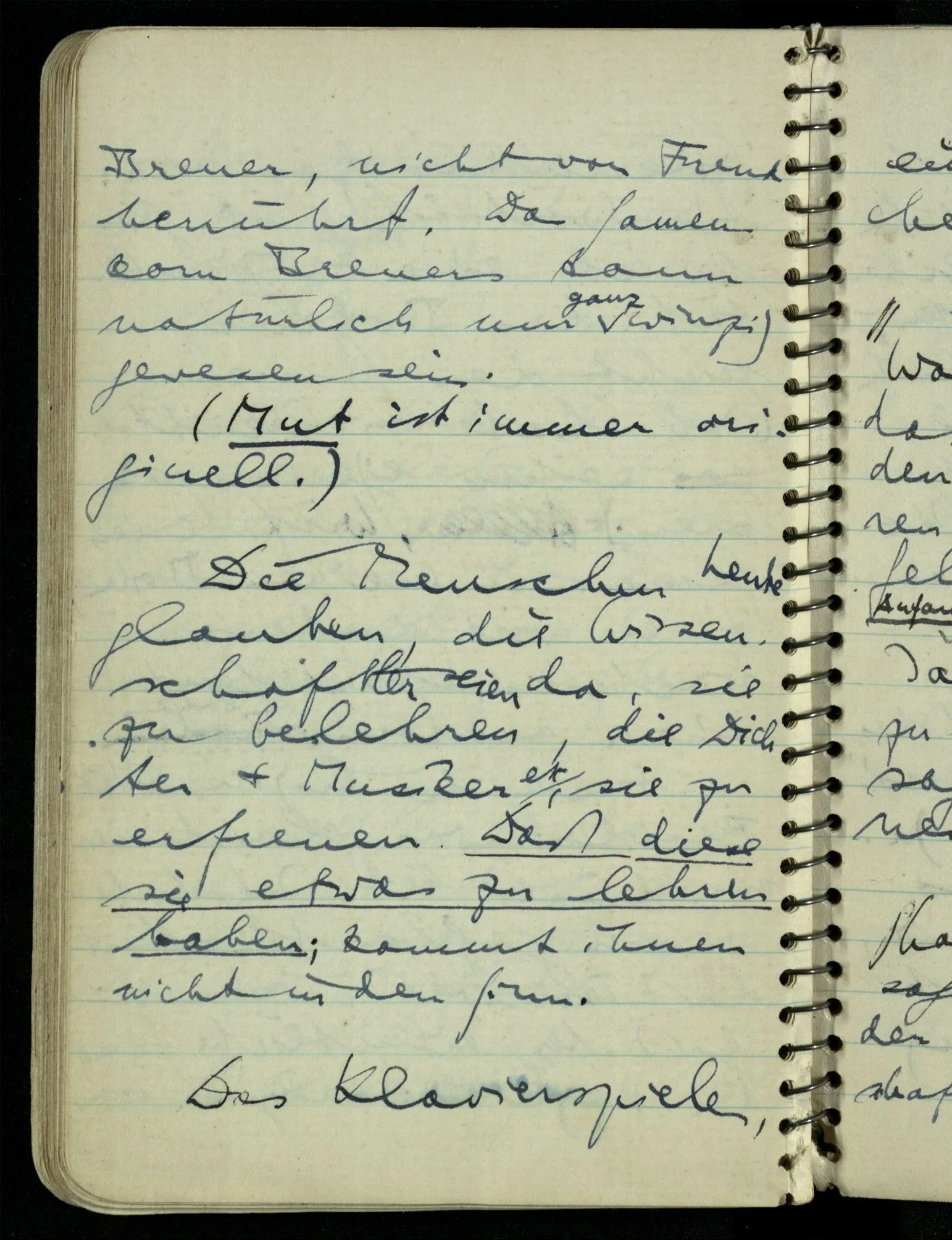 Die Menschen heute glauben, die Wissenschaftler seien da, sie zu belehren, die Dichter & Musiker etc., sie zu erfreuen. Daß diese sie etwas zu lehren haben; kommt ihnen nicht in dem Sinn.