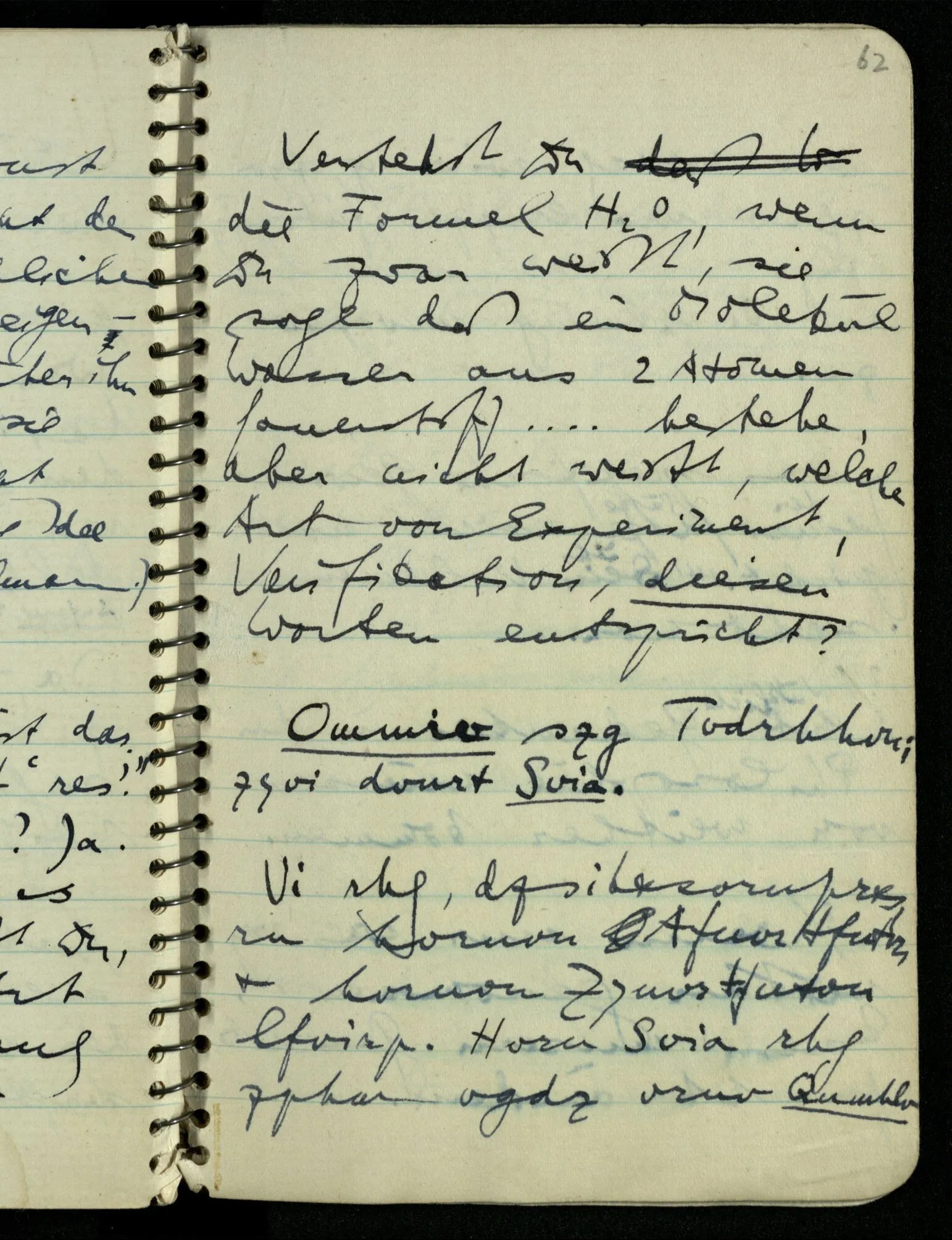 “Das Wort ‘rien’ ist dasselbe wie das Wort ‘res’.” Verstehst Du das? Ja. Aber verstehst Du es auch gewiß? Weißt Du, genau welche Art von Zusammenhang hier gemeint ist? Verstehst Du die Formel , wenn Du zwar weißt, sie sage daß ein Molekül Wasser aus 2 Atomen Sauerstoff … bestehe, aber nicht weißt, welche Art von Experiment, Verifikation, diesen Worten entspricht?