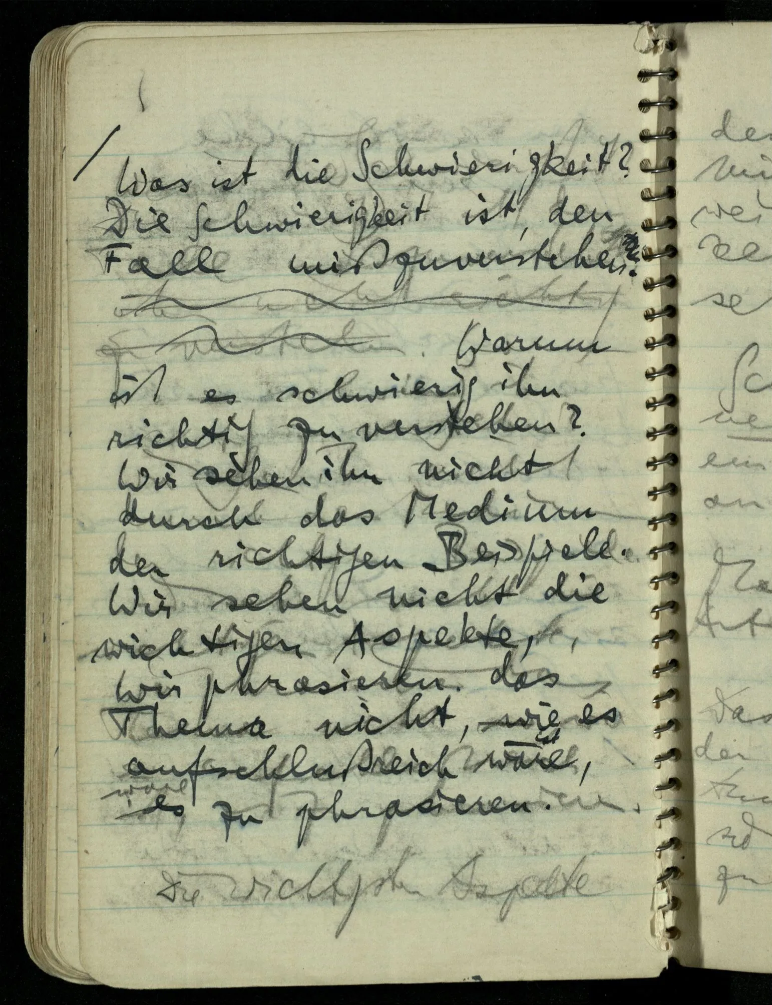 Was ist die Schwierigkeit? Die Schwierigkeit ist, den Fall mißzuverstehen. Warum ist es schwierig ihn richtig zu verstehen? Wir sehen ihn nicht durch das Medium der richtigen Beispiele. Wir sehen nicht die wichtigen Aspekte. Wir phrasieren das Thema nicht, wie es aufschlußreich wäre, es zu phrasieren.