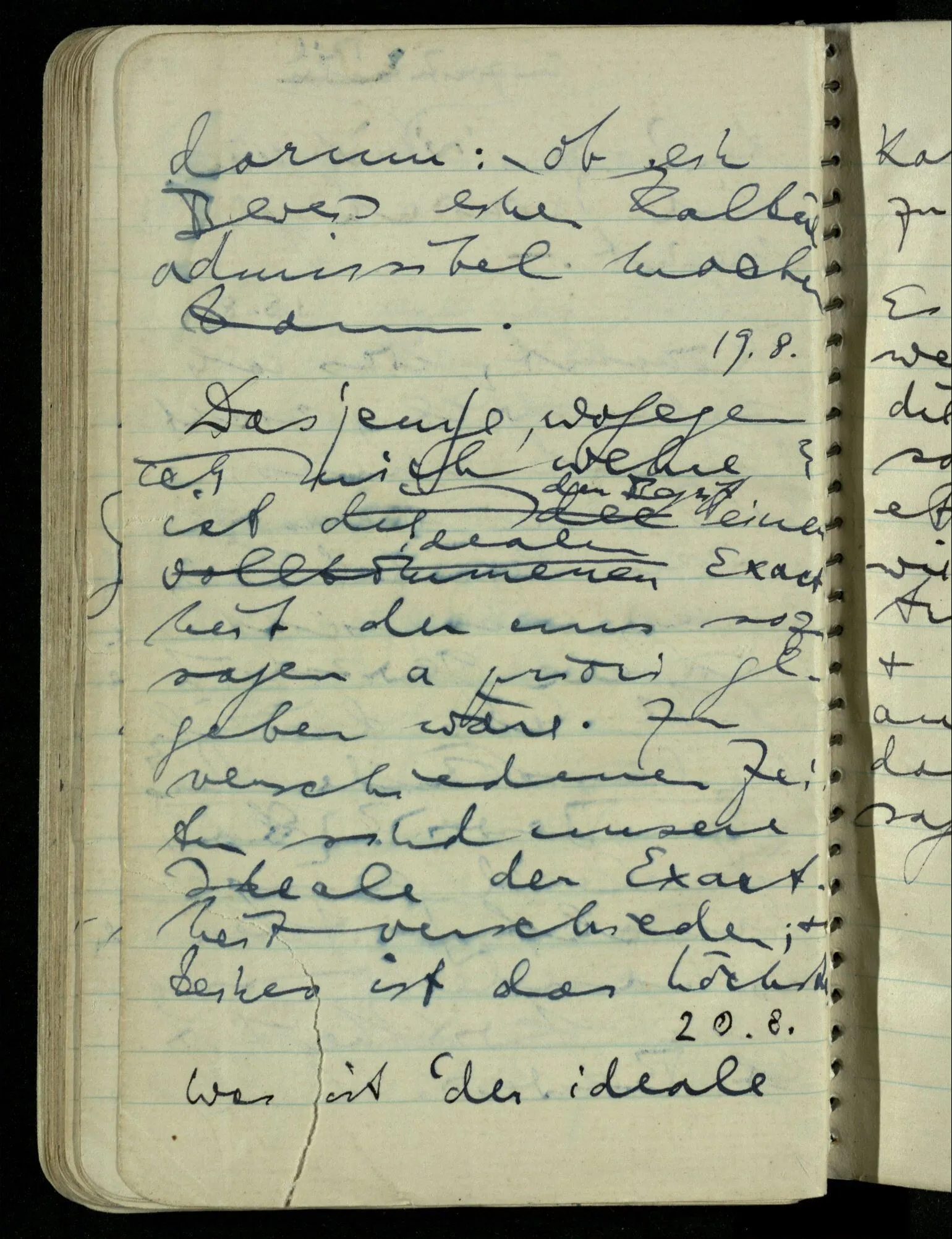 19.08.1940 Dasjenige, wogegen ich mich wehre, ist der Begriff einer idealen Exaktheit der uns sozusagen a priori gegeben wäre. Zu verschiedenen Zeiten sind unsere Ideale der Exaktheit verschieden; & keines ist das höchste.