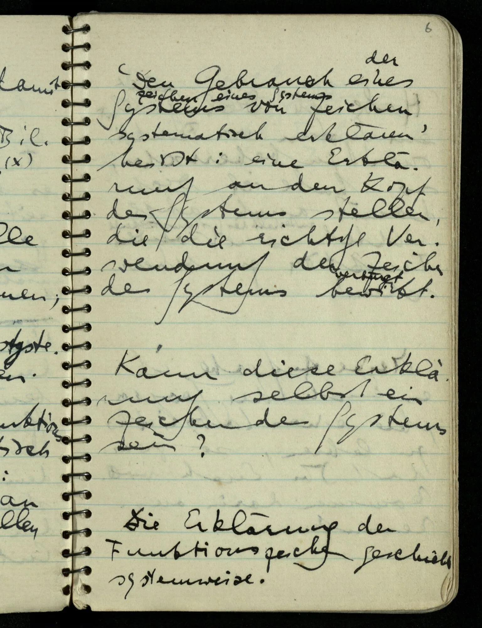 ‘Den Gebrauch eines Systems von Zeichen systematisch erklären’ heißt: eine Erklärung an den Kopf des Systems stellen, die die richtige Verwendung der Zeichen des Systems bewirkt.