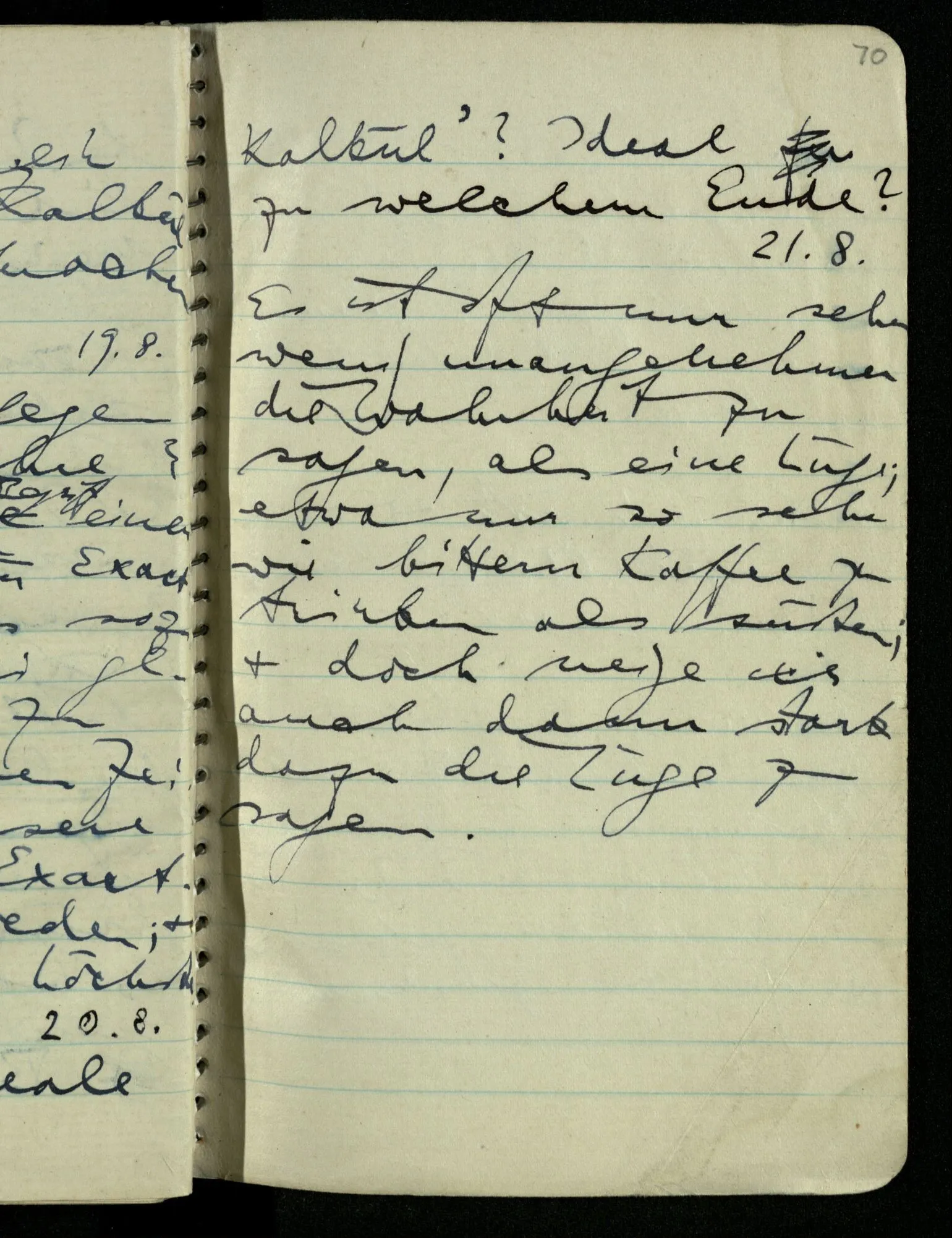 21.08.1940 Es ist oft nur sehr wenig unangenehmer die Wahrheit zu sagen, als eine Lüge; etwa nur so sehr wie bittern Kaffee zu trinken als süßen; & doch neige ich auch dann stark dazu, die Lüge zu sagen.
