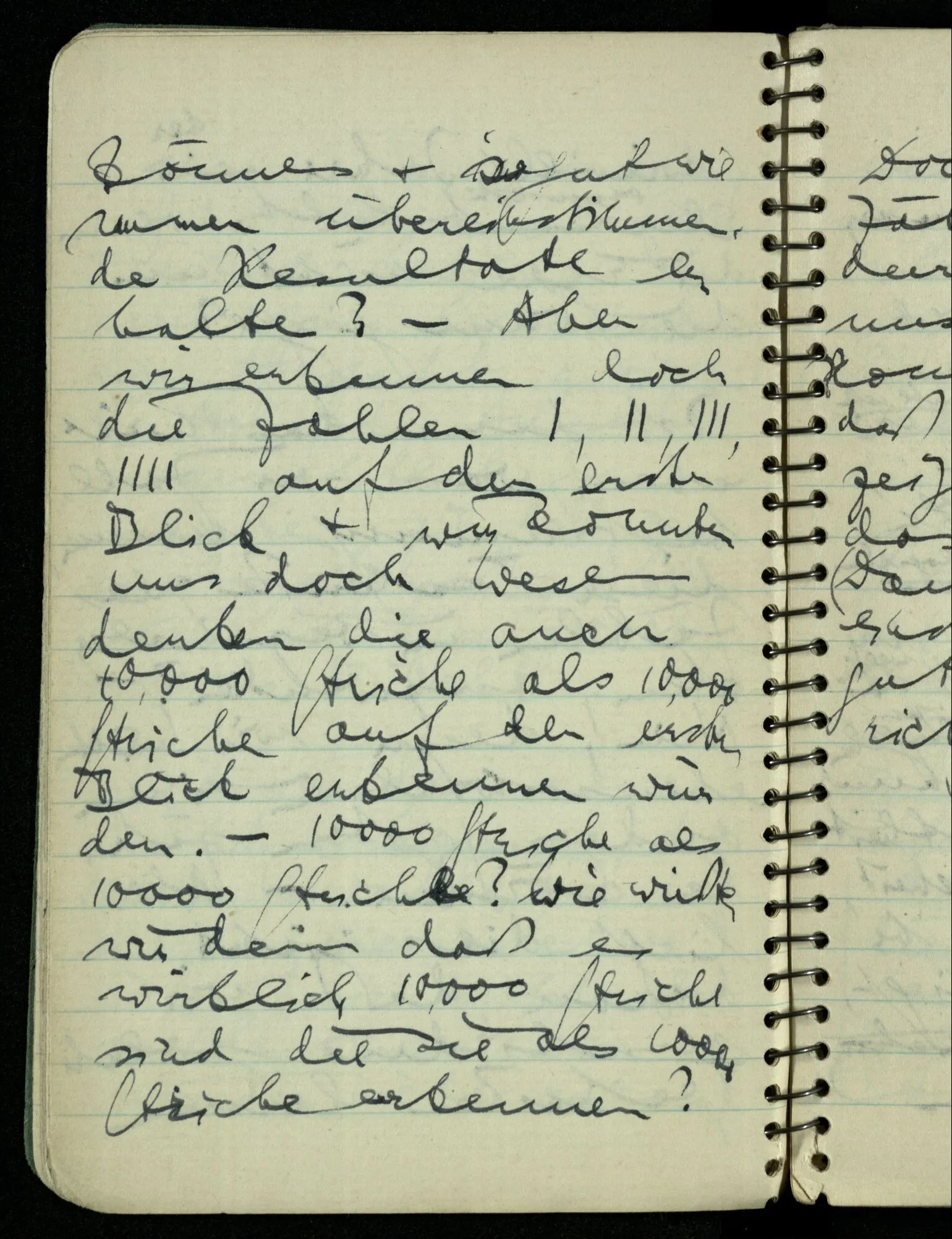 Ist denn das nicht eben, was wir Zahlbestimmung nennen, diese Technik, das Zählen im Dezimalsystem anzuwenden? – Nein; denn wir hätten ebensowohl in einem andern System zählen können. – Aber liegt dies nicht daran, daß wir verschiedene solche Techniken lernen können & so gut wie immer übereinstimmende Resultate erhalten? – Aber wir erkennen doch die Zahlen ∣, ∣∣, ∣∣∣, ∣∣∣∣ auf den ersten Blick & wir könnten uns doch Wesen denken, die auch 10.000 Striche als 10.000 Striche auf den ersten Blick erkennen würden. – 10.000 Striche als 10.000 Striche? Wie wüßten wir denn, daß es wirklich 10.000 Striche sind die sie als 10.000 Striche erkennen? Doch nur durch eine von unseren Zählmethoden. Also durch die Übereinstimmung unsrer Resultate. Aber kann man denn sagen, daß diese Übereinstimmung zeige, daß jene Leute das Richtige erkennen. (Dann könnte die Übereinstimmung ja ebensogut zeigen, daß wir richtig zählen!)