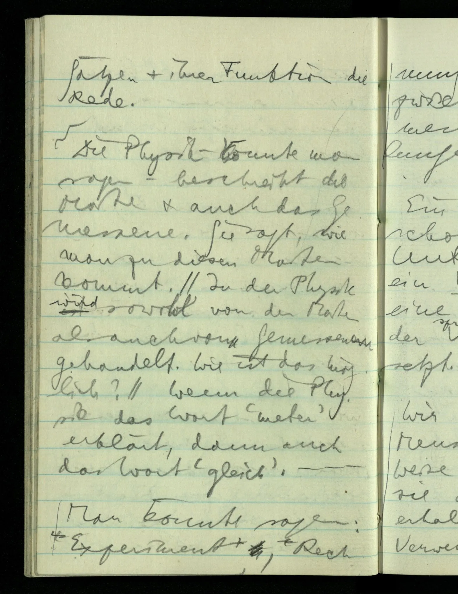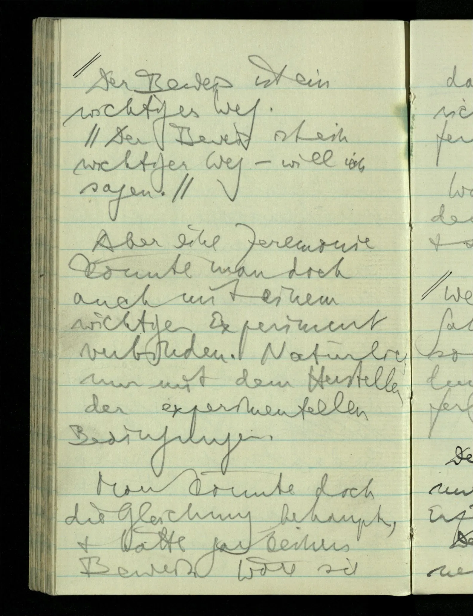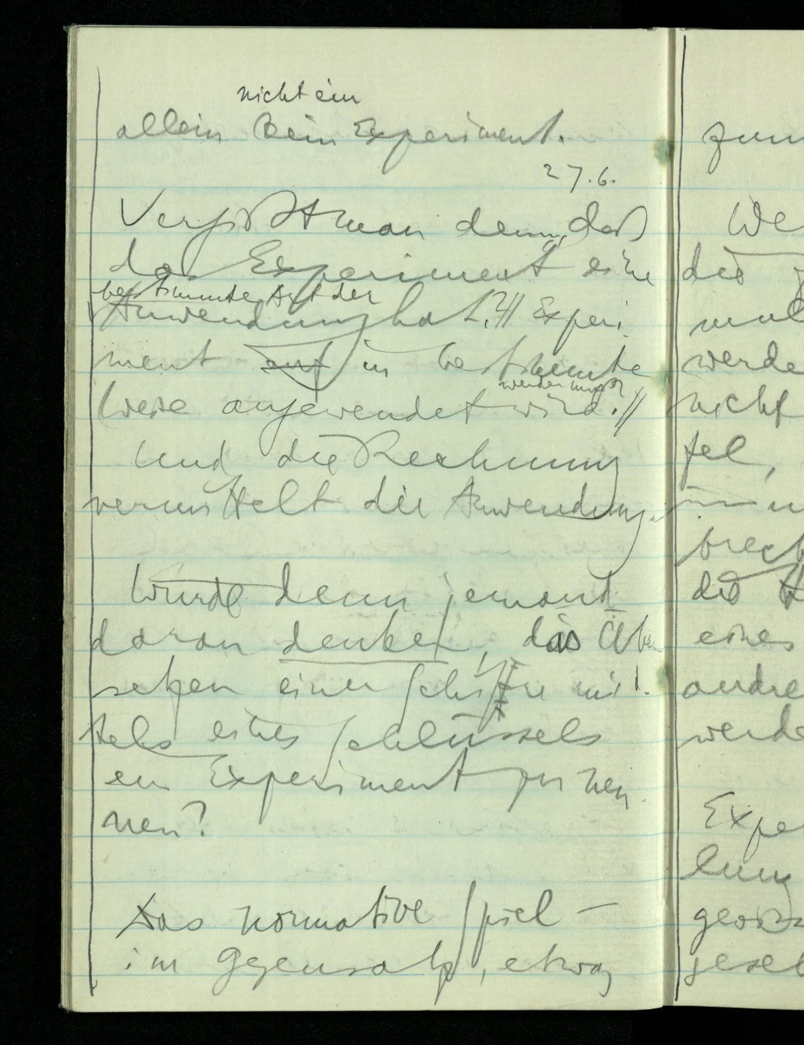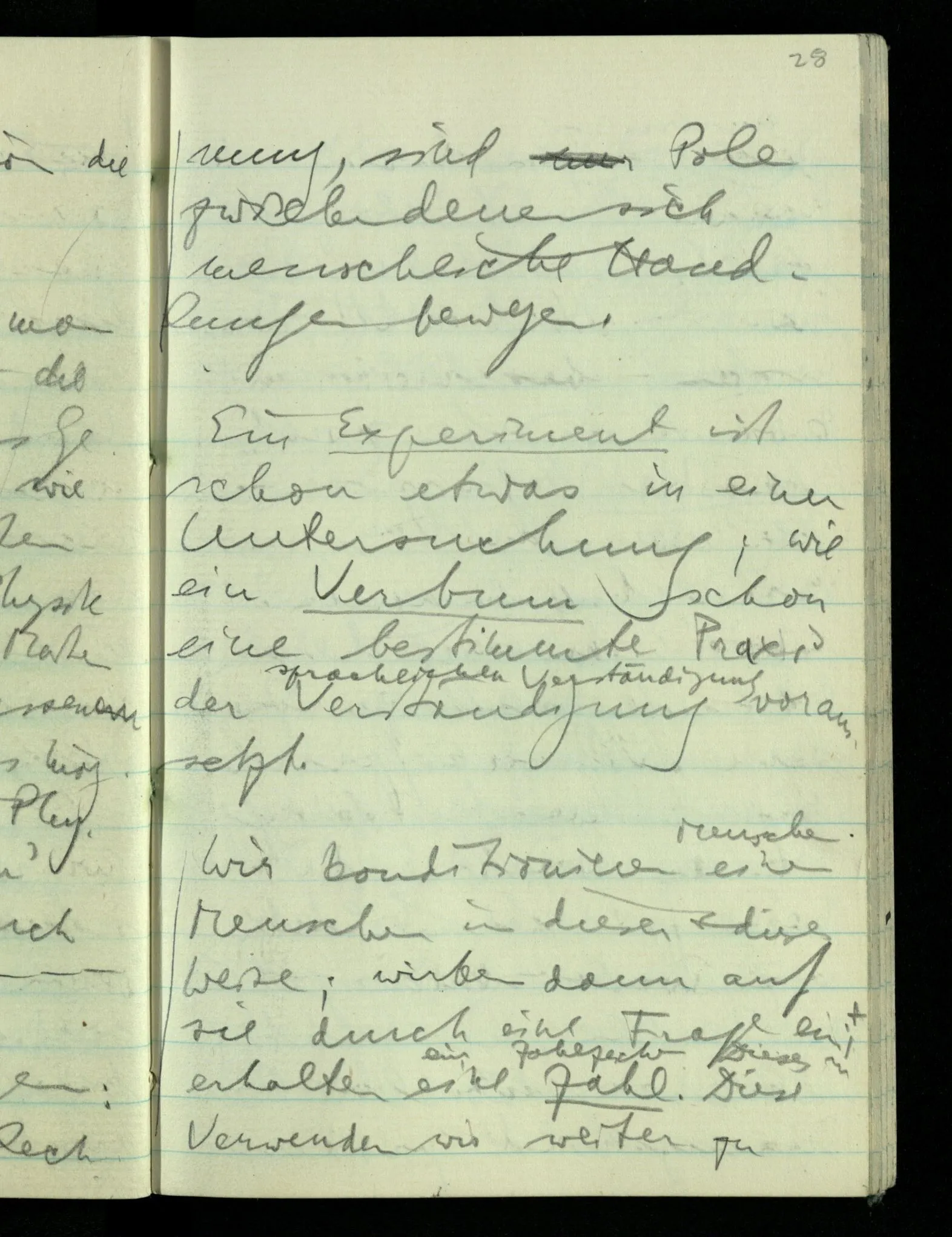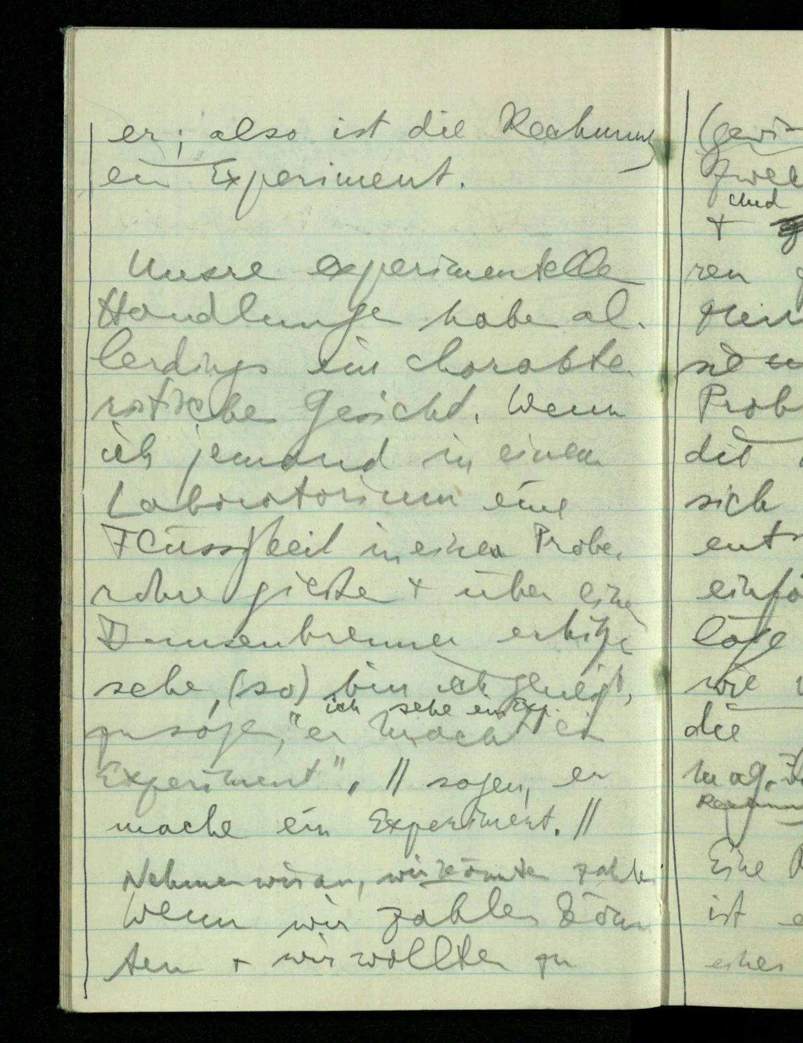 Unsre experimentellen Handlungen haben allerdings ein charakteristisches Gesicht. Wenn ich jemand in einem Laboratorium eine Flüssigkeit in eine Proberöhre gießen & über einem Bunsenbrenner erhitzen sehe, (so) bin ich geneigt, zu sagen, “er macht ein Experiment”.