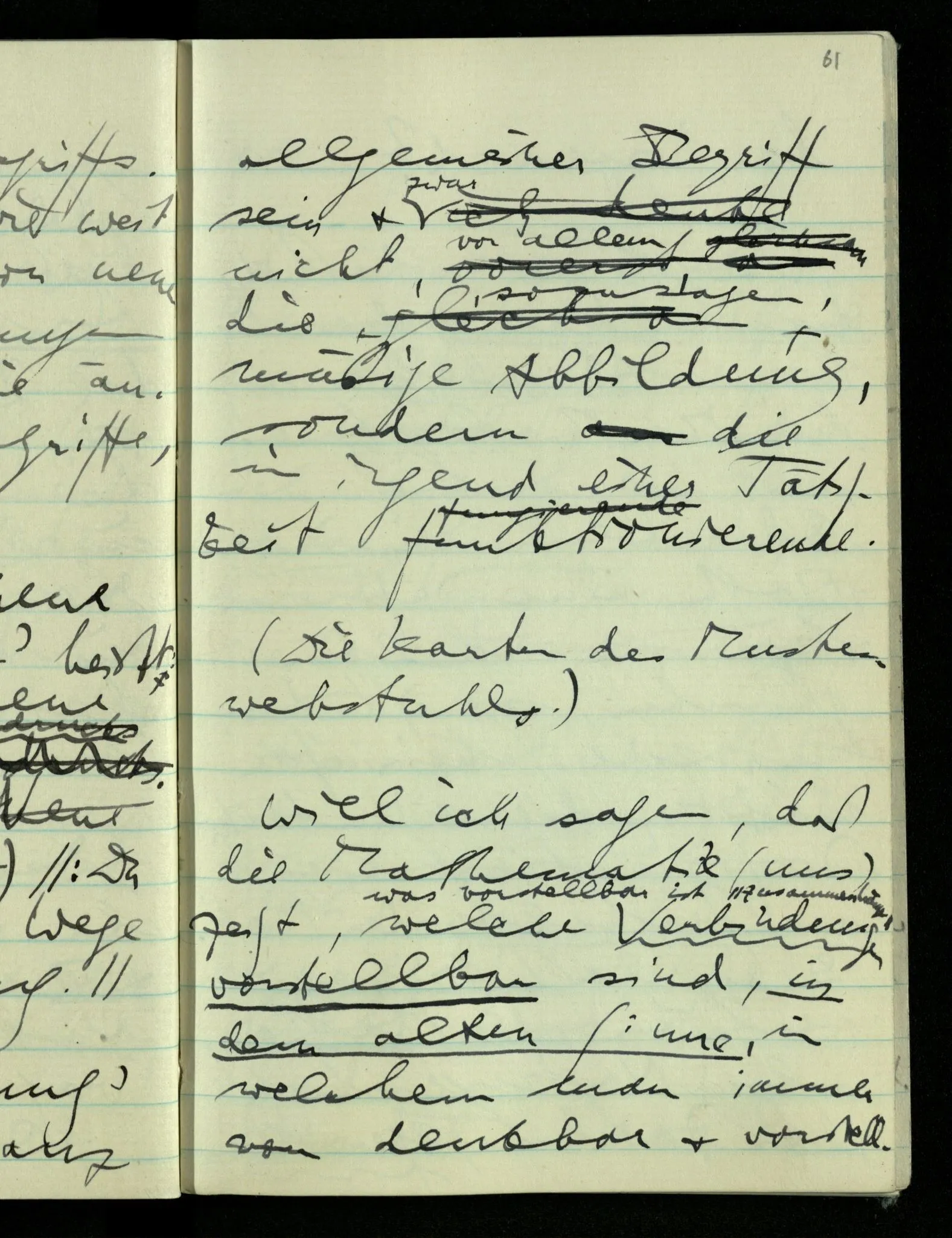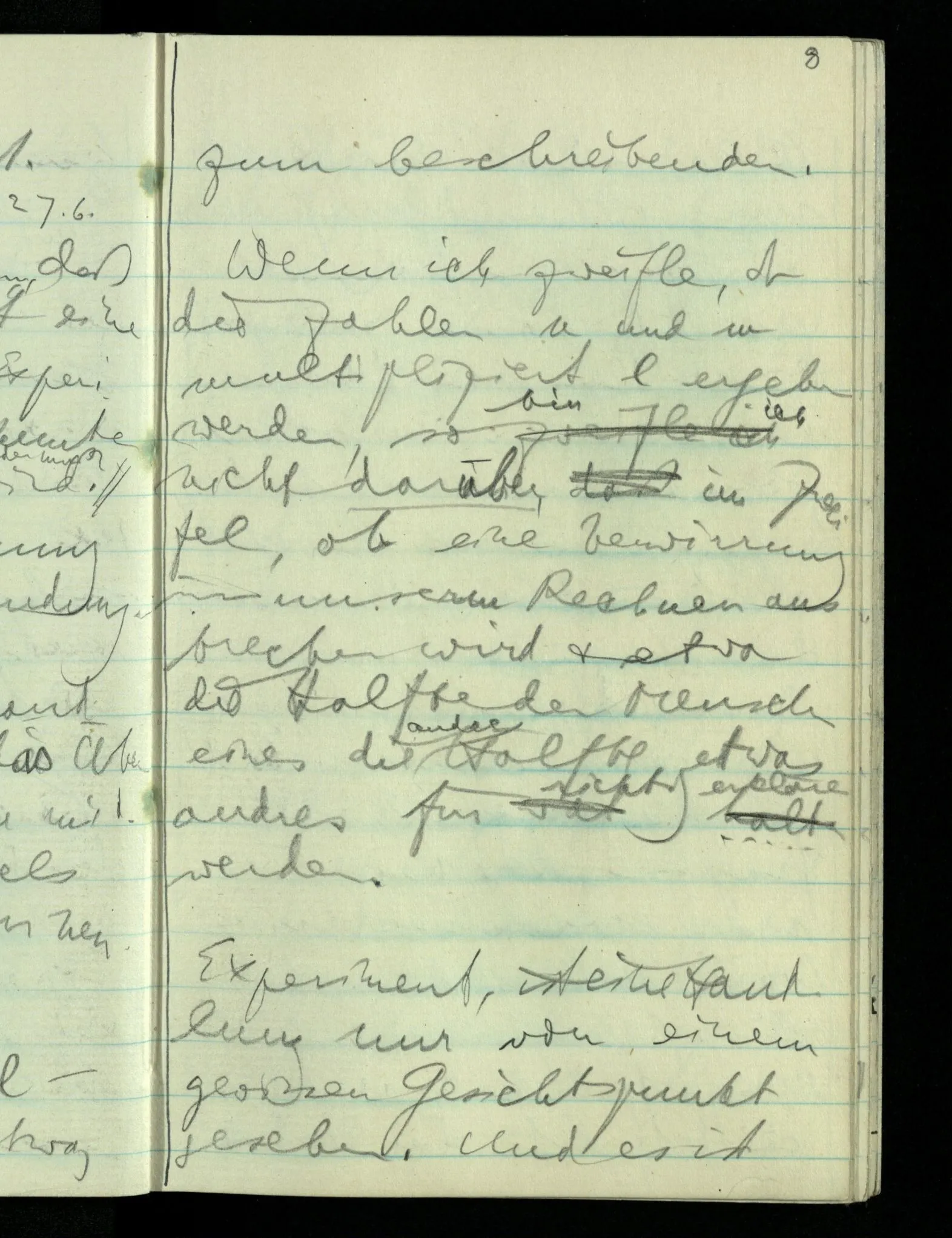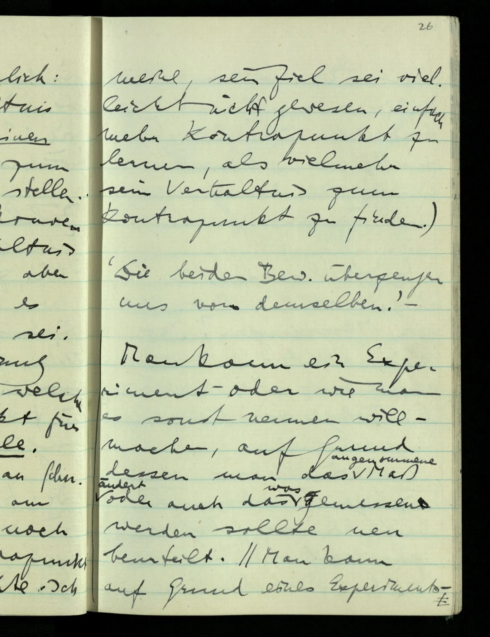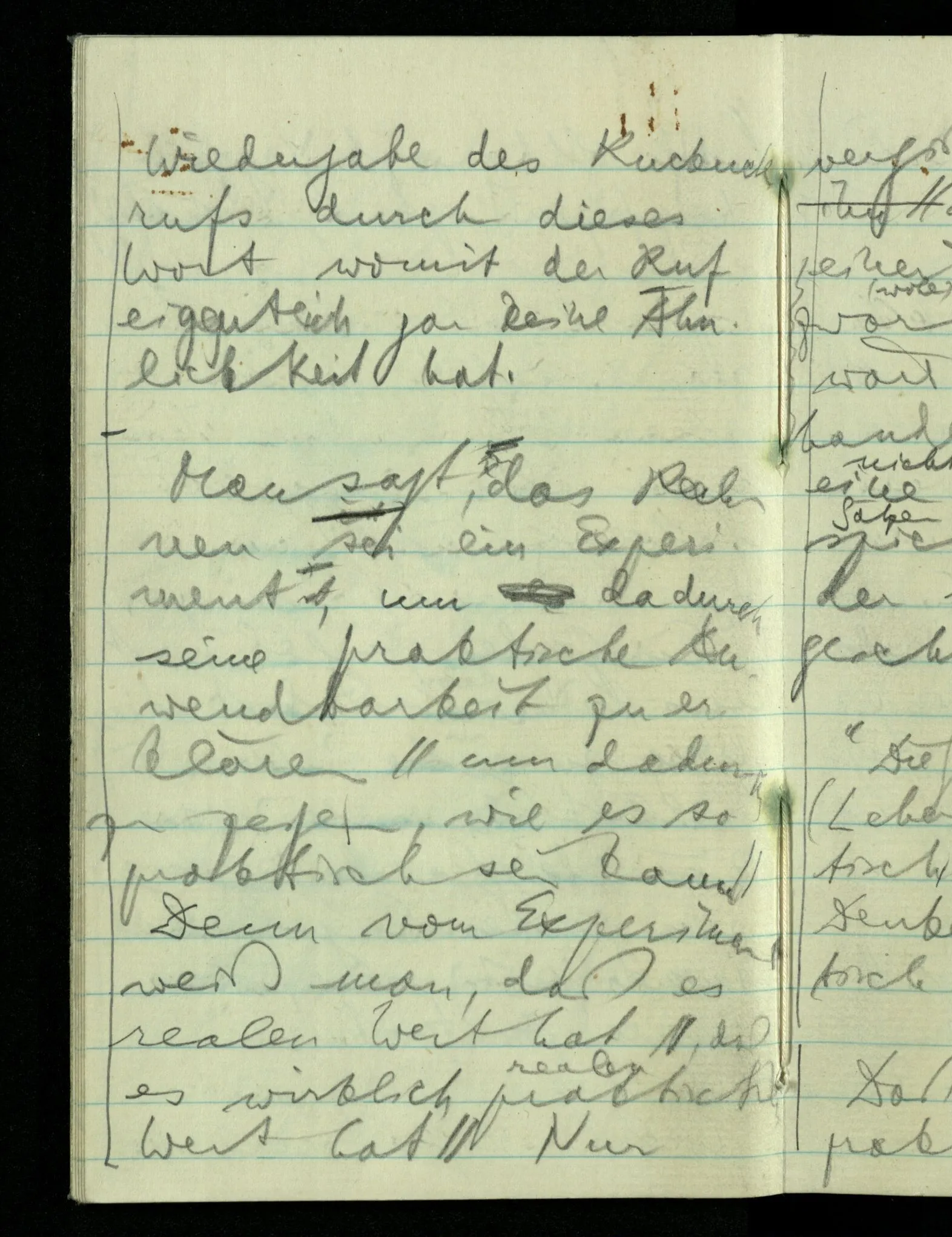 Unsre experimentellen Handlungen haben allerdings ein charakteristisches Gesicht. Wenn ich jemand in einem Laboratorium eine Flüssigkeit in eine Proberöhre gießen & über einem Bunsenbrenner erhitzen sehe, (so) bin ich geneigt, zu sagen, “er macht ein Experiment”.