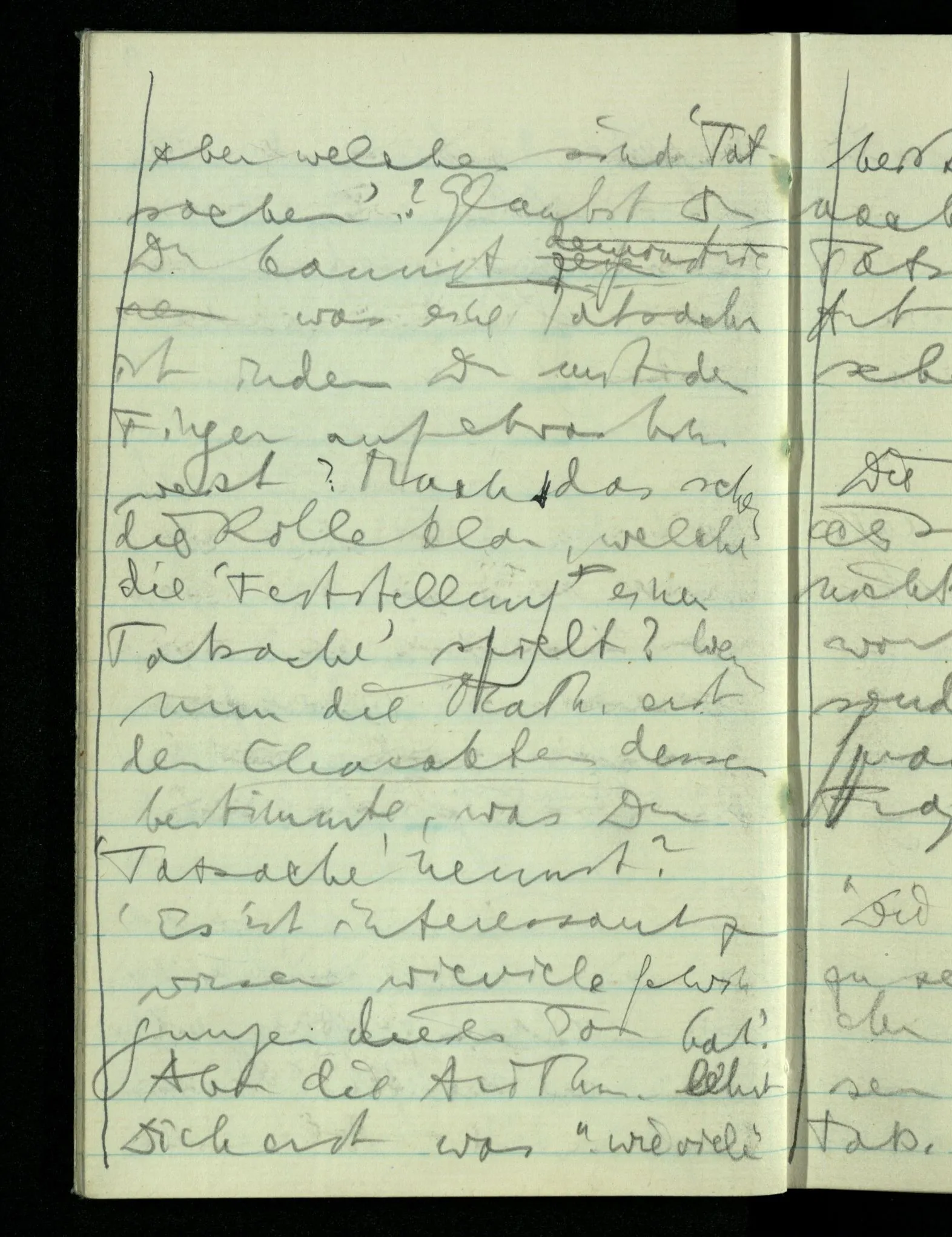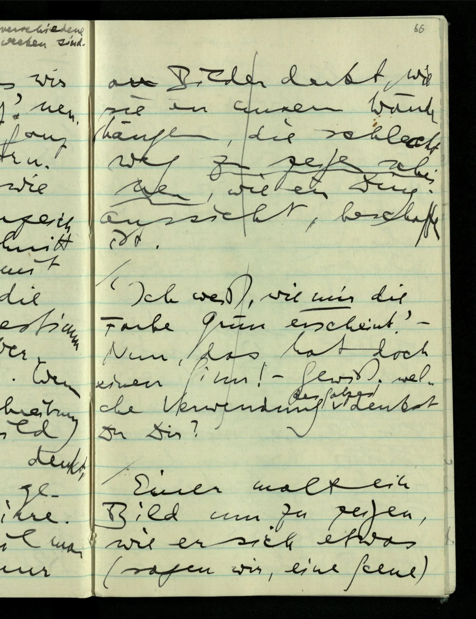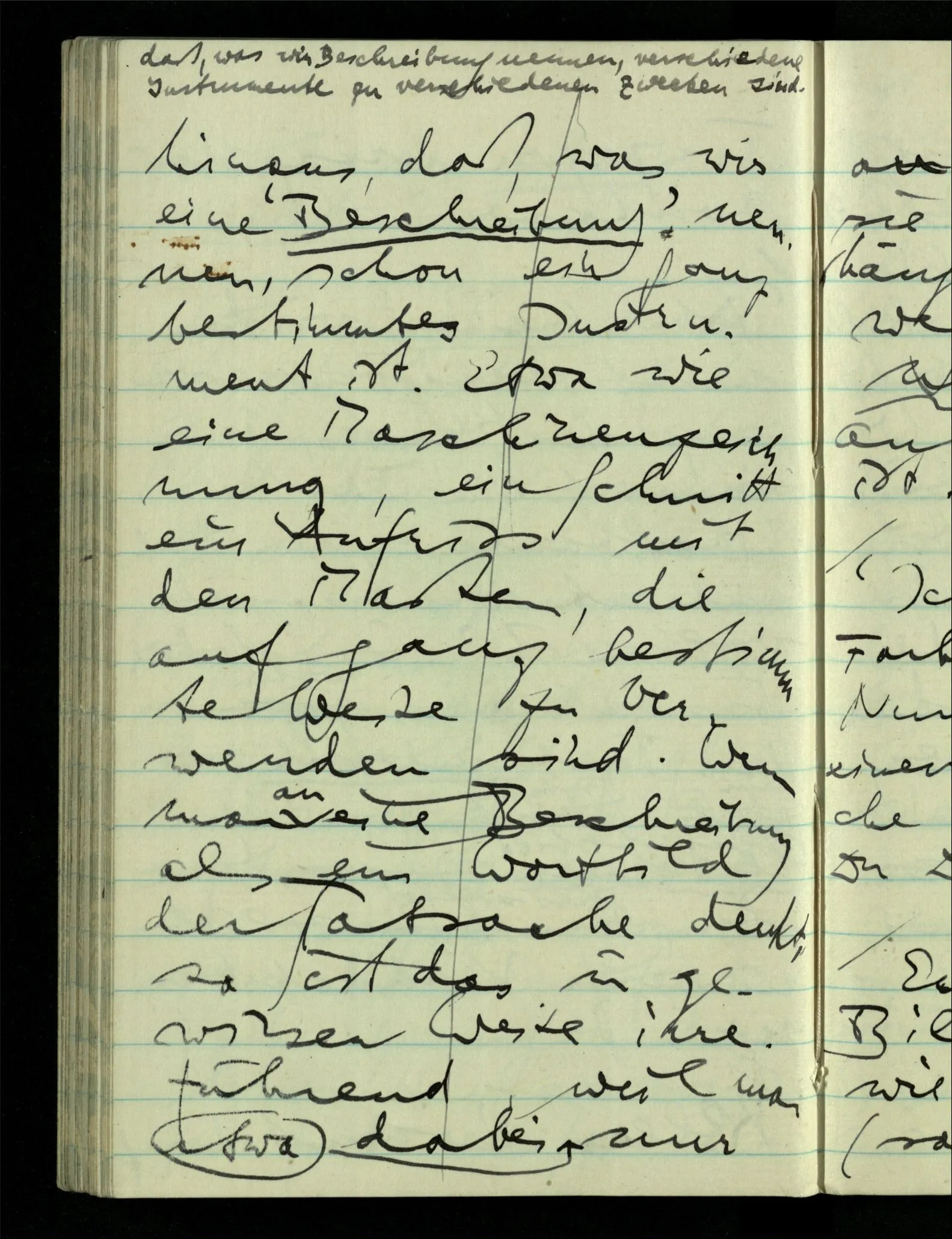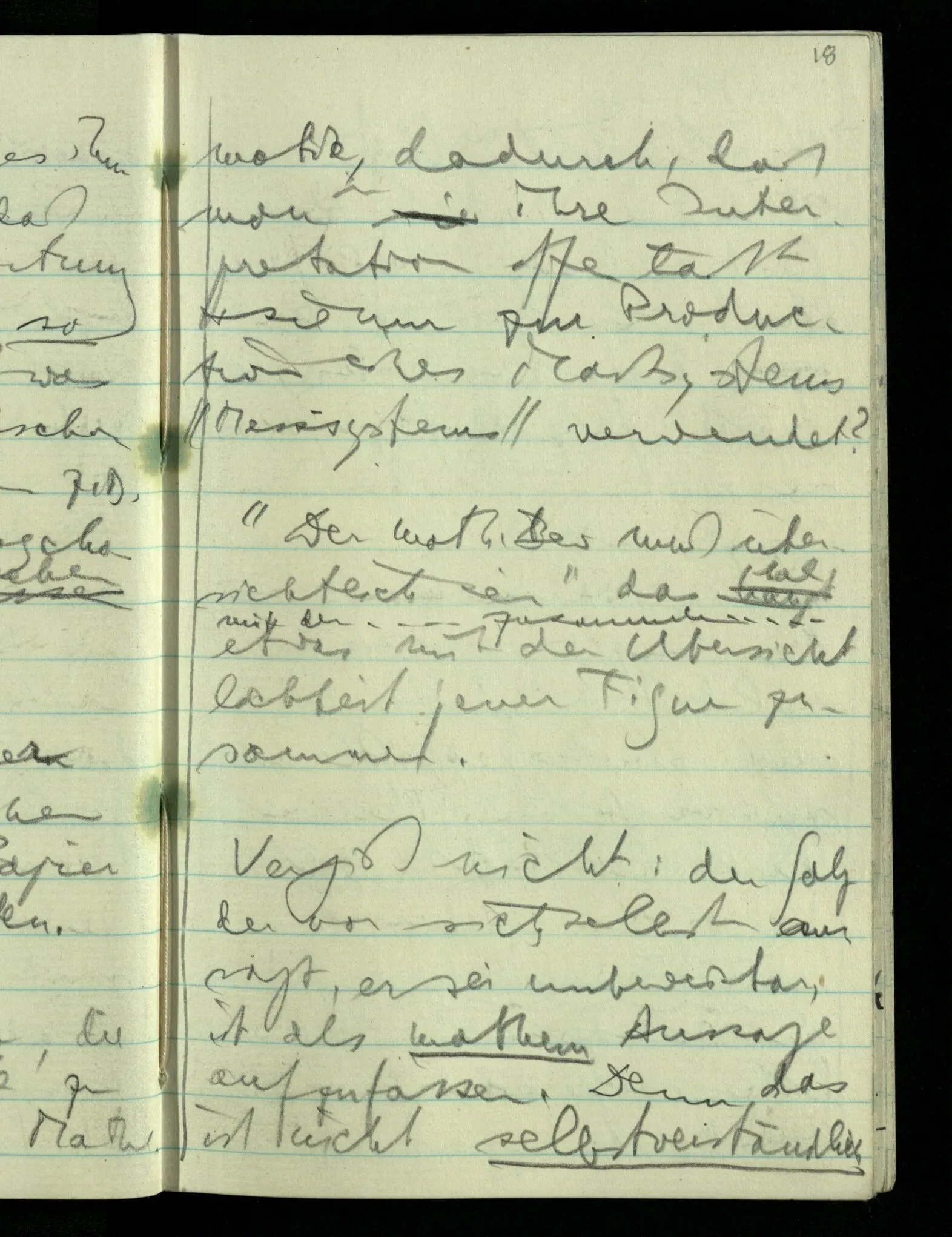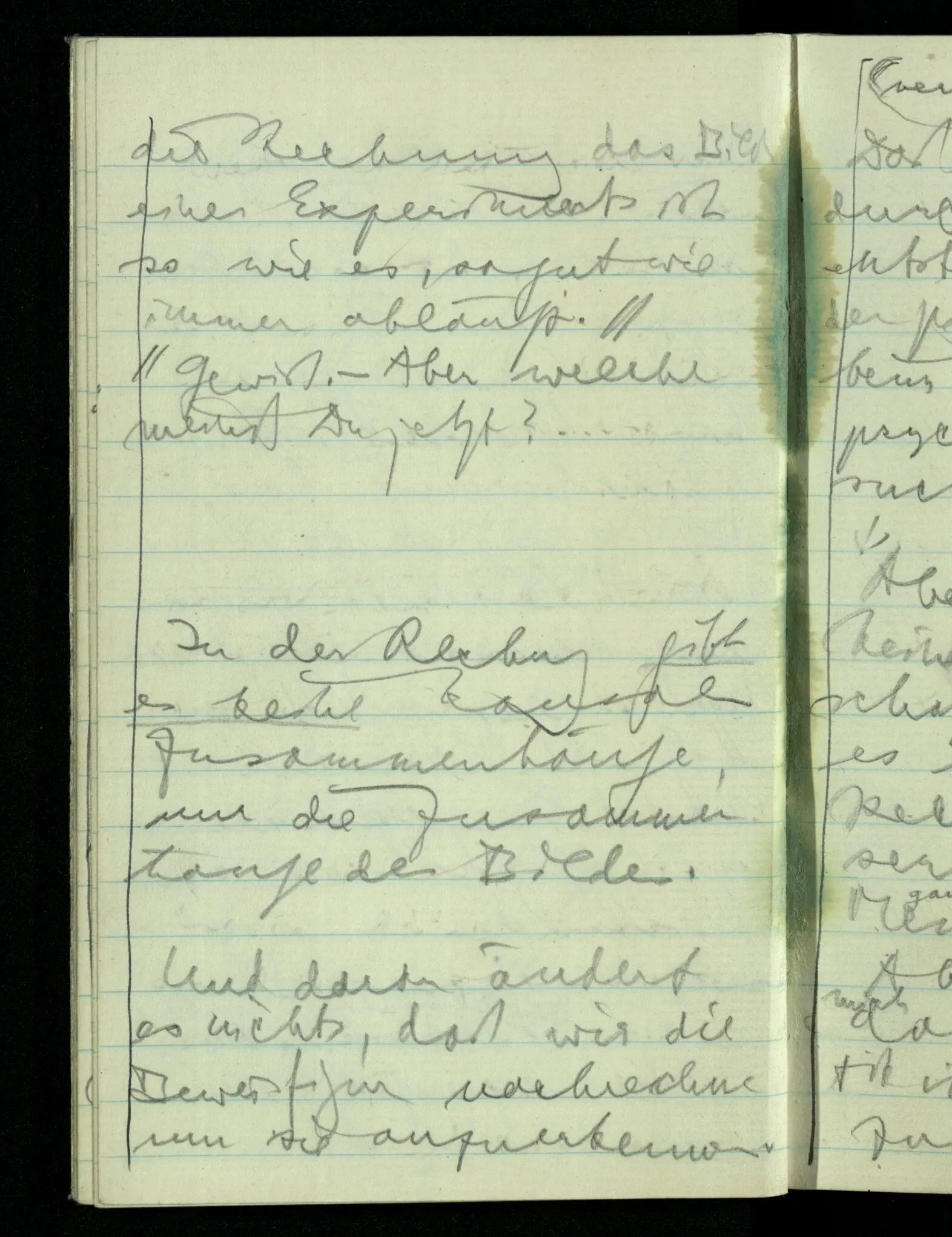 Unsre experimentellen Handlungen haben allerdings ein charakteristisches Gesicht. Wenn ich jemand in einem Laboratorium eine Flüssigkeit in eine Proberöhre gießen & über einem Bunsenbrenner erhitzen sehe, (so) bin ich geneigt, zu sagen, “er macht ein Experiment”.