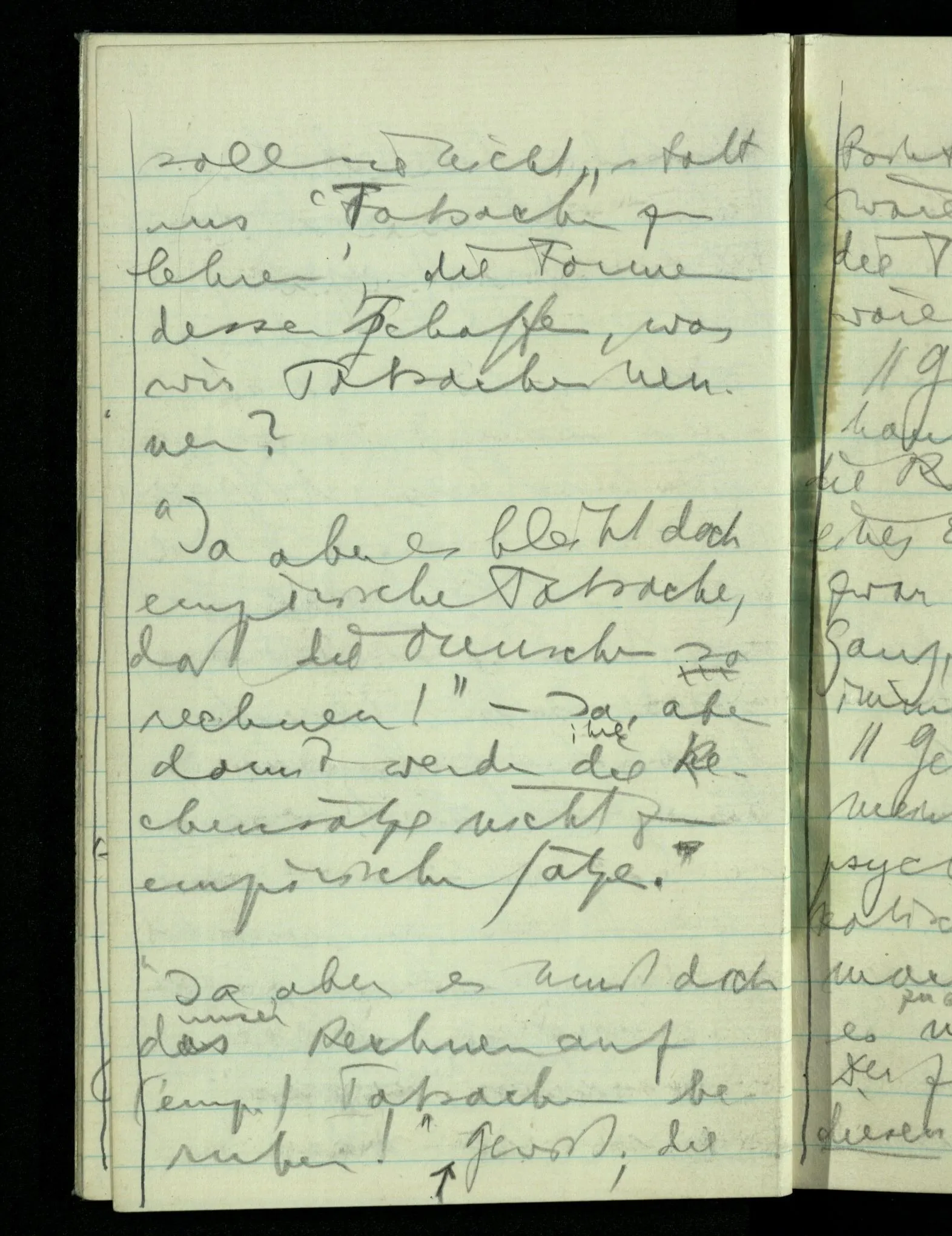 “Ja, aber es muß doch das Rechnen auf (empirischen) Tatsachen beruhen!” Gewiß; die Pointe des Rechnens wäre eine andere wenn die Tatsachen andere wären – – –